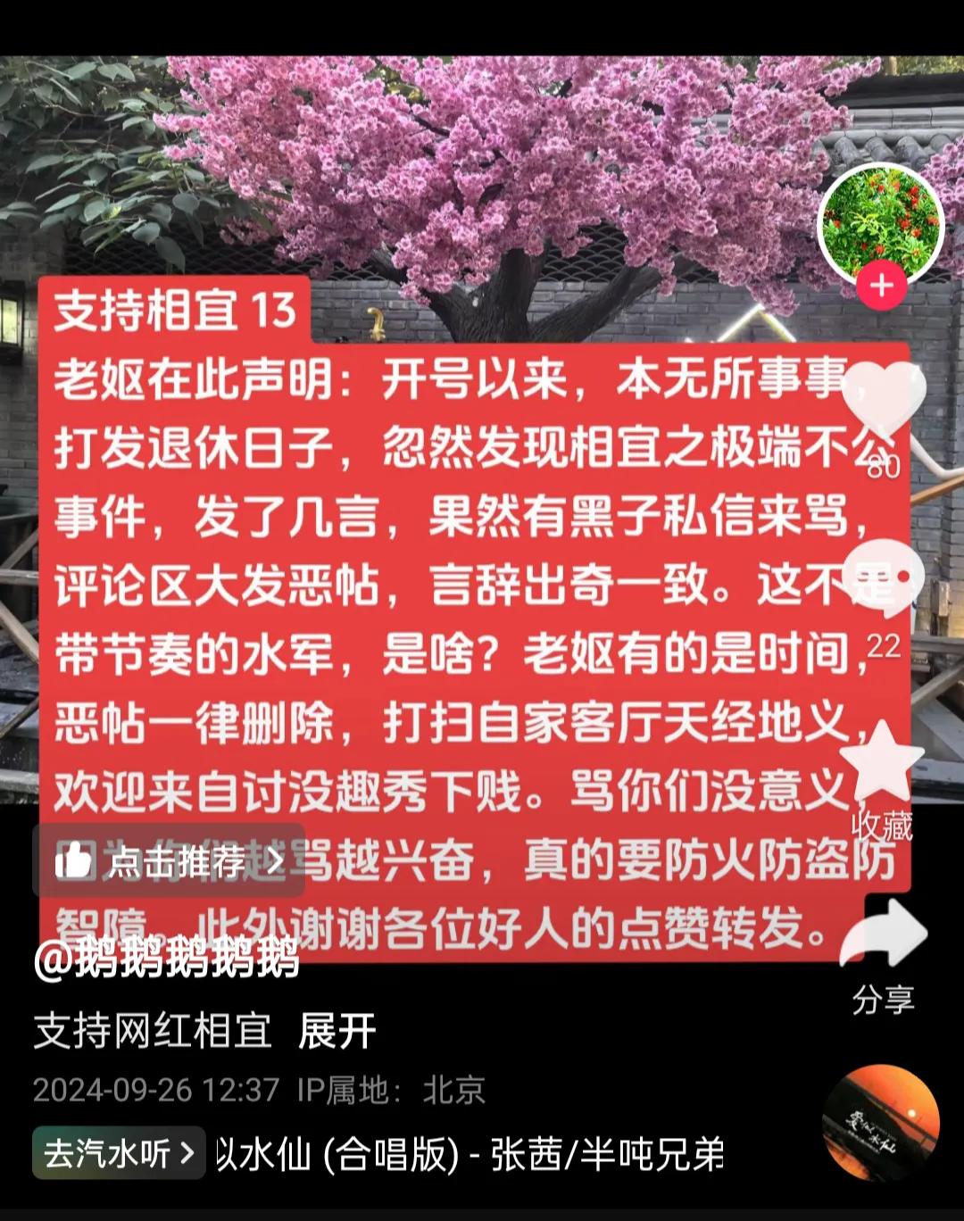 以后别再说我这个账号怎么老是发相宜博士了。首先,我这个账号,一直在更新普法内容,并不全是相宜博士。其次,随便打开抖音,全是相宜博士的营销号。不能说全网只能吹捧相宜博士的,不能有半丁点说她不好的吧?相宜博士是千万粉丝,有自己的团队,应该有一定的包容性。至于相宜博士为什么改用一些退休的老年人来给自己开账号营销,这群老年人极易受人唆使,不辨是非,无立场原则,他们又特别闲,内心又空虚,估计公关费又便宜,毕竟他们还拿着社会的养老金。 另外,也请相宜博士的那些公关团队,别再说什么要多买相宜博士的东西,气S黑粉,花得是你们自己的钱,买的劣质货是你们自己用,被割韭菜的人是你们,怎么会说气S黑粉呢。黑粉也无法会说,绿油油的,多好的韭菜[呲牙]
