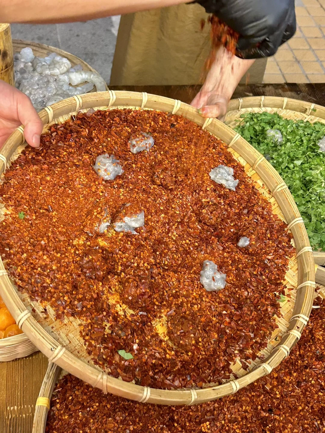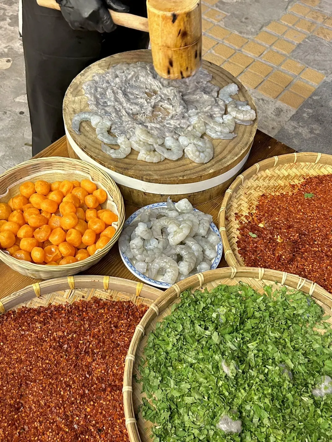 🦐三味虾滑 口味挺独特 🈶️麻辣味 香菜味和咸蛋黄口味的 师傅现场手打虾滑 顾客吃得放心 超大个头的虾仁 不愧是真材实料👍蛋黄包裹的虾仁🍤最好吃 一口就上头!