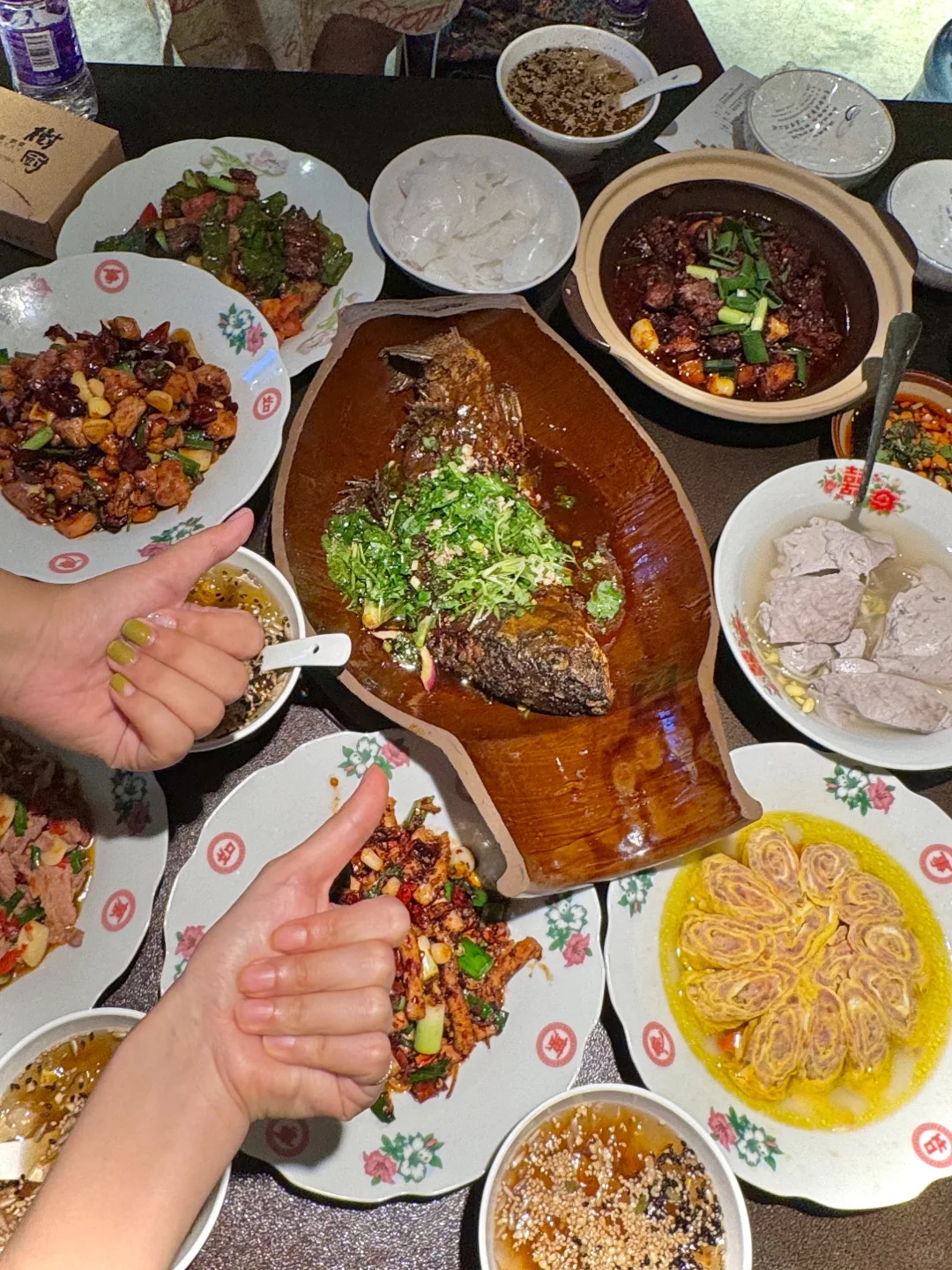 这家人真的好多!!做贵州菜做的真的好吃也!我喜欢辣子鸡,青椒炒肉,蛋卷。。我门吃了几个菜味道还可以,比较有锅气,属于地道本地菜,本地人都会去吃的哈~是好吃的!!!
