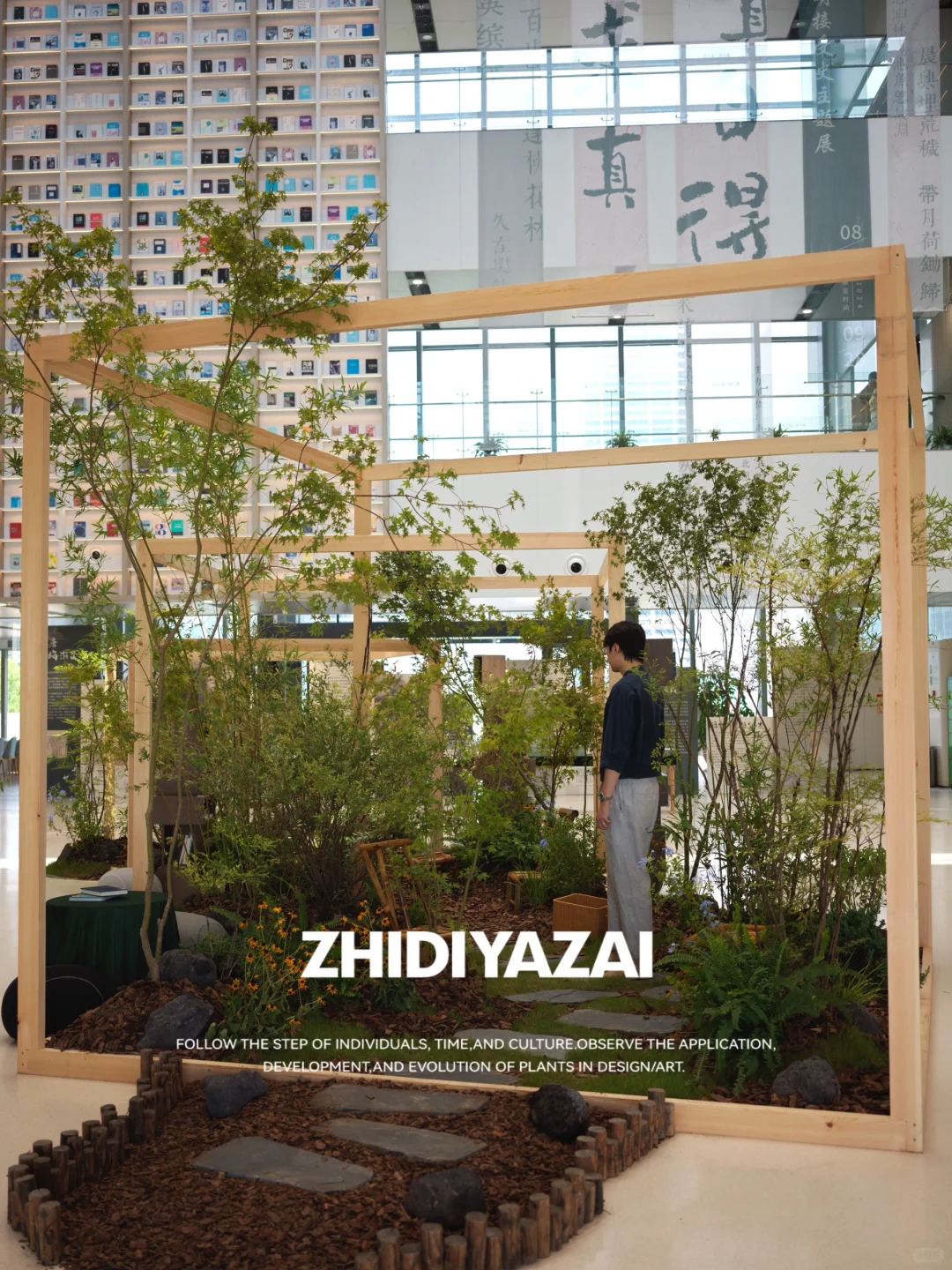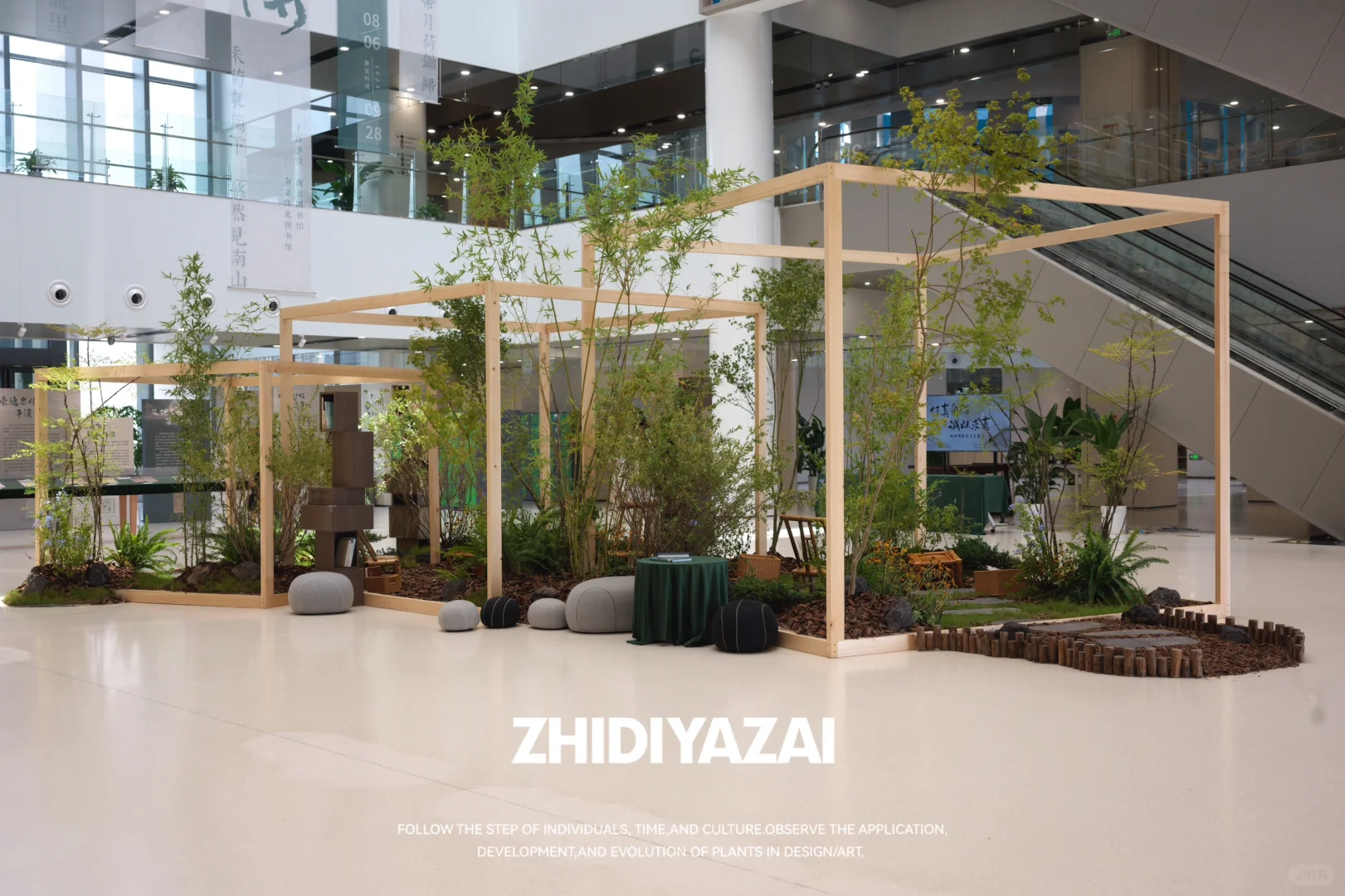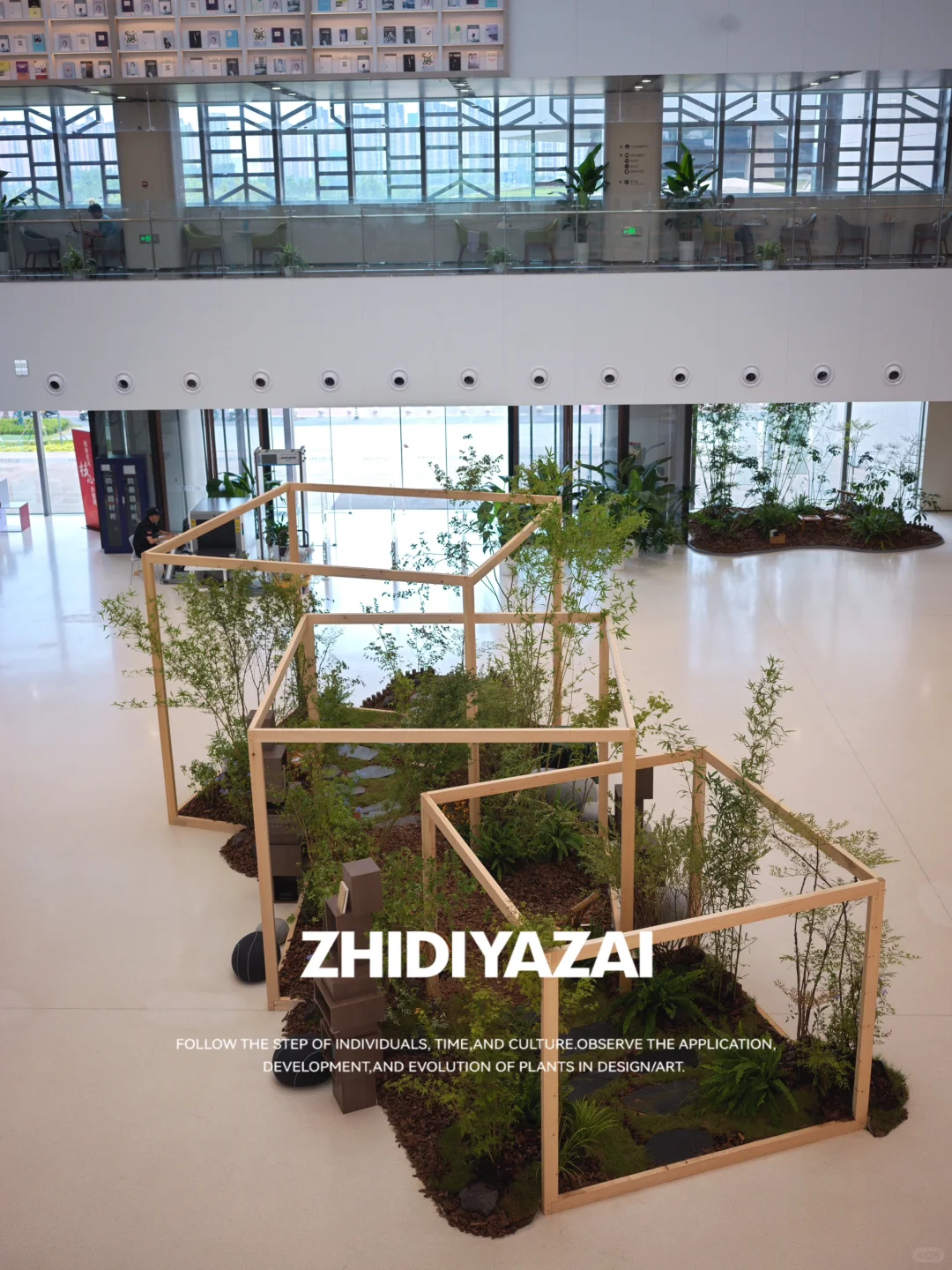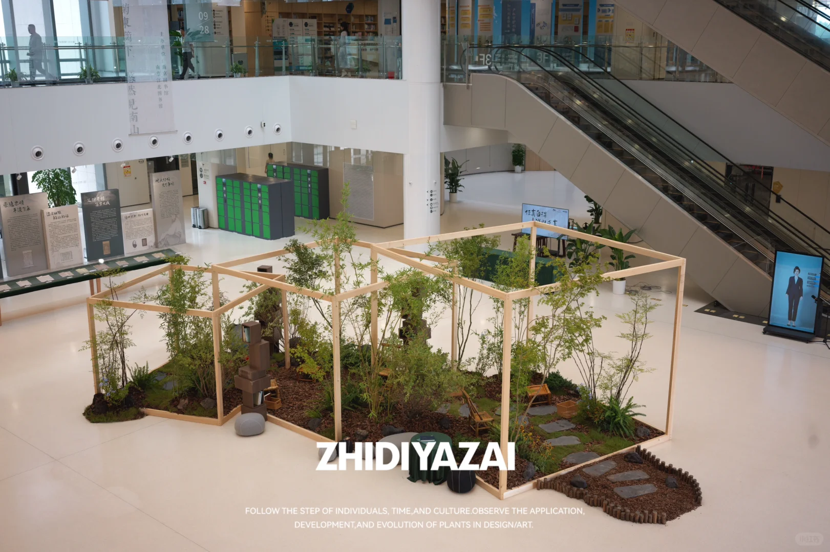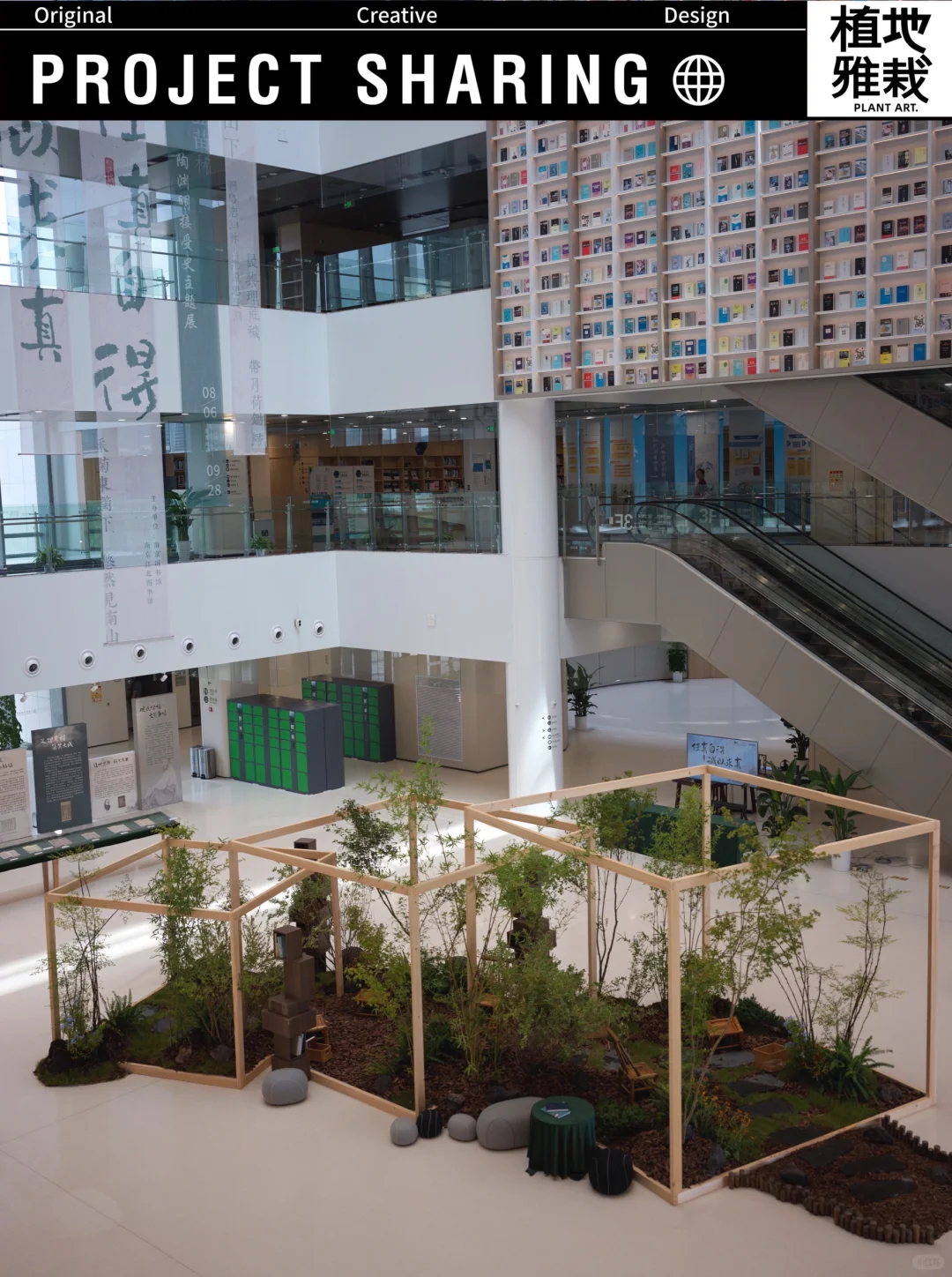 📍江北图书馆(新馆) 这次受邀为江北图书馆举办的陶渊明接受史主题展,搭建一个室内大型的植物景观装置。 景观装置坐落于大厅正中心,也是正门入口处。我们用前高后低共三个由木桩现场搭建的正方体,组成景观的框架。三个木质框架,形成一种草堂小径的感觉。 景观整体风格更加偏向于杂木风格,植物的搭配也会较为野趣。例如景观最高点的枫树,慈孝竹。再到中间段的南天竹,花叶杞柳,搭配上低矮处的蕨类。再在这“ 林间” 穿插一些金盏菊。让人更加沉浸在在这“ 采菊东篱下,悠然见南山”的意境之中。