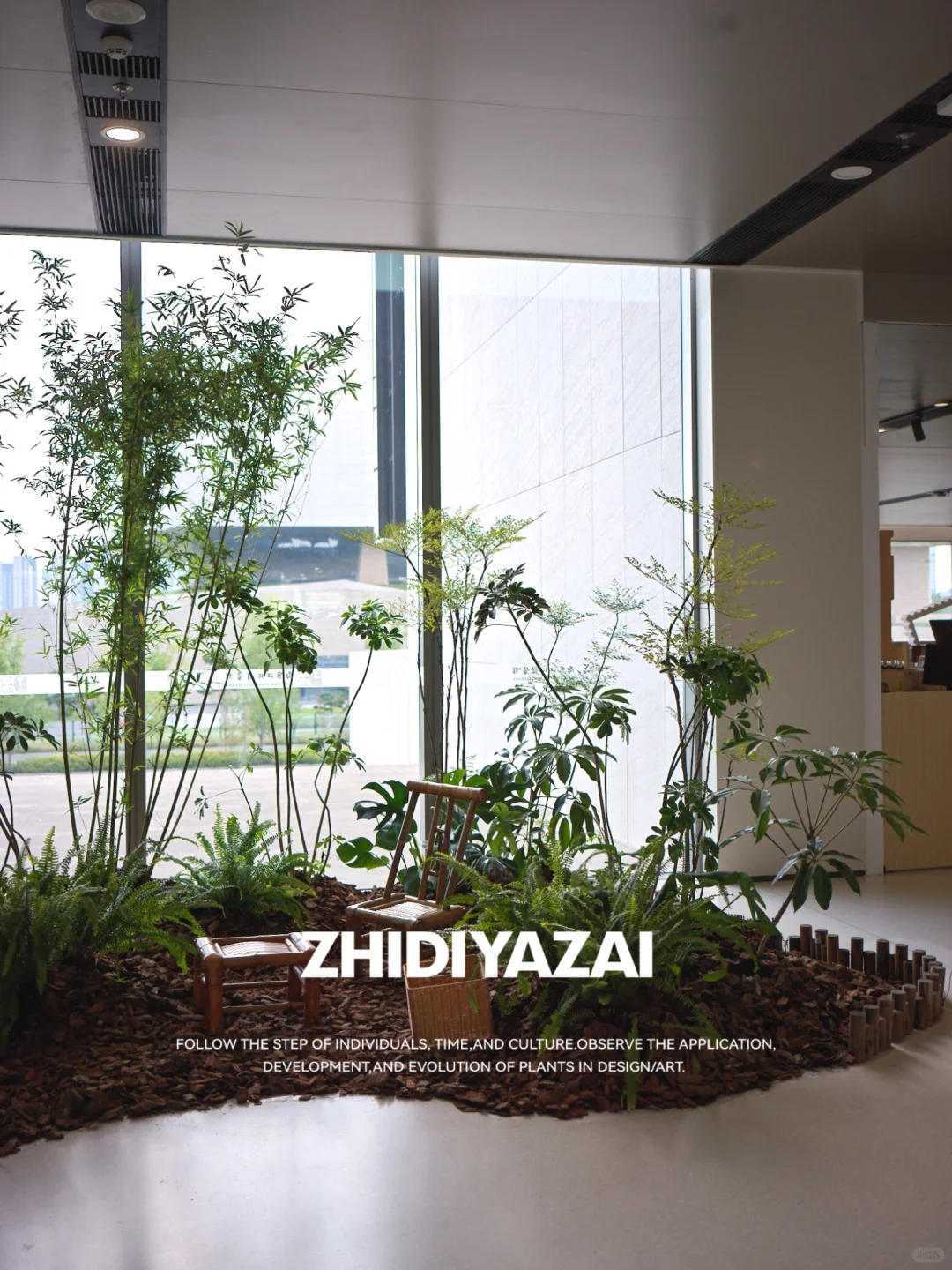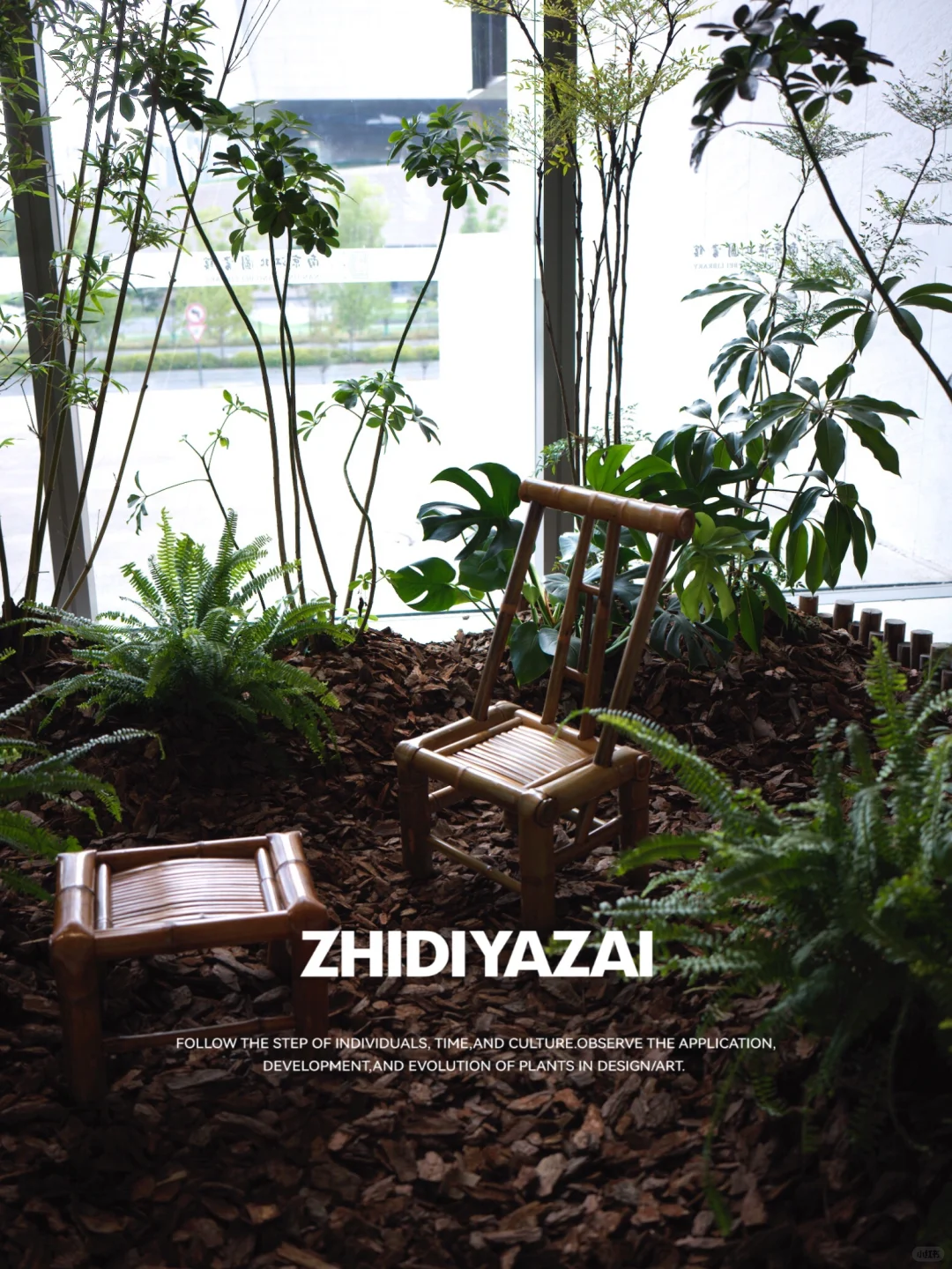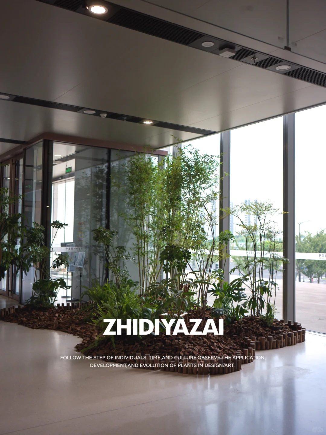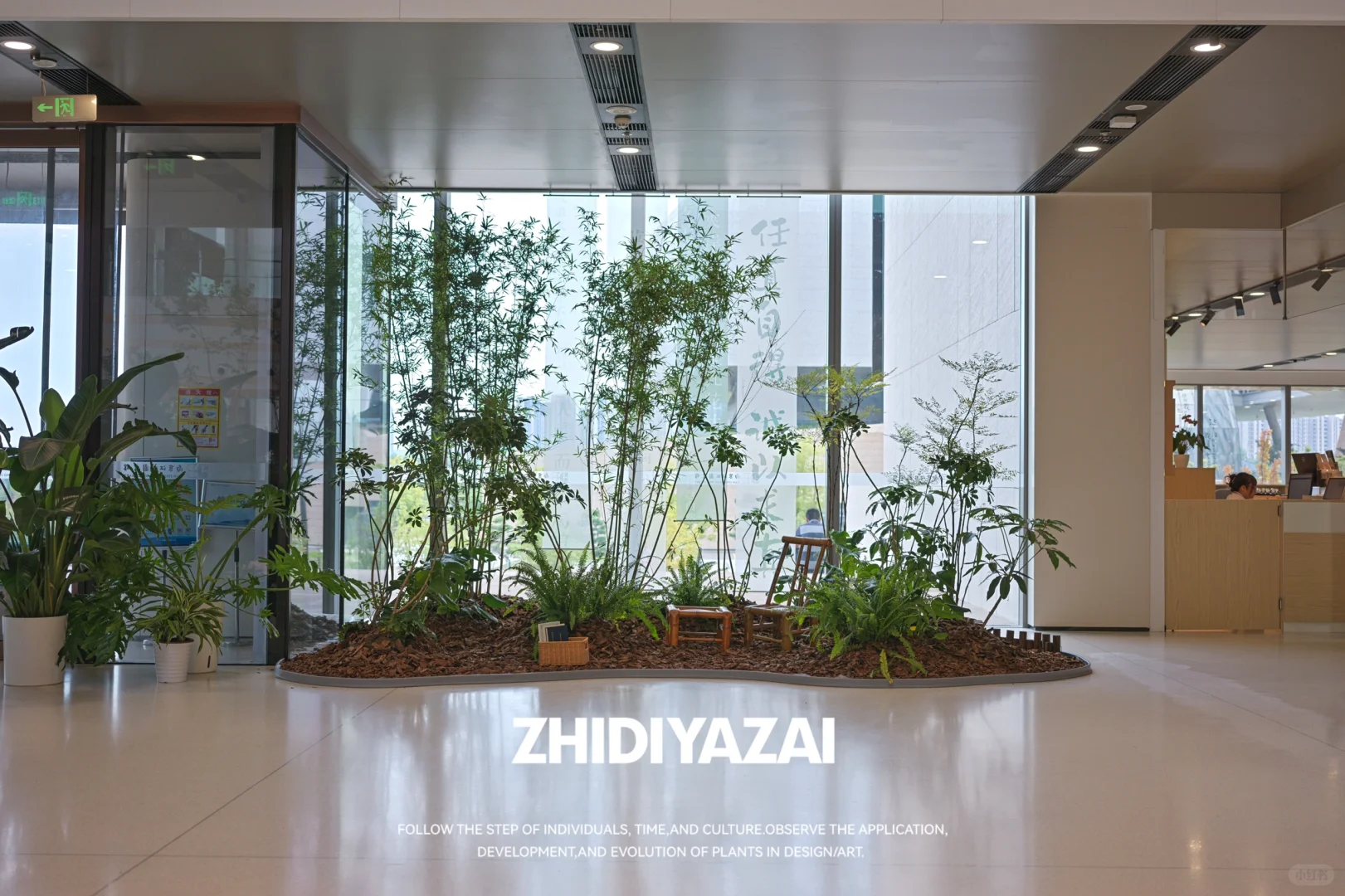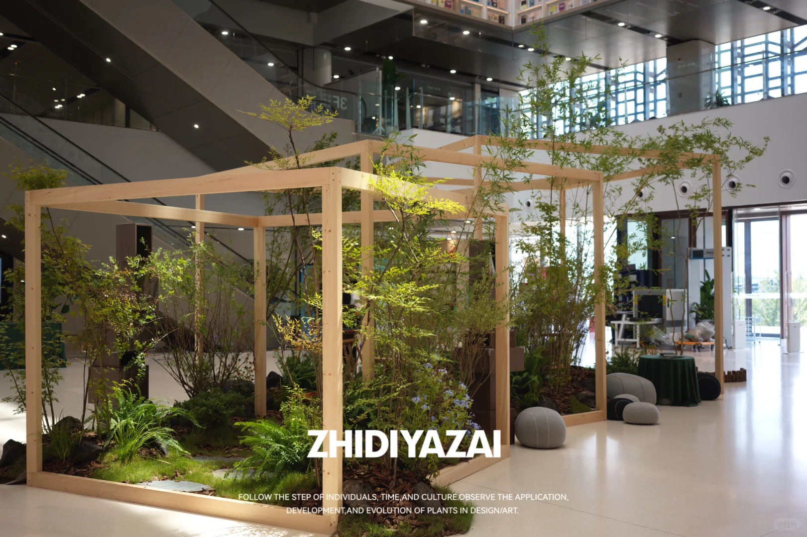 📍江北图书馆(新馆) 这次受邀为江北图书馆举办的陶渊明接受史主题展,搭建一个室内大型的植物景观装置。 景观装置坐落于大厅正中心,也是正门入口处。我们用前高后低共三个由木桩现场搭建的正方体,组成景观的框架。三个木质框架,形成一种草堂小径的感觉。 景观整体风格更加偏向于杂木风格,植物的搭配也会较为野趣。例如景观最高点的枫树,慈孝竹。再到中间段的南天竹,花叶杞柳,搭配上低矮处的蕨类。再在这“ 林间” 穿插一些金盏菊。让人更加沉浸在在这“ 采菊东篱下,悠然见南山”的意境之中。