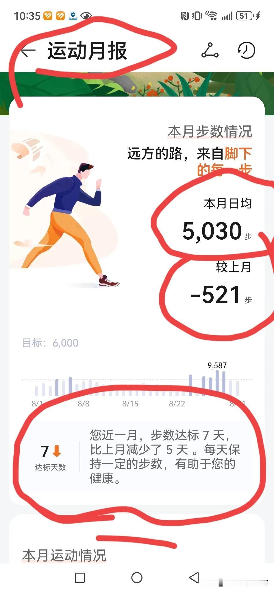 #我的运动日常#我的运动周报和运动月报出炉了!步行成绩分别显示:本周日均5788步,比上周每天多200步。本月日均5030步,比上月每天少500多步。这说明我这个有双膝骨关节炎的耄耋老人,还没有被病痛吓得不敢走路了。而是在相信科学的情况下,还要根据自己的情况去进行有效的锻炼,目的是让双腿的肌肉流失的慢一点,使自己晚一点儿用上轮椅。 我的步行锻炼方法有一个好方法,就是劳逸结合,有和我类似病痛的朋友不妨也试一试劳逸结合的方法。 比如我昨天走了14192步(9.42公里),今天我就在家里休息,只走了3000多步。