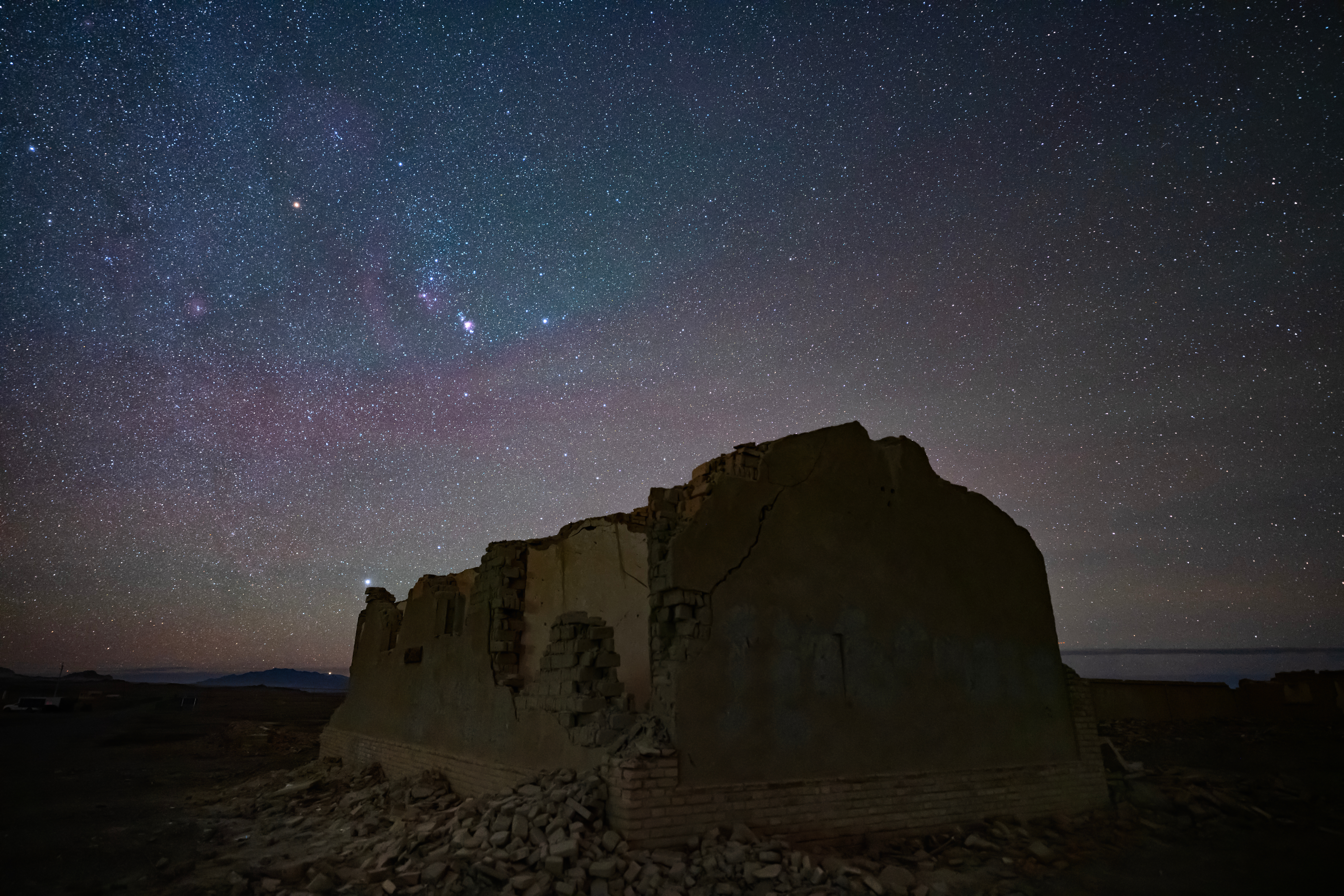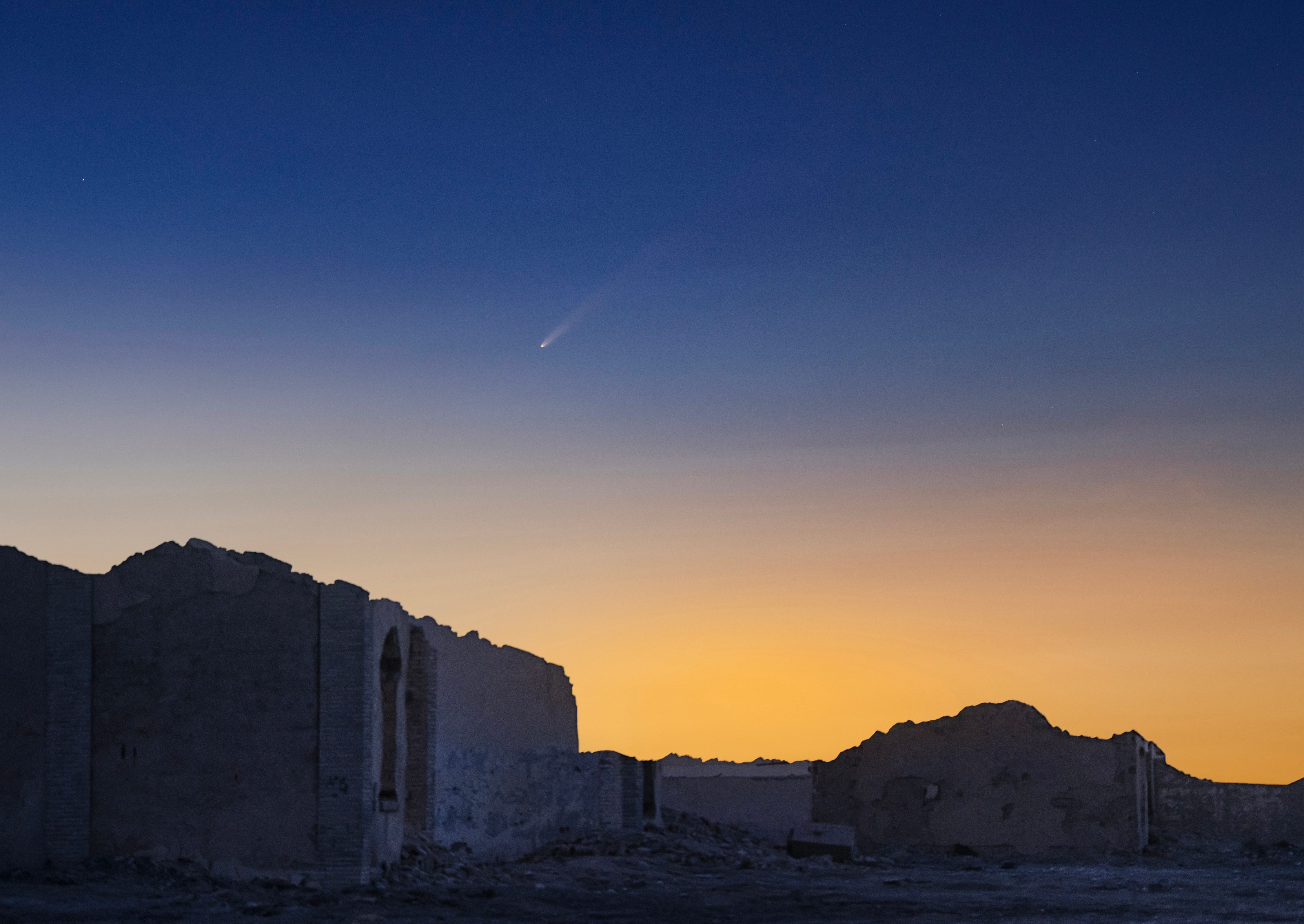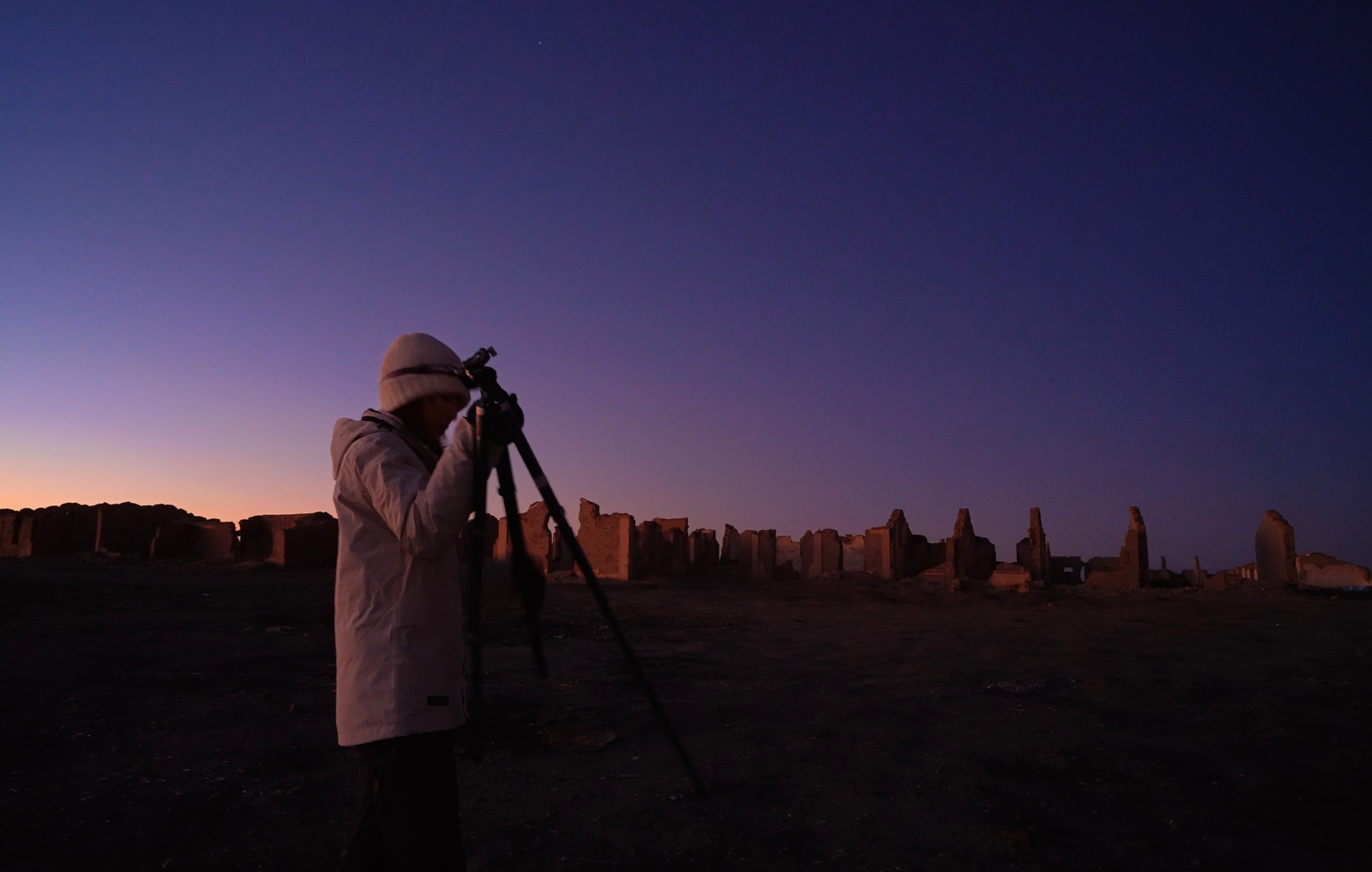 追逐冬季星河和紫金山-阿特拉斯彗星 C/2023 A3 (Tsuchinshan-ATLAS)的第 60 个小时,这次彗星的赤纬值约在-6°到+4°之间变化,更适合低纬度地区观测。但为了完成预想的画面,我回到了北纬 39 度,在废墟之中,璀璨的星河之后收获了第一次「八万年的相遇」,寂静之地,又见「彗星与月球」浸泡在温暖的阳光中。
