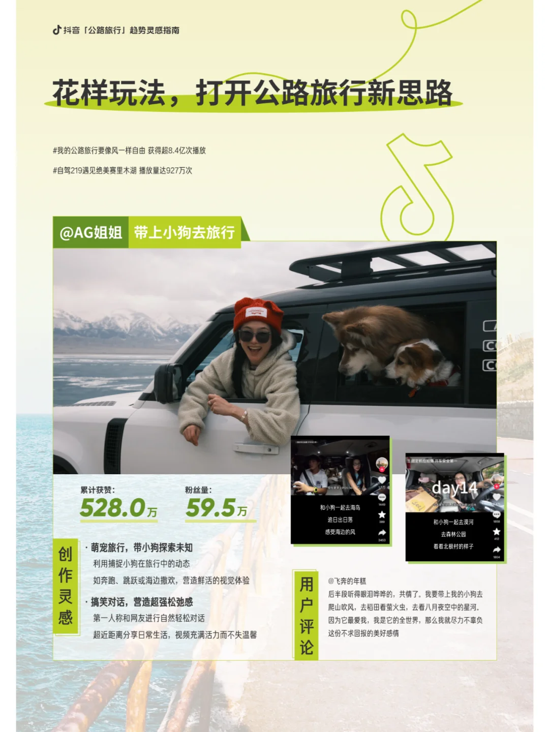 音上的创作者们通过分享他们的公路旅行故事,为其他人提供了灵感。无论是带上小狗去旅行,还是通过搞笑对话来营造轻松氛围,或是通过综艺拍摄方式记录旅行,这些内容都为公路旅行增添了更多的色彩。