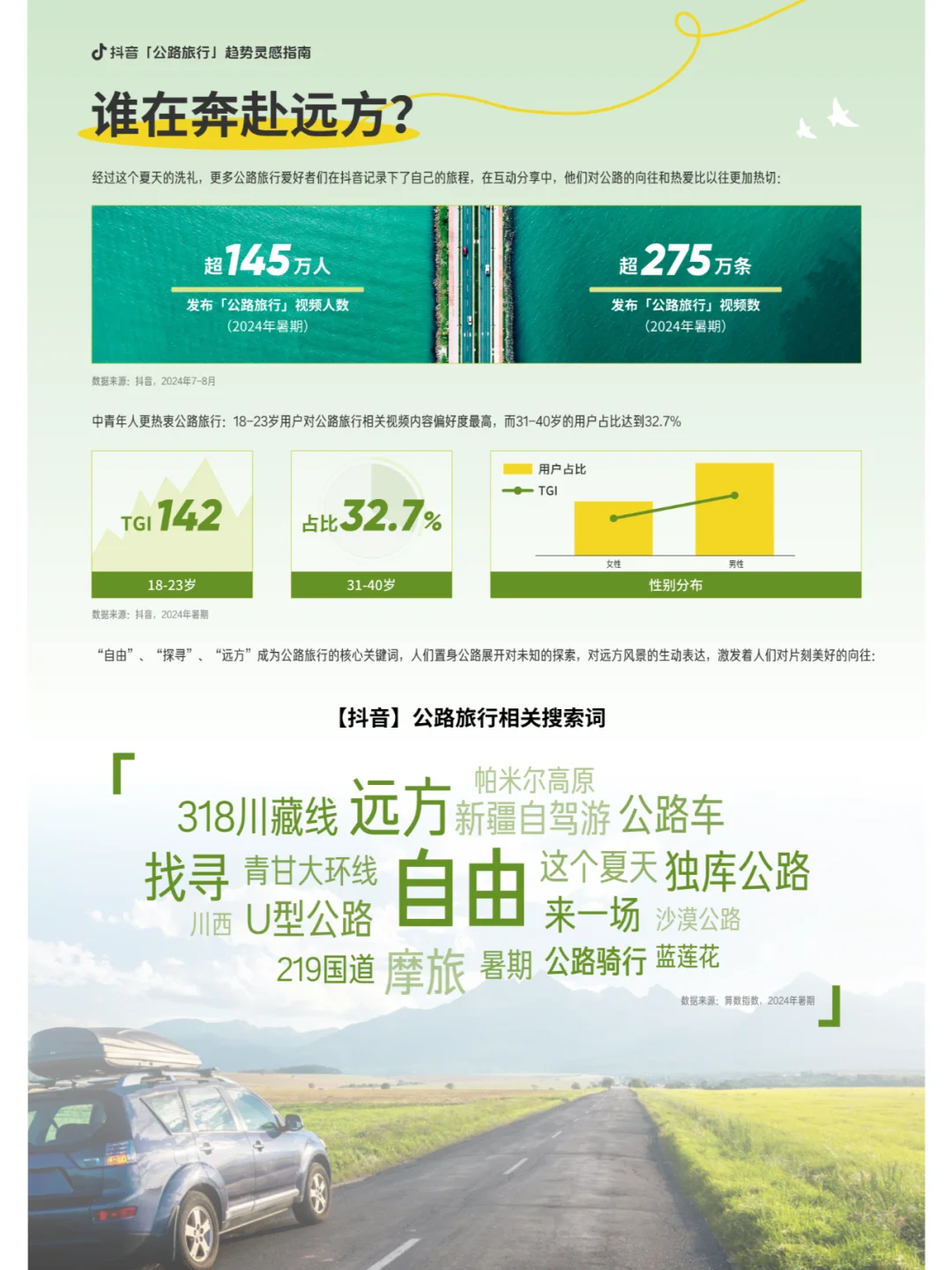 公路旅行的魅力在于它的未知和自由。正如电影《绿皮书》中的经典台词所说,公路旅行让人发现国家的美。2024年,音上关于「公路旅行」的搜索指数同比增长了97倍,环比增长了112倍,这一数据足以说明公路旅行的热度。