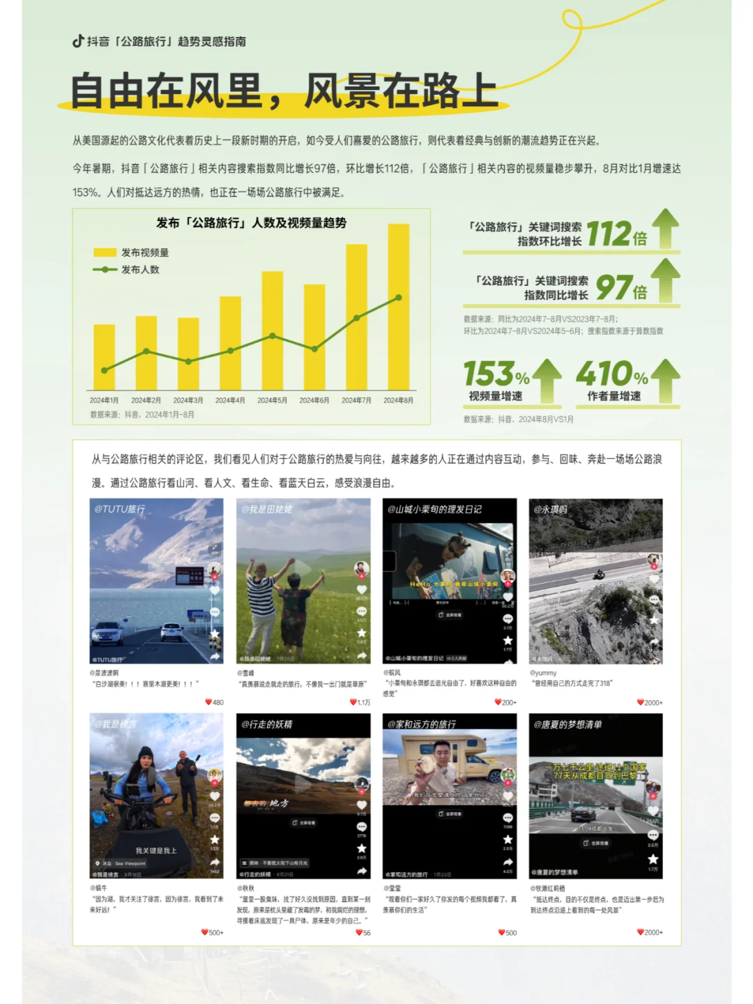 在 音 上,「公路旅行」相关内容的视频量从2024年1月到8月增速达到了153%。这表明,越来越多的人选择在上分享他们的公路旅行故事,也有越来越多的人通过观看这些内容来体验和感受公路旅行的魅力。