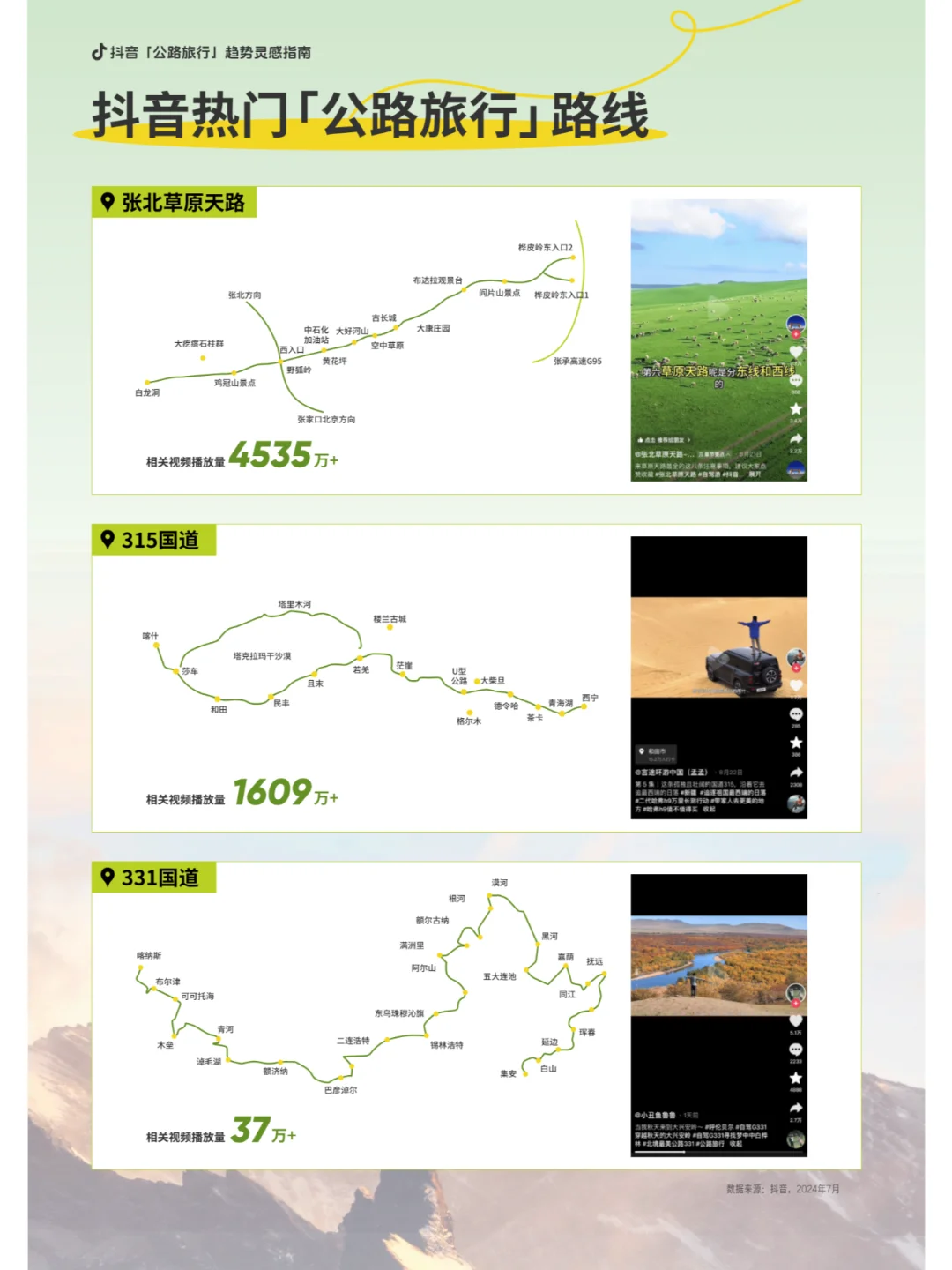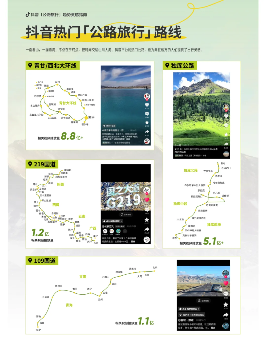 音上的热门公路旅行路线包括109国道、独库公路、219国道等,这些路线的相关视频播放量均达到了亿级。这些路线不仅风景优美,而且各具特色,成为了公路旅行者的首选。