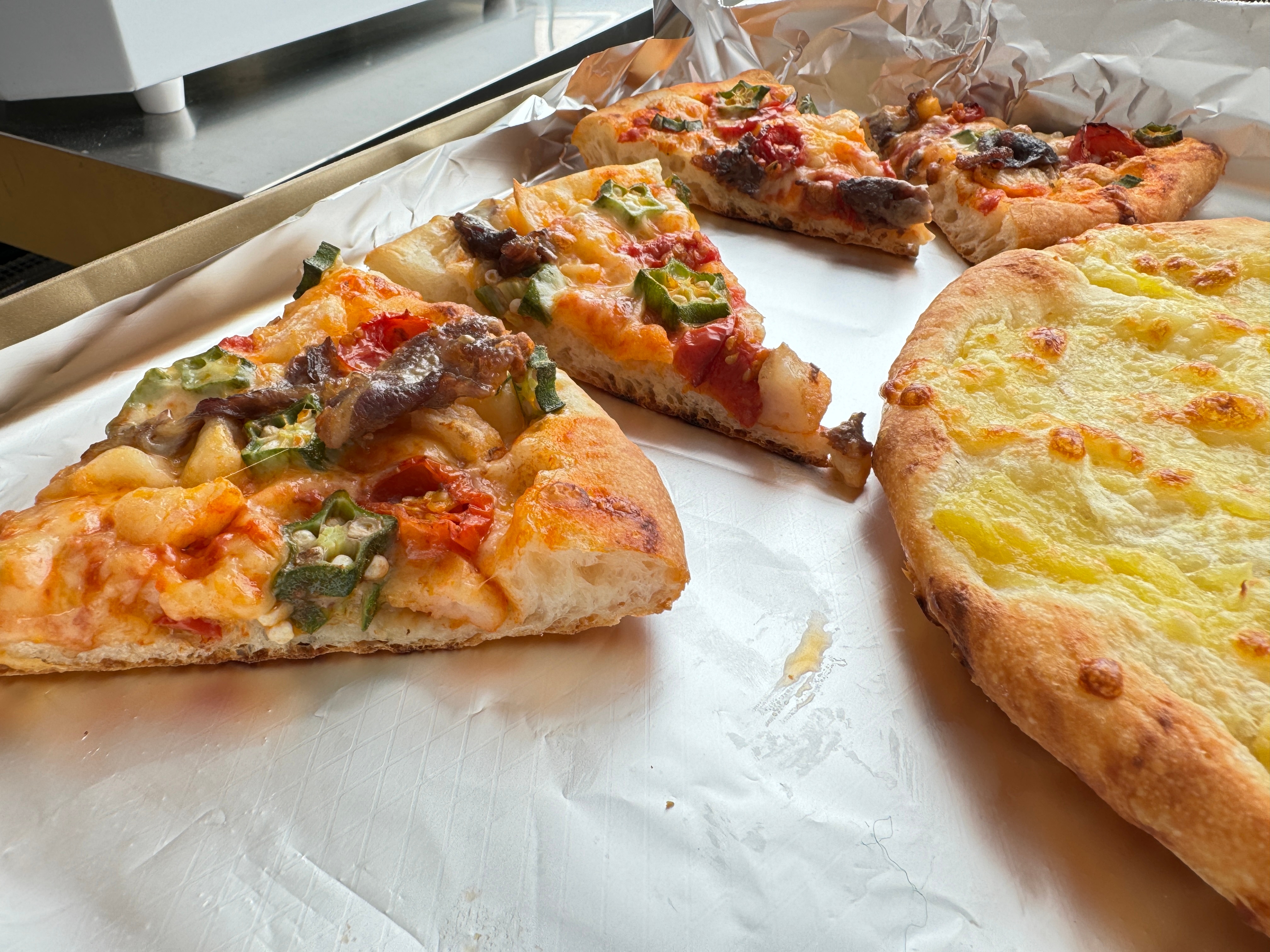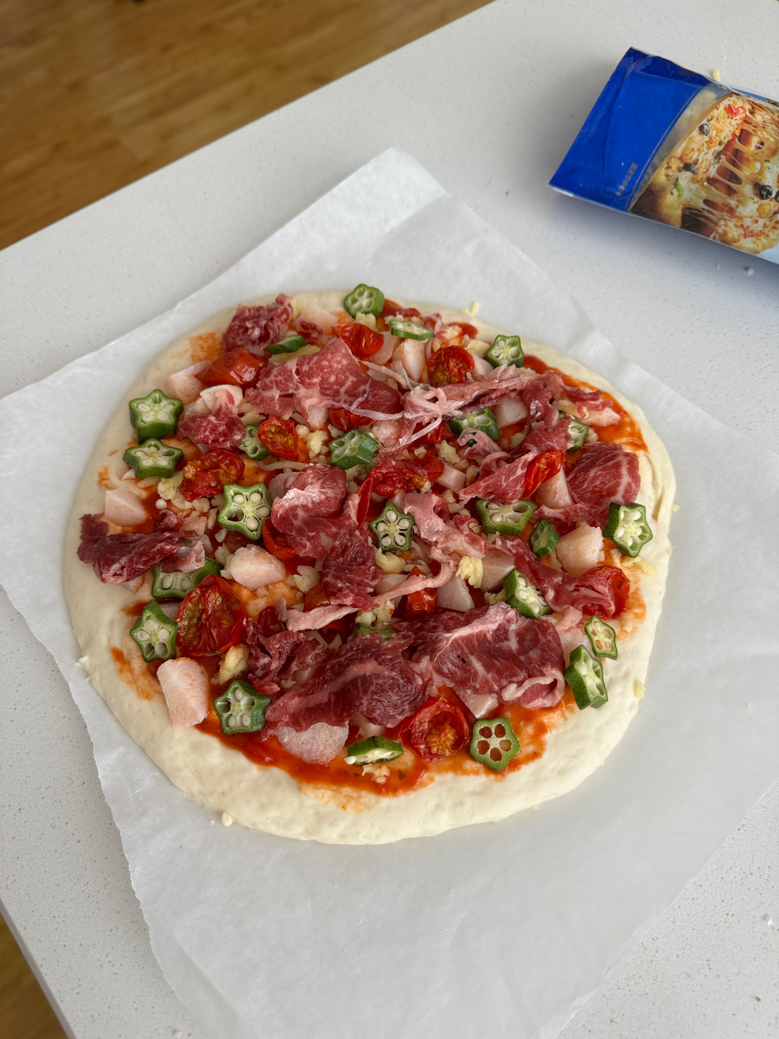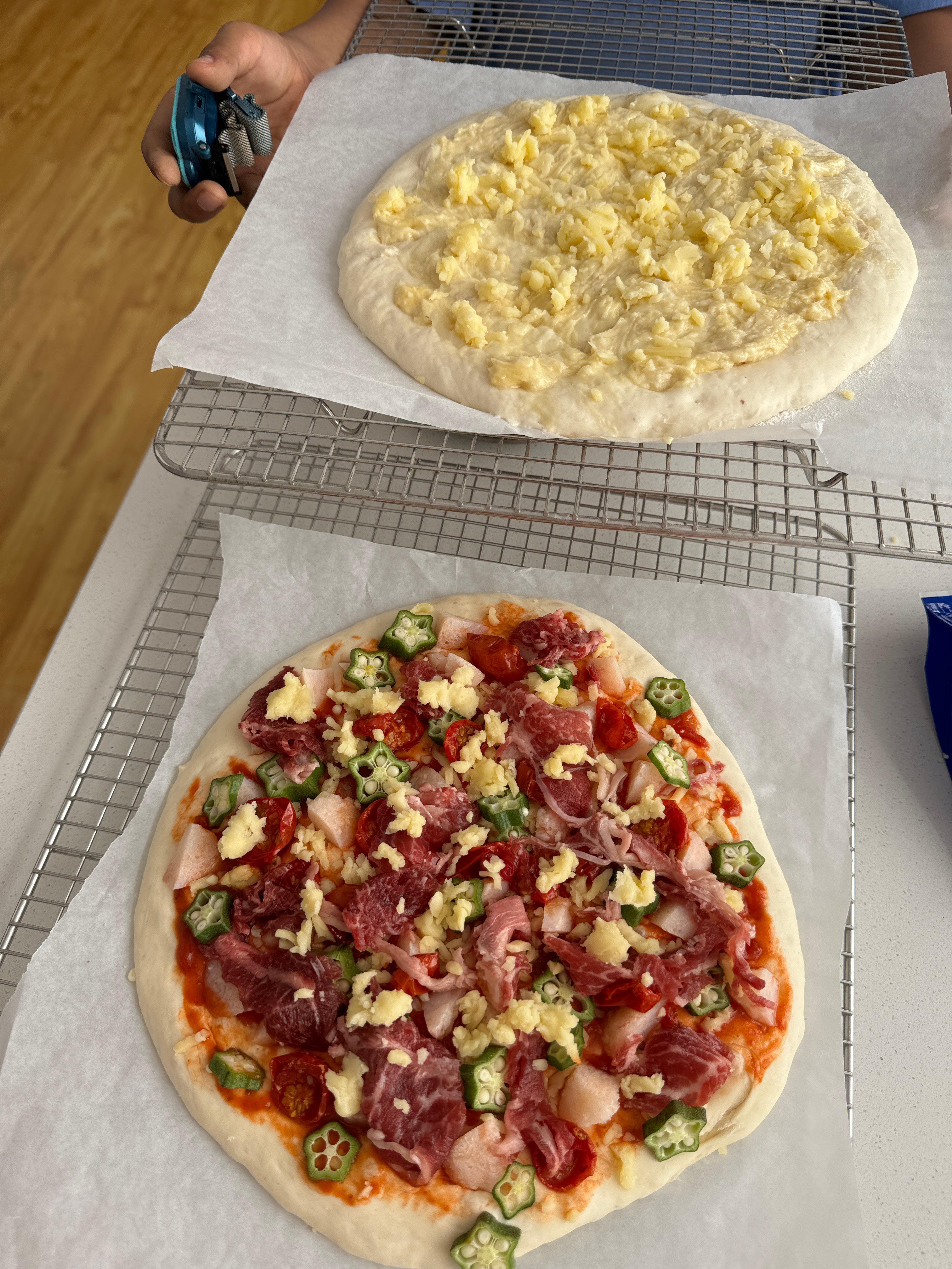 今天中午吃披萨,一个咸口的牛肉虾丸披萨,一个甜口的榴莲披萨。
