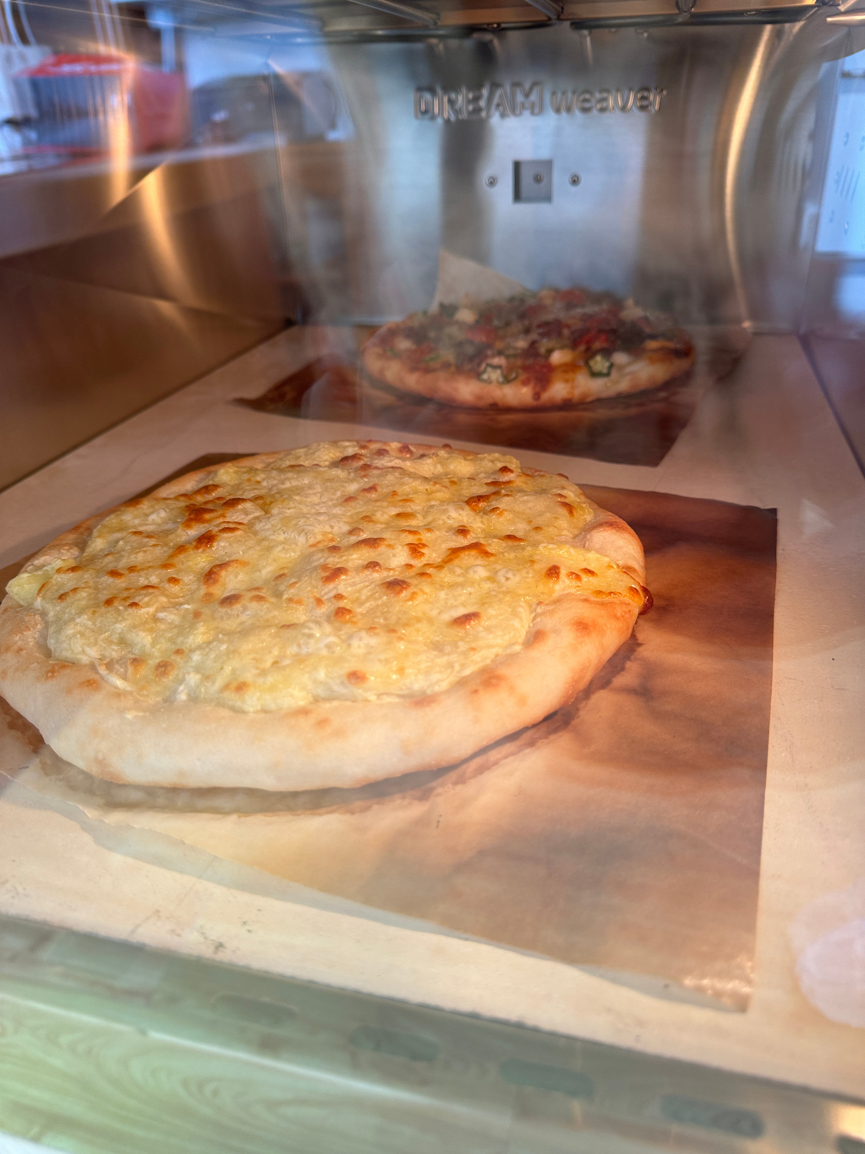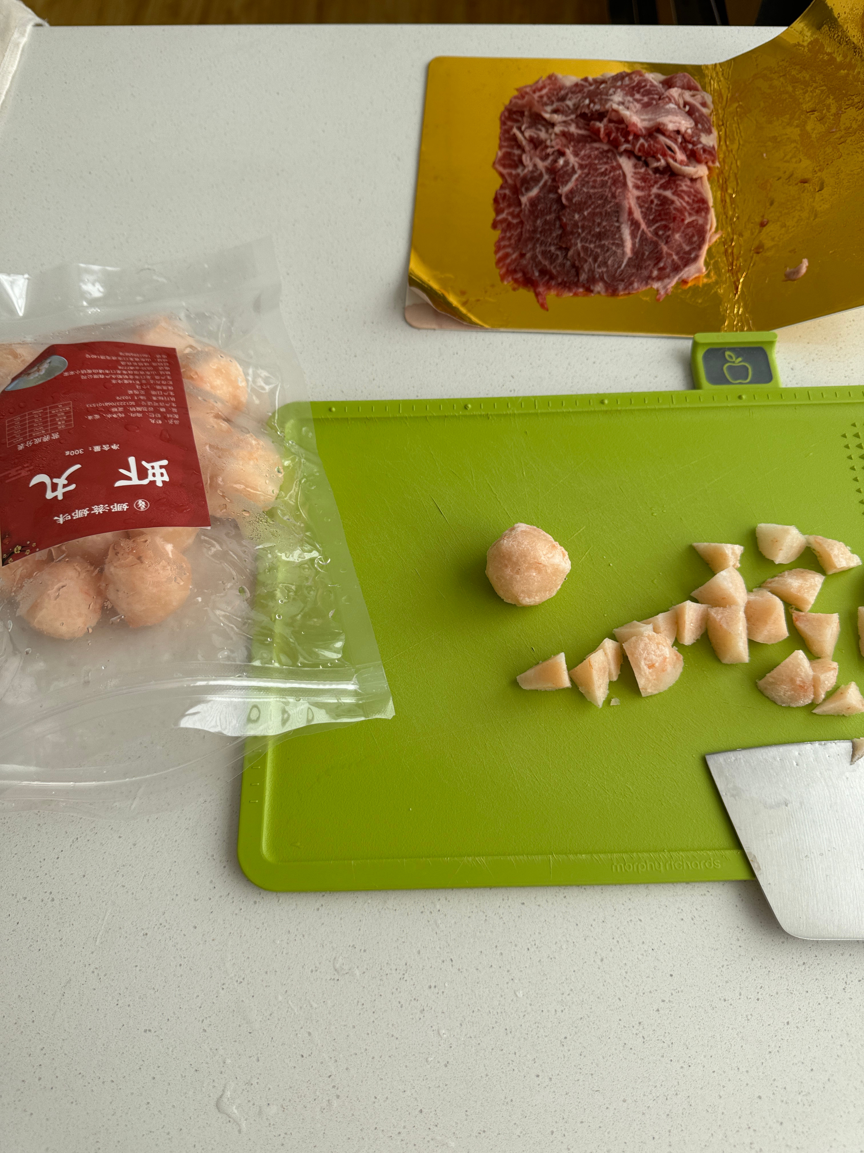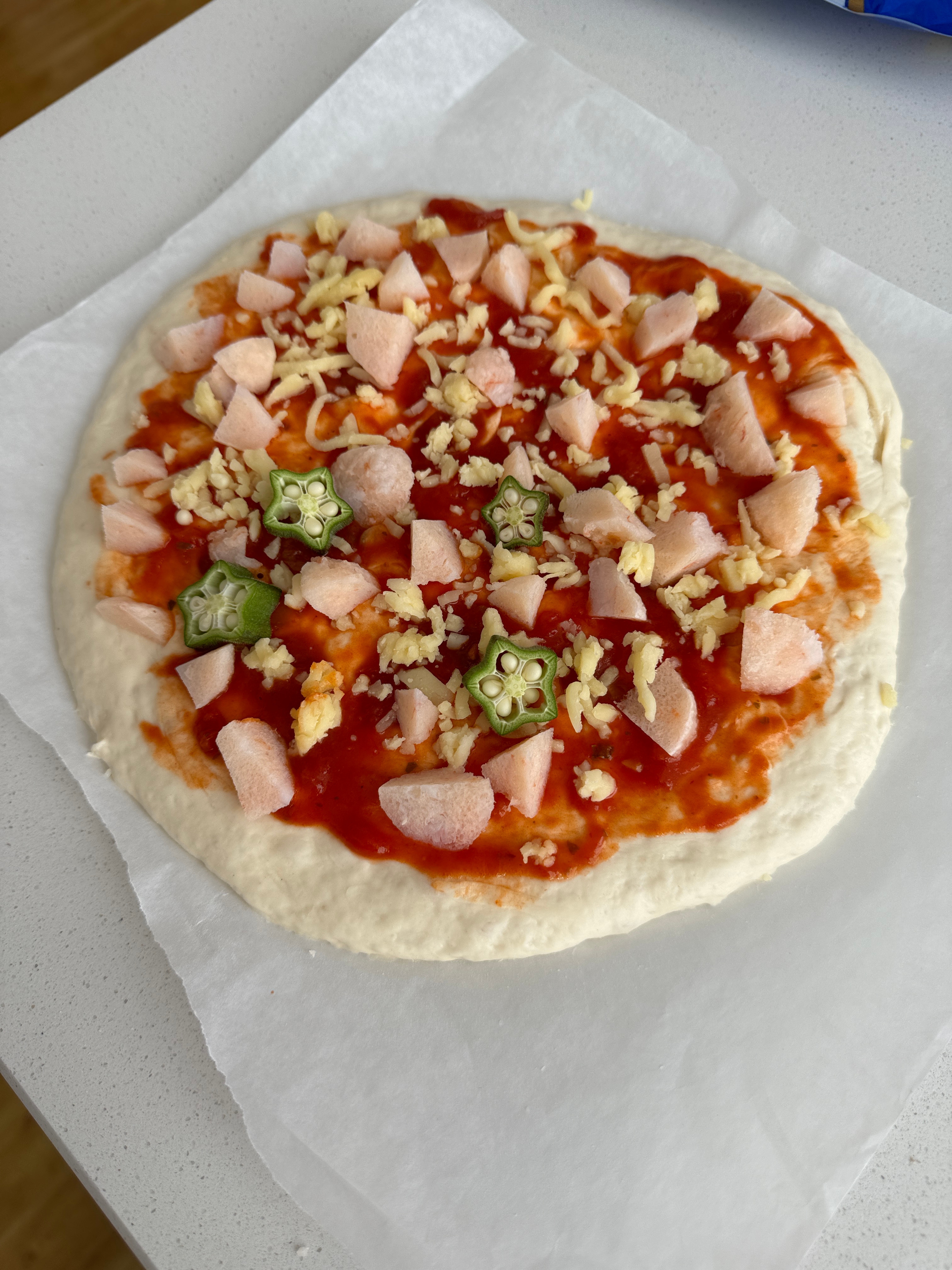 今天中午吃披萨,一个咸口的牛肉虾丸披萨,一个甜口的榴莲披萨。