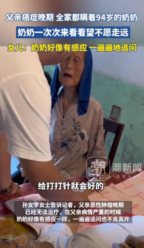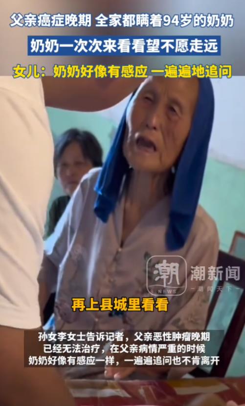 (信息来源:潮新闻2024年8月23日《父亲癌症晚期,全家瞒着94岁的奶奶,奶奶一次次来看看望不愿远走。女儿:奶奶好像有感应,一遍遍地追问》)