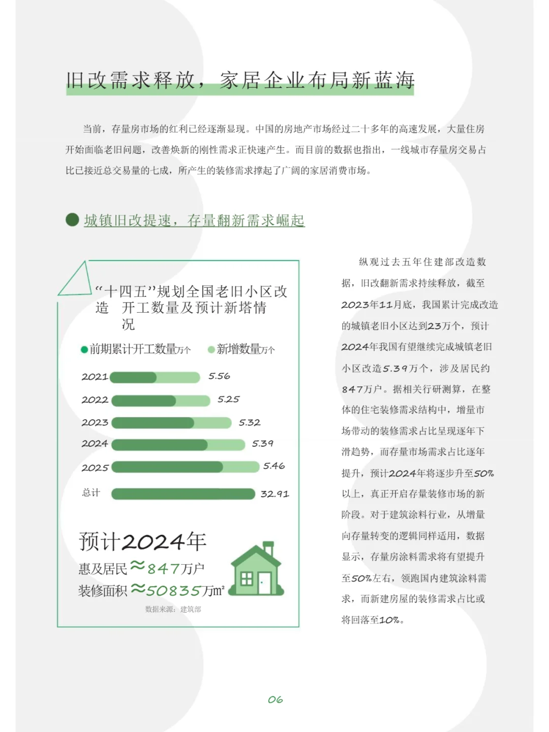 存量房市场的红利逐渐显现,旧房翻新、局部改造、家具迭代的需求不断释放。数据显示,2024年有望完成城镇老旧小区改造5.39万个,涉及居民约847万户。这不仅为家居行业带来新的机遇,同时也提出了更高的要求。