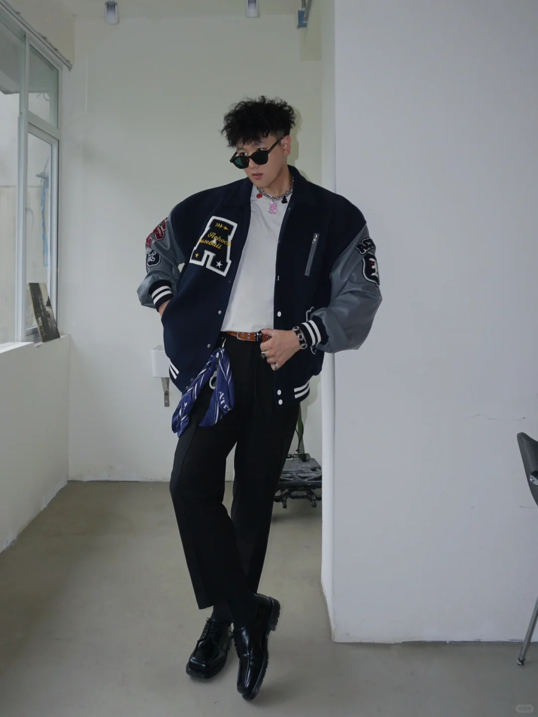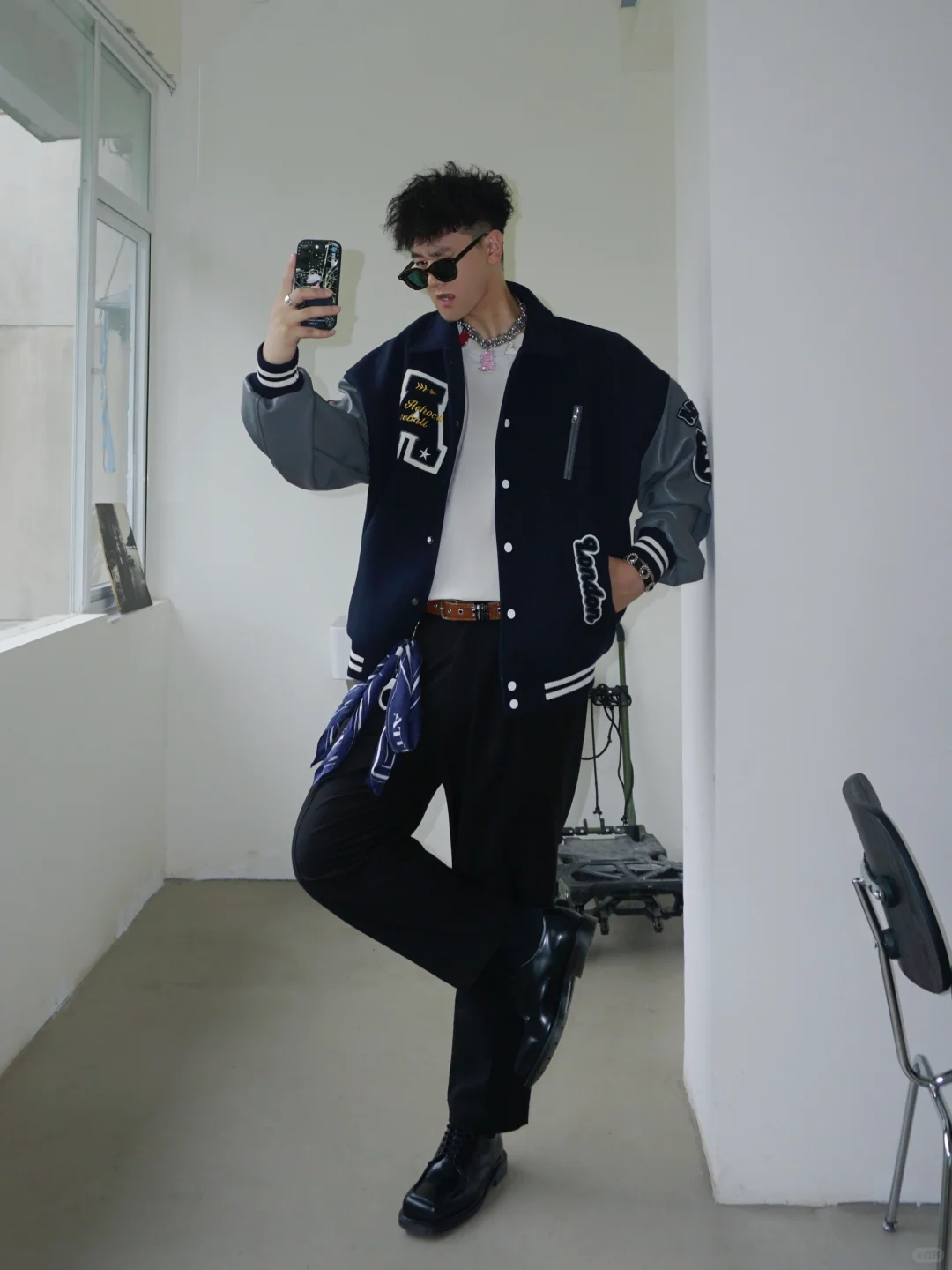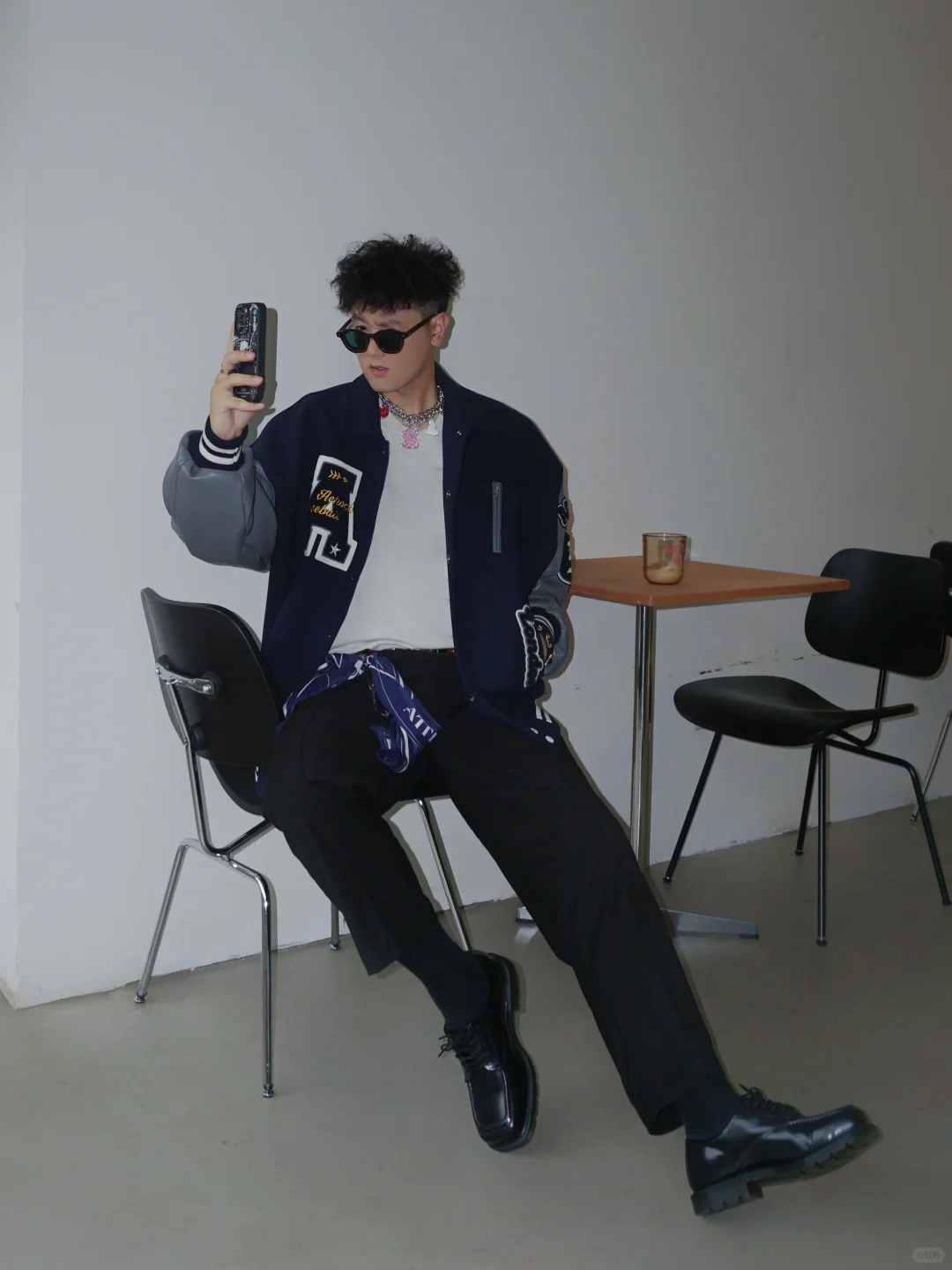 棒球服配西裤也太雅痞绅士了吧▪️❕ 秋冬穿暗蓝色🌊莫名自带一种学院风~ 悟出Athflow新奥义💡如今天Outfit示范: 用绅士感裤装➕街头风的单品叠搭即可~ 蓝丝巾不一定要系脖领处✔️也太严肃了, 系腰间的浪漫是顶男的小把戏✨拿捏了~ 新入的马丁方头德比▪️还挺有时装那味儿, 隐隐显高🦵再卷个头发出门别叫我韩男嗷💯~ - ▪️Fitcheck▪️ 👔: 👖:🕶️: ACCRUE 💎:BAI 👞:Martens马丁 - -