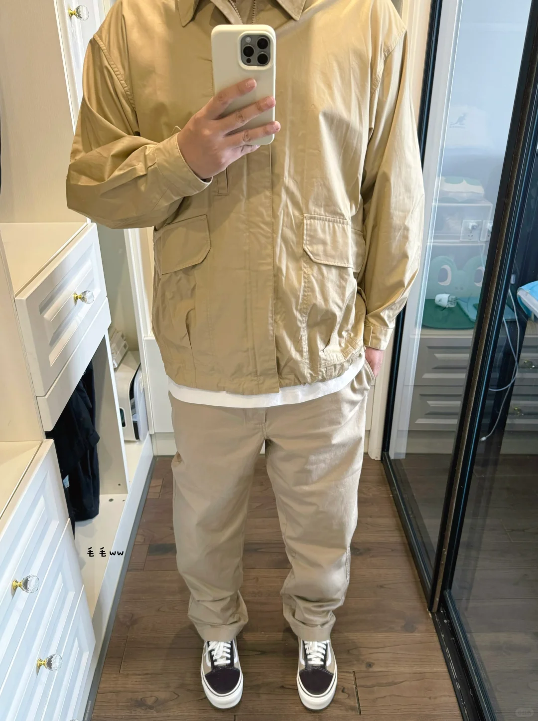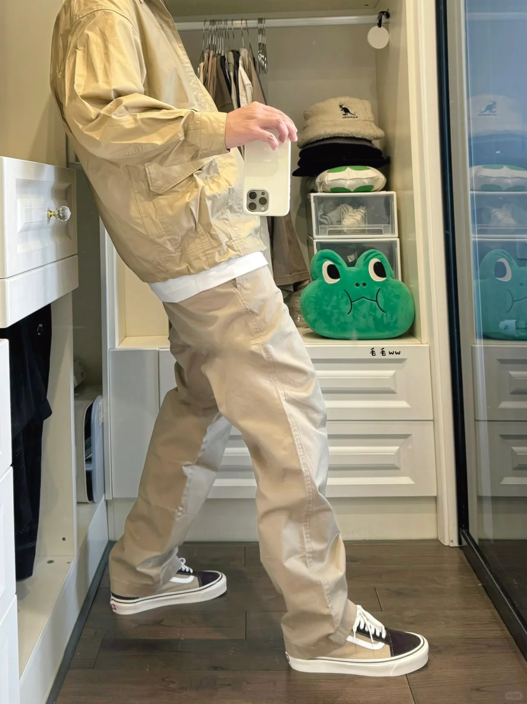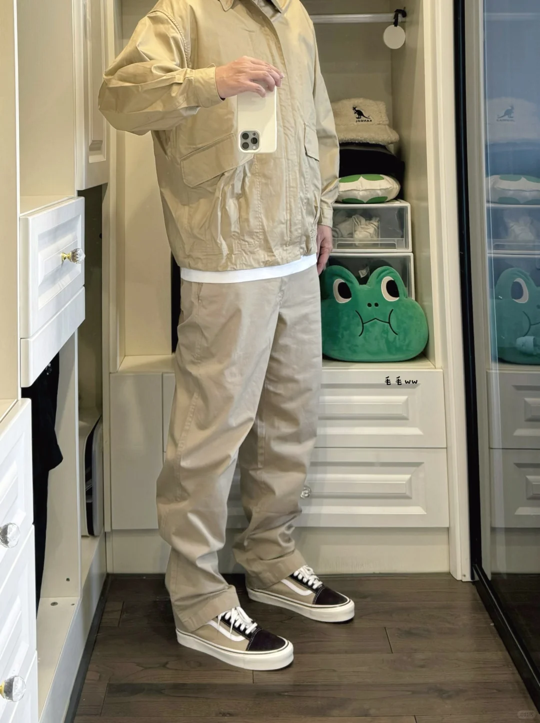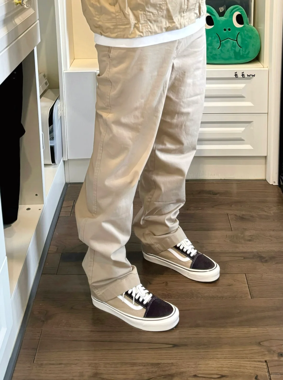 -Chino西裤怎么穿,硬质又有弹性的面料很关键,呈现自然褶皱感,容易打理也耐看 . -搭配一双同色系硫化鞋,帆布材质跟上下装都能呼应上,简单的直筒裤不挑鞋型 . —————— . ✏️本人178cm75kg 球鞋尺码265mm(正常EU42) . 💭以上均为我个人观点,不喜勿喷,欢迎讨论。