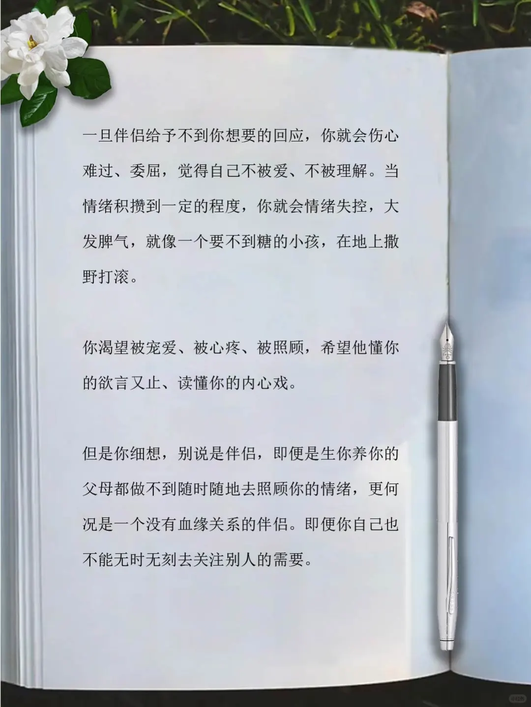 但是你细想,别说是伴侣,即便是生你养你的父母都做不到随时随地去照顾你的情绪,更何况是一个没有血缘关系的伴侣。即便你自己也不能无时无刻去关注别人的需要。
