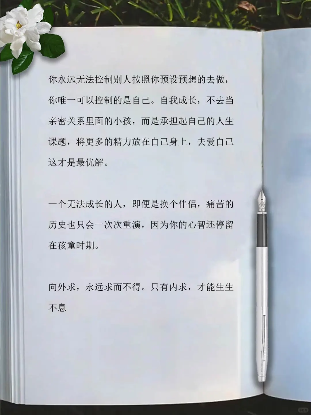 你永远无法控制别人按照你预设预想的去做,你唯一可以控制的是自己。自我成长,不去当亲密关系里面的小孩,而是承担起自己的人生课题,将更多的精力放在自己身上,去爱自己这才是最优解。