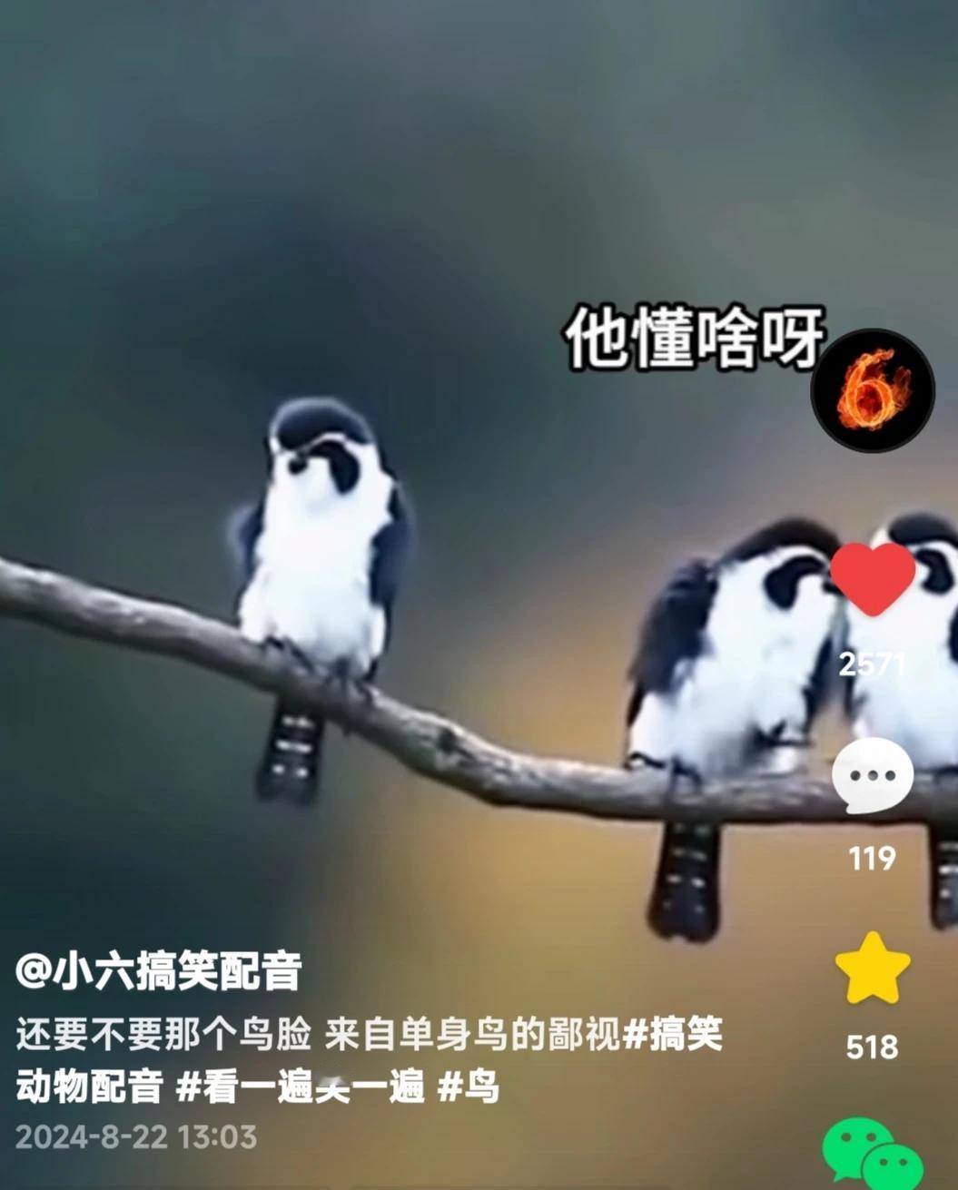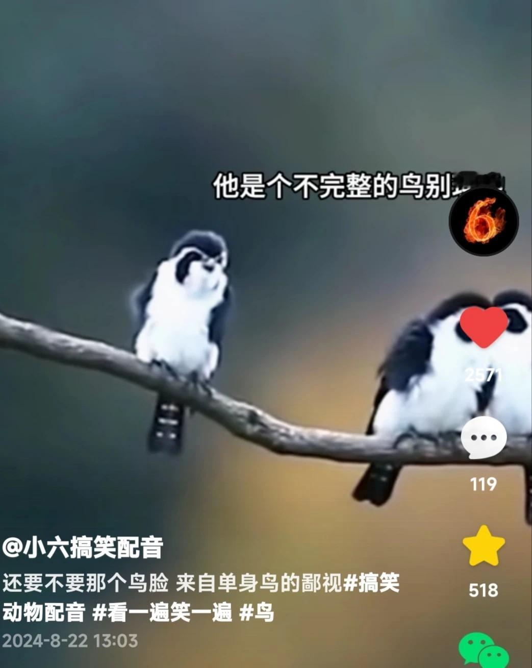 母鸟儿: 老公,它好像在说咱们…… 公鸟儿: 他懂啥啊?它是个不完整的鸟儿,别理