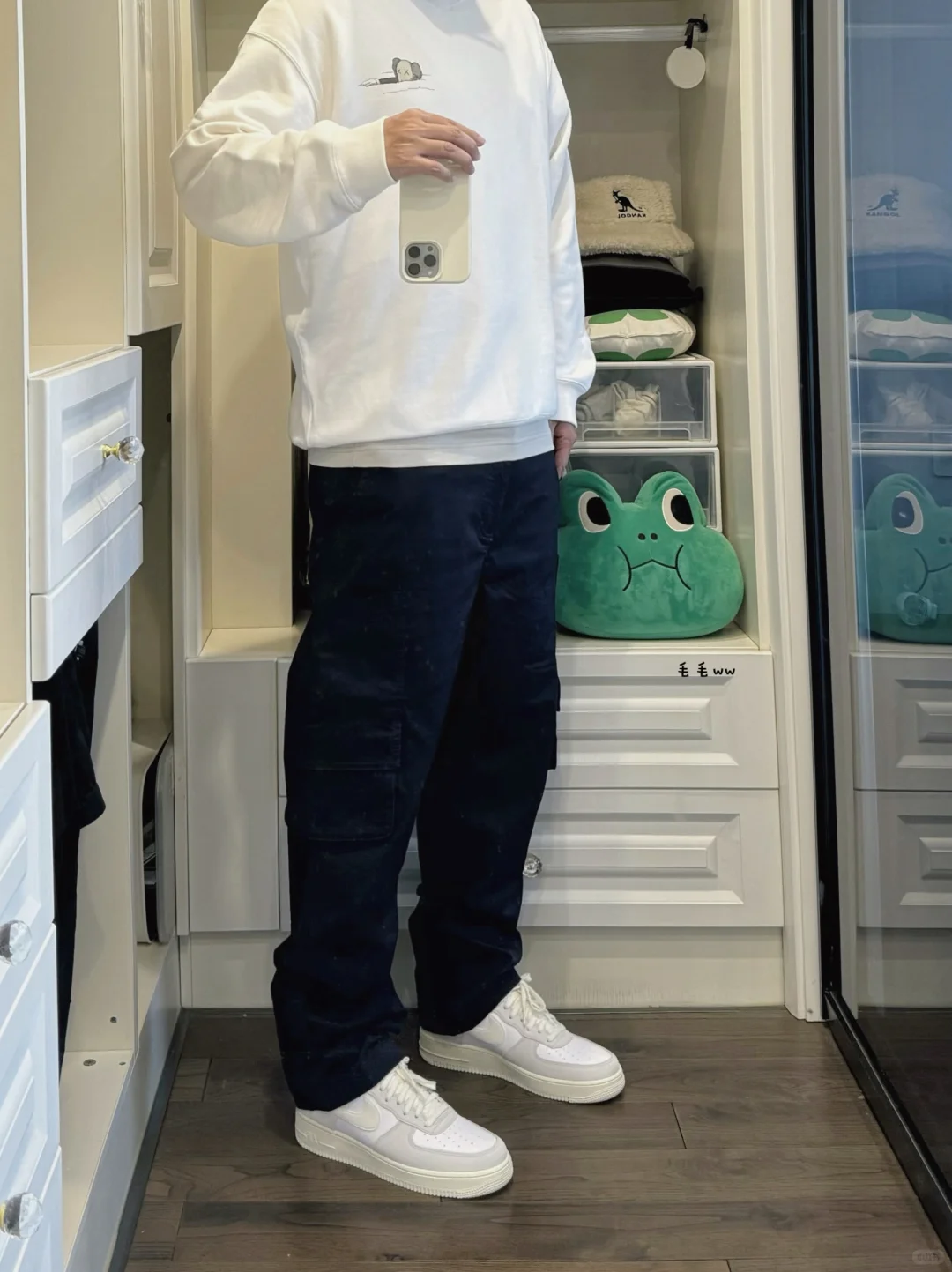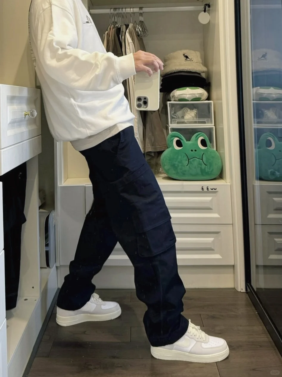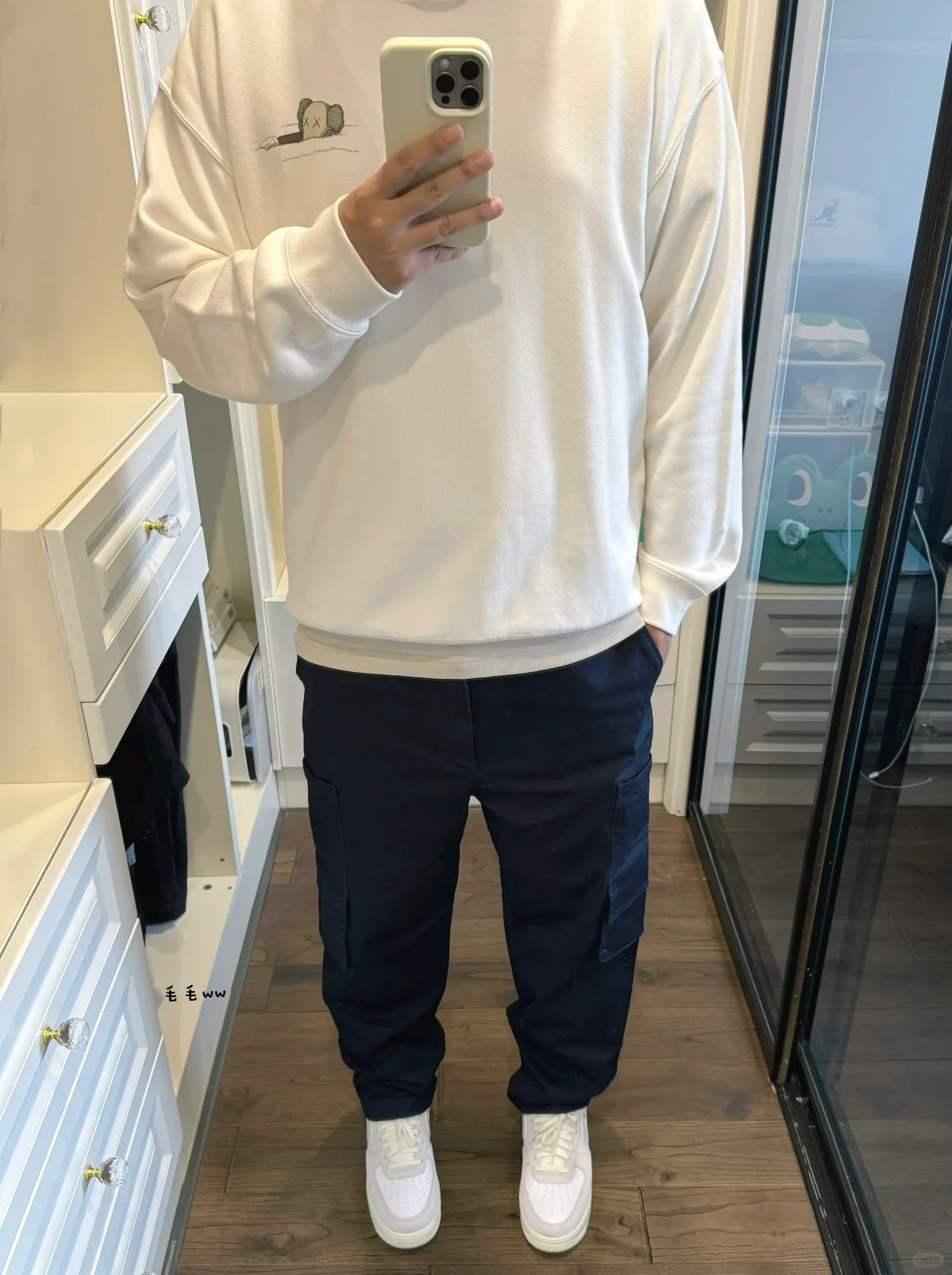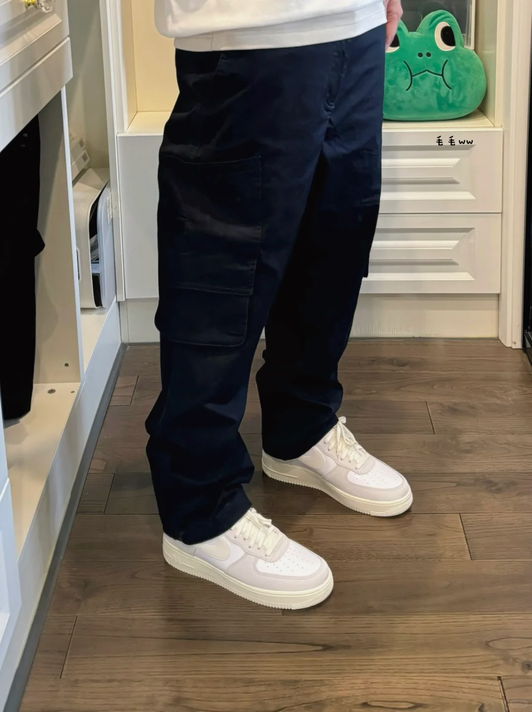 -藏青蓝色系,是不错的深色系选择 -口袋工装裤,在秋冬季节非常实用 -硬挺的面料,能让直筒裤自然堆叠 . —————— . ✏️本人178cm75kg 球鞋尺码265mm(正常EU42) . 💭以上均为我个人观点,不喜勿喷,欢迎讨论。