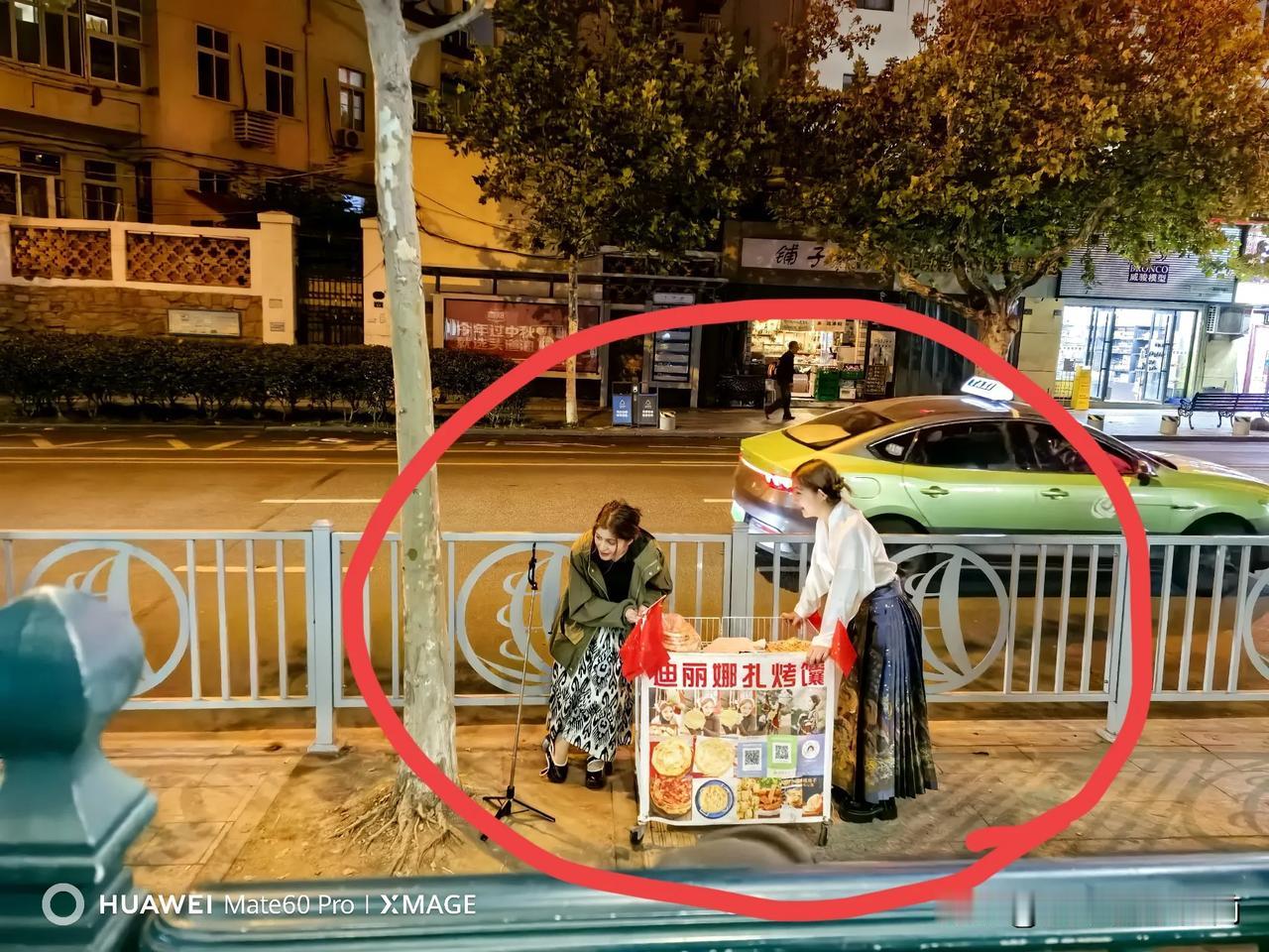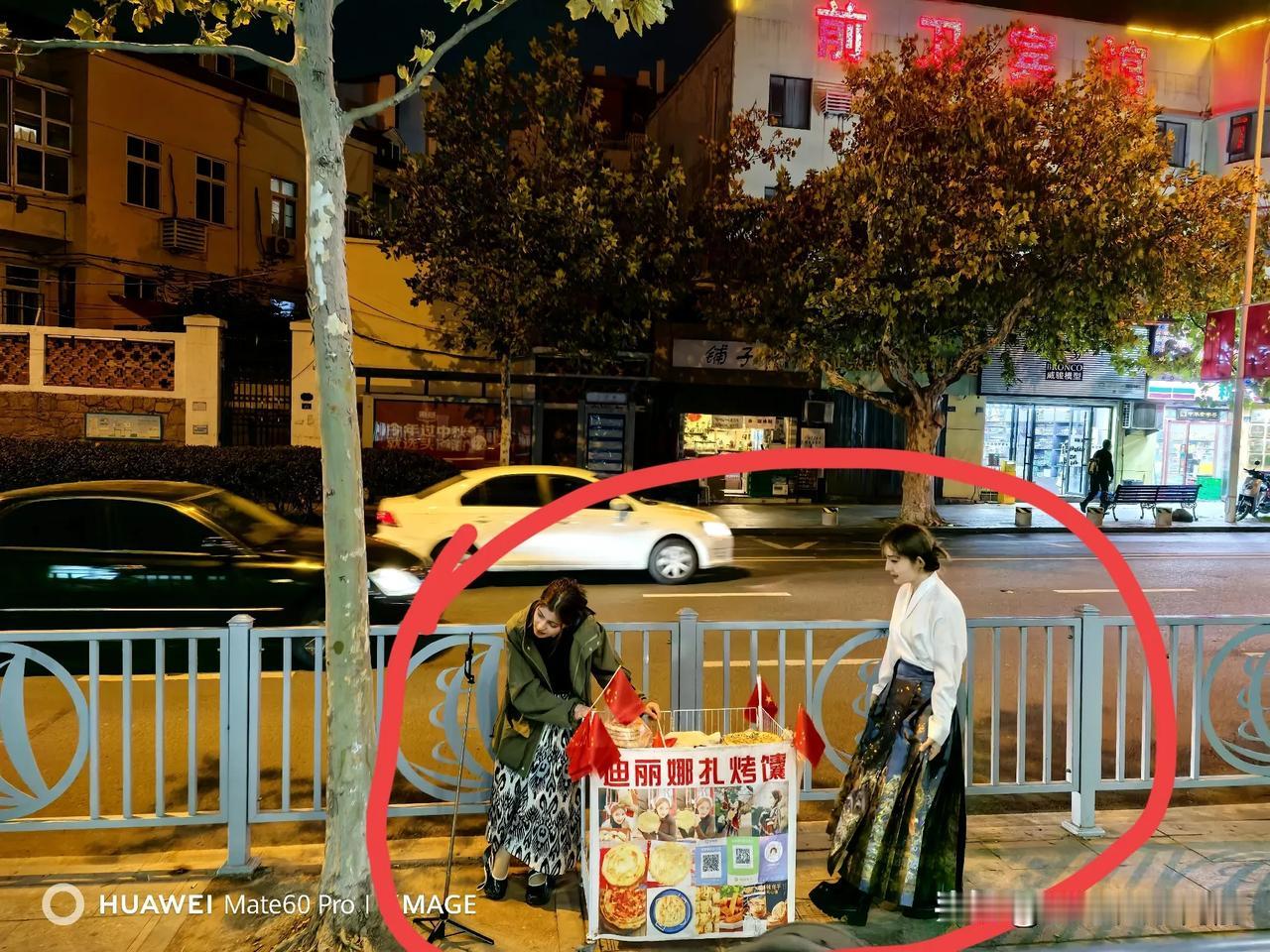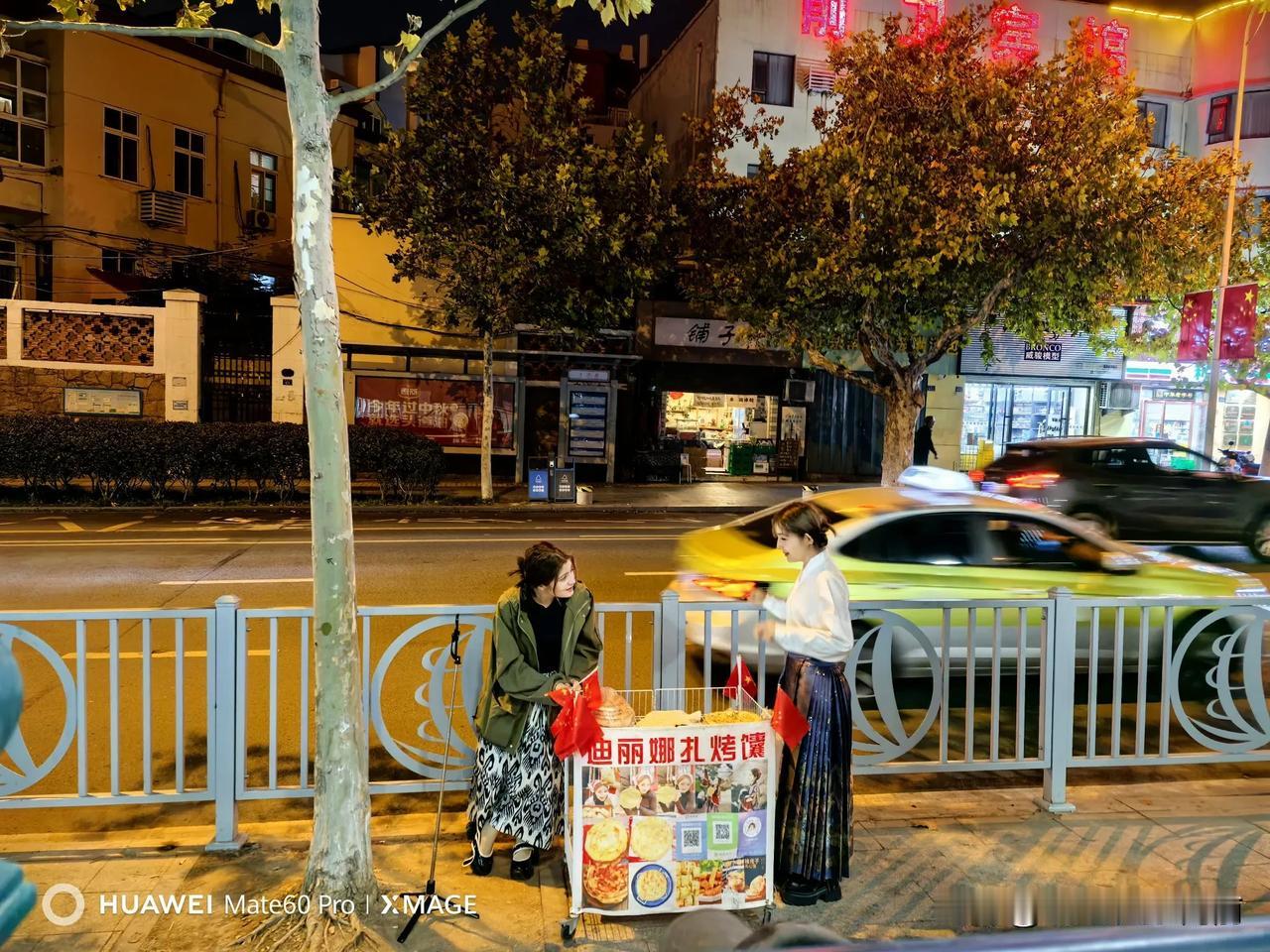 今天晚上7点我在青岛莱阳路上,遇到了两个穿着时尚的新疆美女,正在一边直播,一边卖