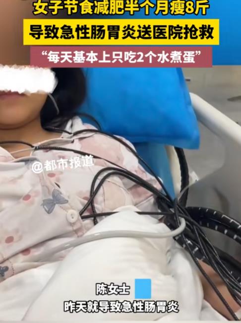 信息来源:都市报道,2024年7月16日,《女生节食减肥半个月瘦8斤,导致急性肠胃炎送医院抢救,“每天基本上只吃2个水煮蛋”》