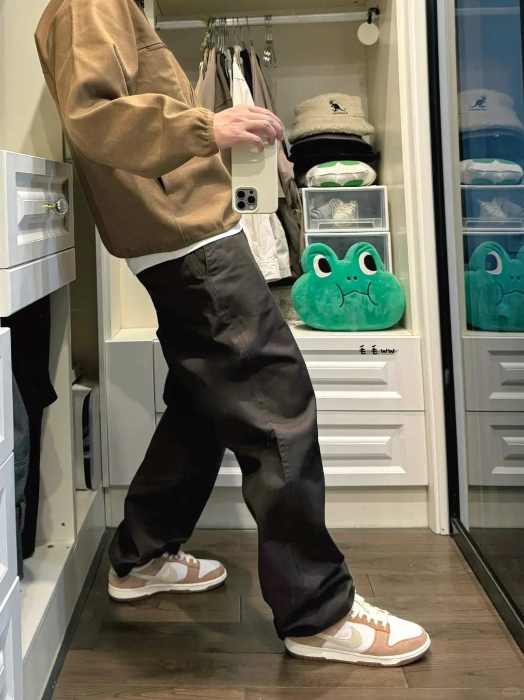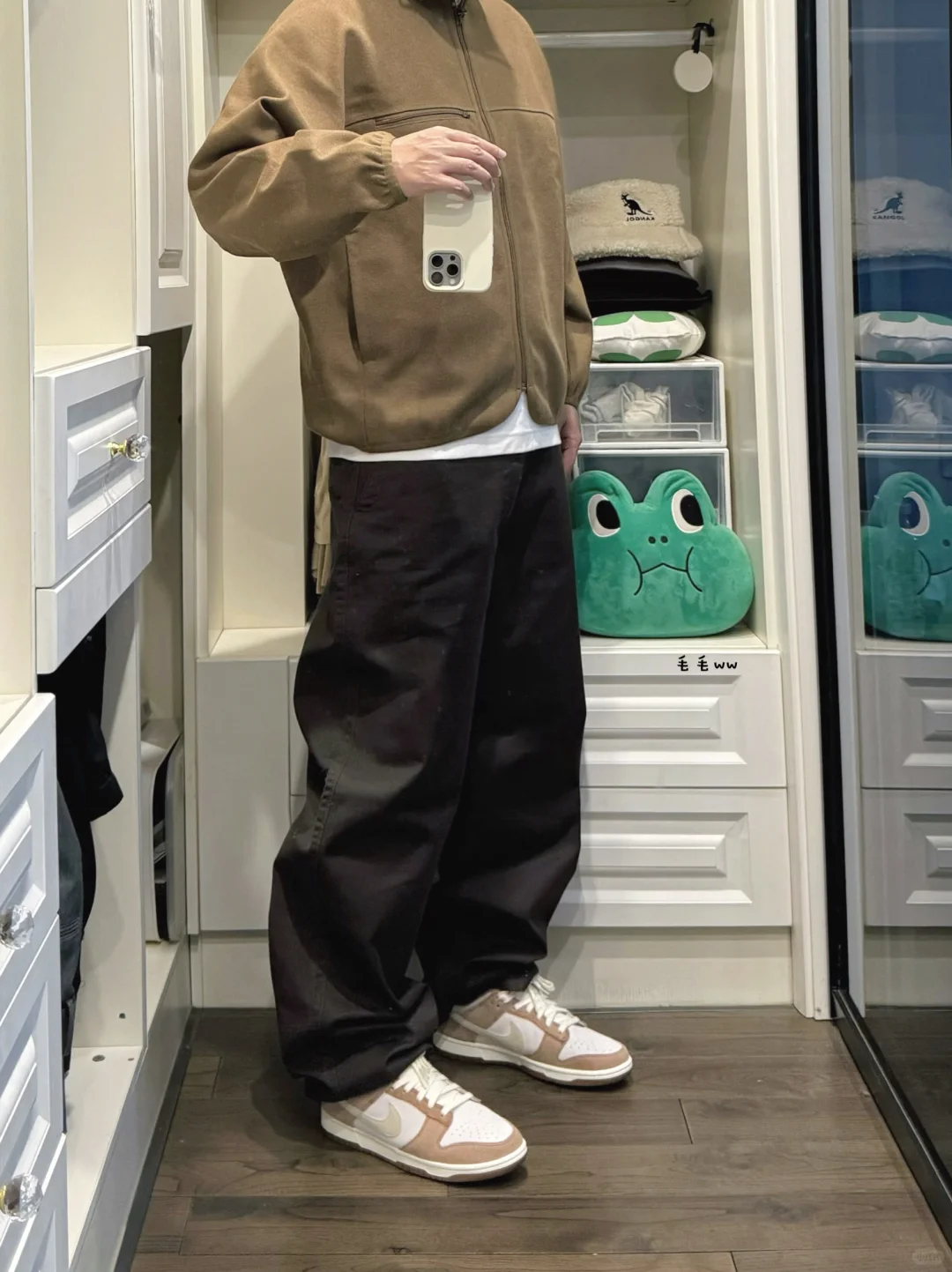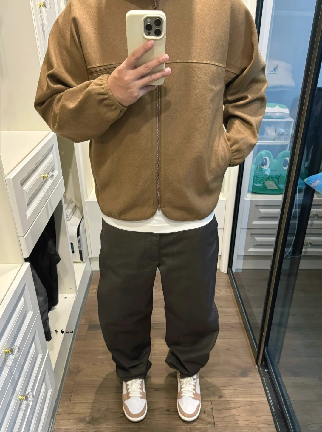 -老干部夹克,每年U系列好像都会有,特地选了卡其棕,实物偏驼色,看看是不是真的老气 . -夹克版型是偏短瘦,合身效果看起来比较干练,搭配无褶直筒裤(黑褐色),整体感觉还不错 . —————— . ✏️本人178cm75kg 球鞋尺码265mm(正常EU42) . 💭以上均为我个人观点,不喜勿喷,欢迎讨论