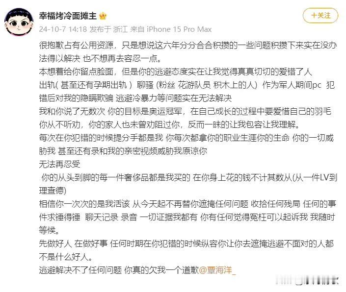 10月7日去逛了一下微博,结果发现一个重磅消息,覃海洋的未婚妻指控其孕期出轨,Pc,这也太恶劣了吧,而且是在军人身份期间。 这个女人为覃海洋买了不少的奢侈品,而覃海洋的父母也不怎么管他,而是叫这位未婚妻学会理解和忍让。 如果覃海洋真的做了这些事,那么他真的应该受到惩罚,就是要曝光这样的人。 支持这名女子维权。 #覃海洋未婚妻发文了#