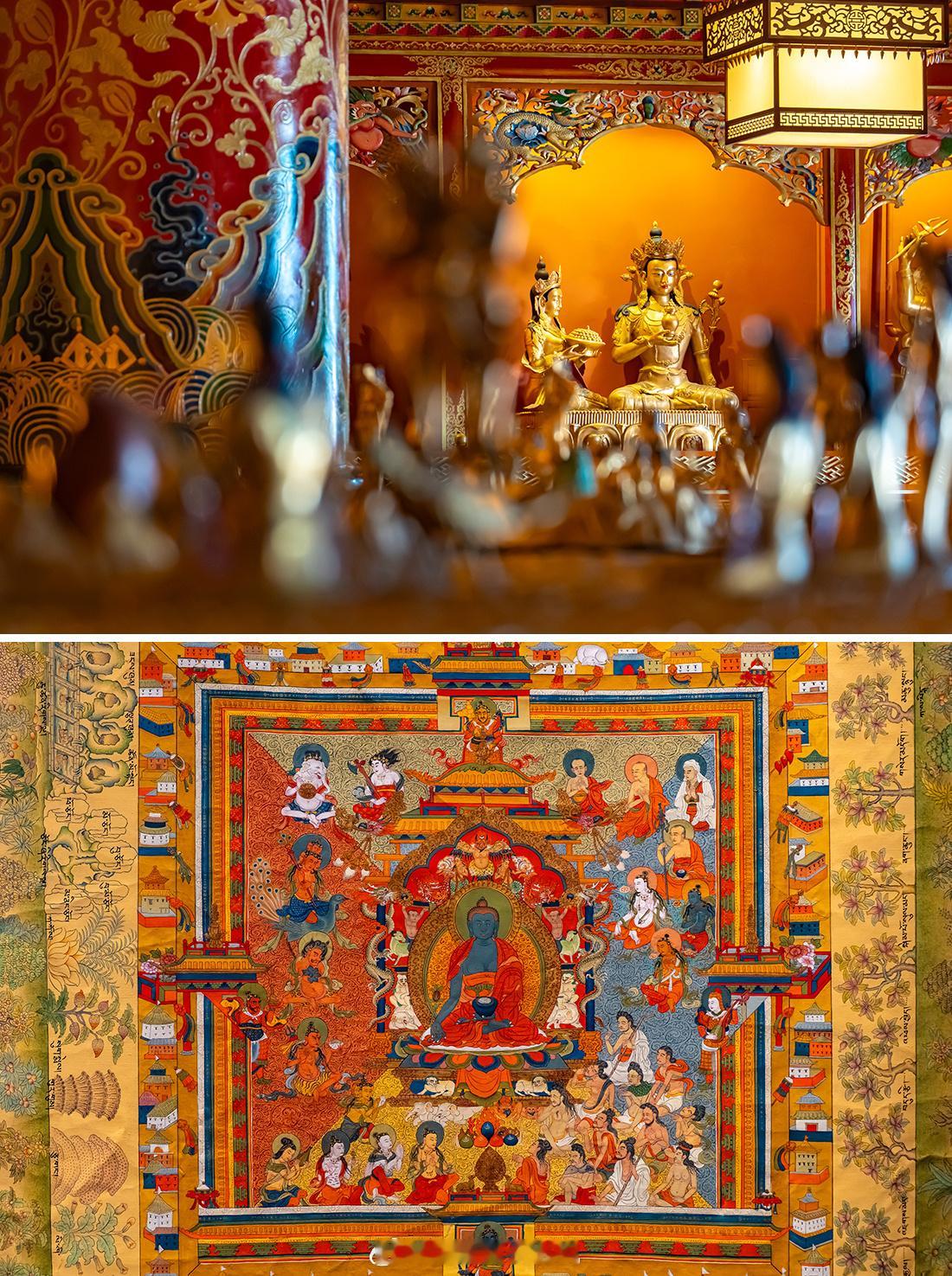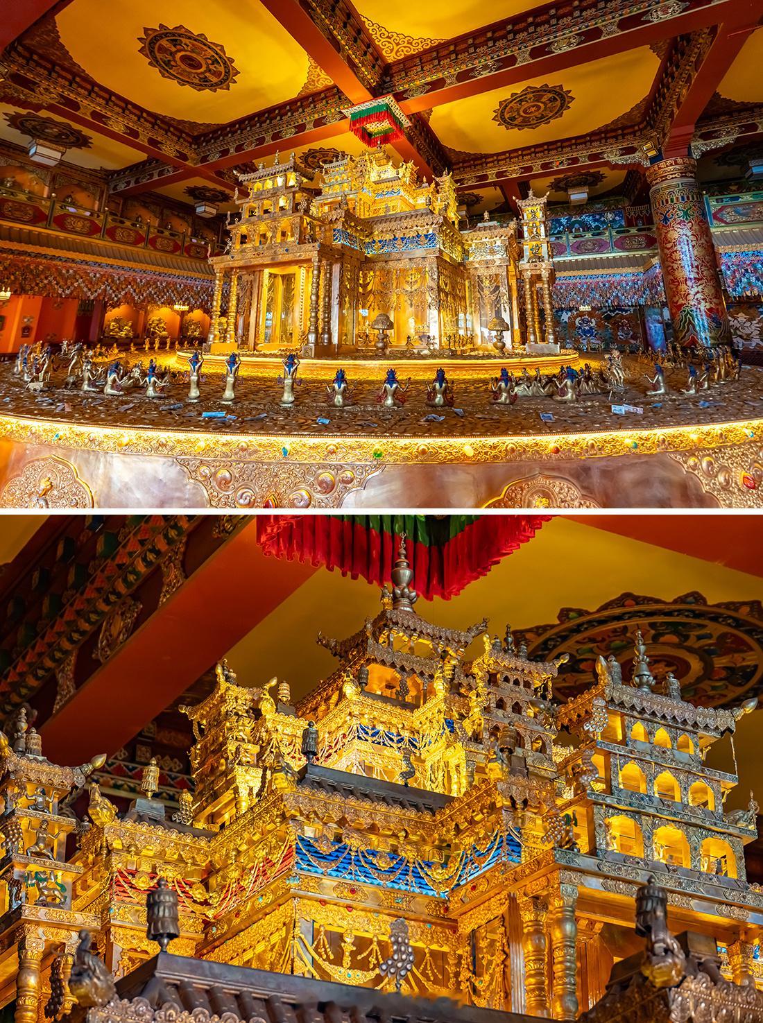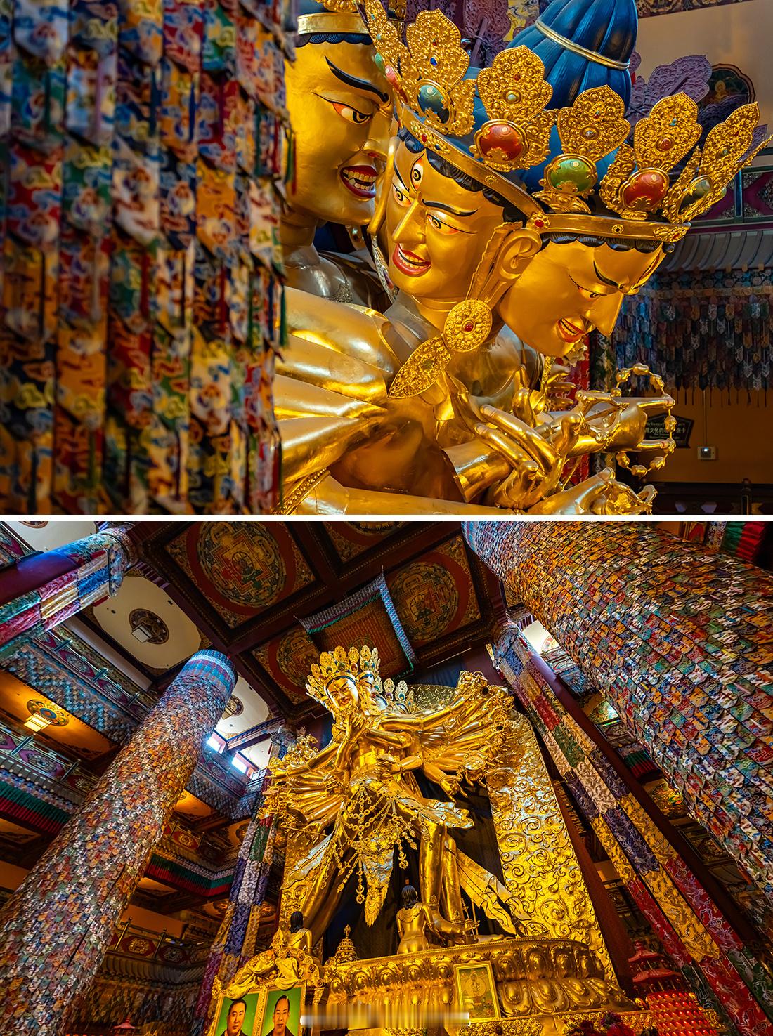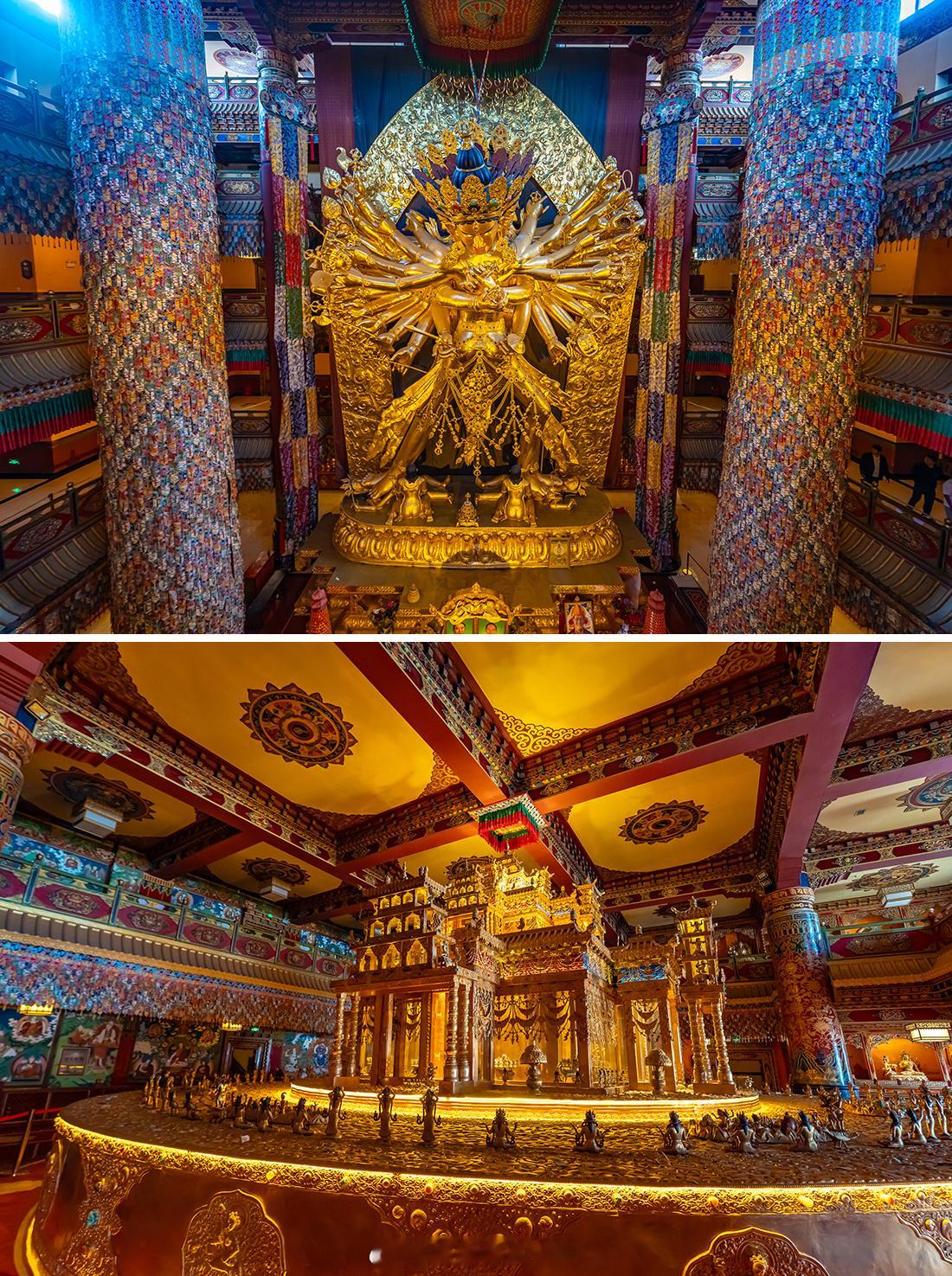 这座立体坛城,工艺繁复,规模宏大,高60.4米,共11层,顶部是白塔式的金顶,是迪庆藏式地标性建筑。步入坛城内部,仿佛穿越至神秘的香巴拉净土。八楼还可以眺望远处的独克宗古城。