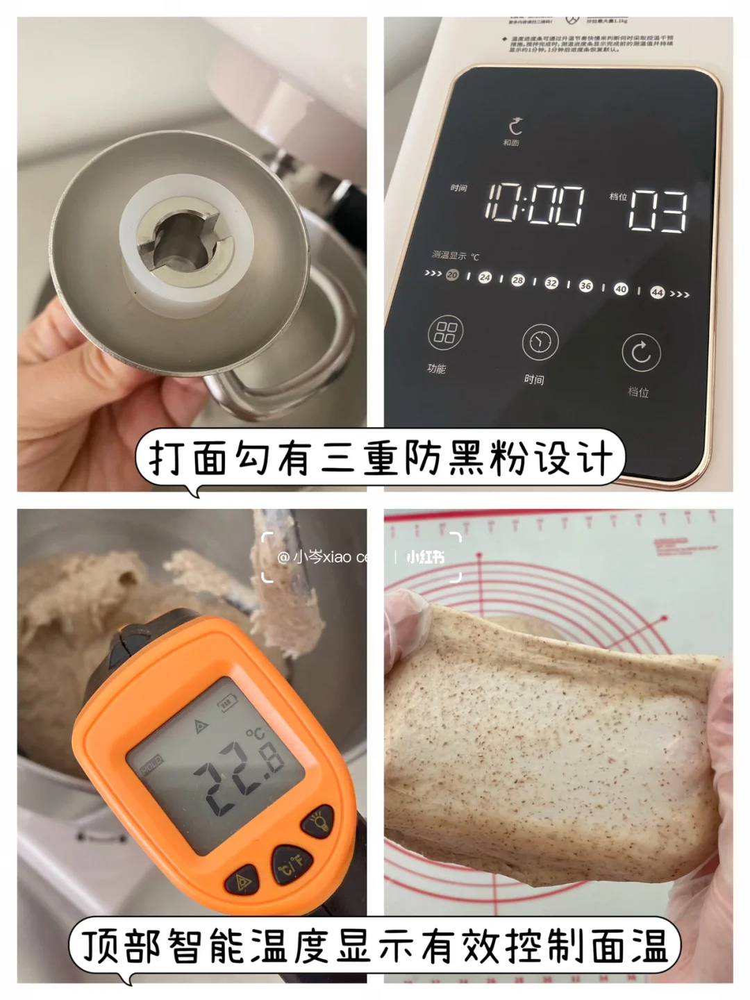 3. 准备好主面团材料;放入华伦测温厨师机揉面桶中,先低速再高速揉面,揉至扩展阶段;这款厨师机,6L大容量,还可以实时探测面团的温度,控制面温更方便了;