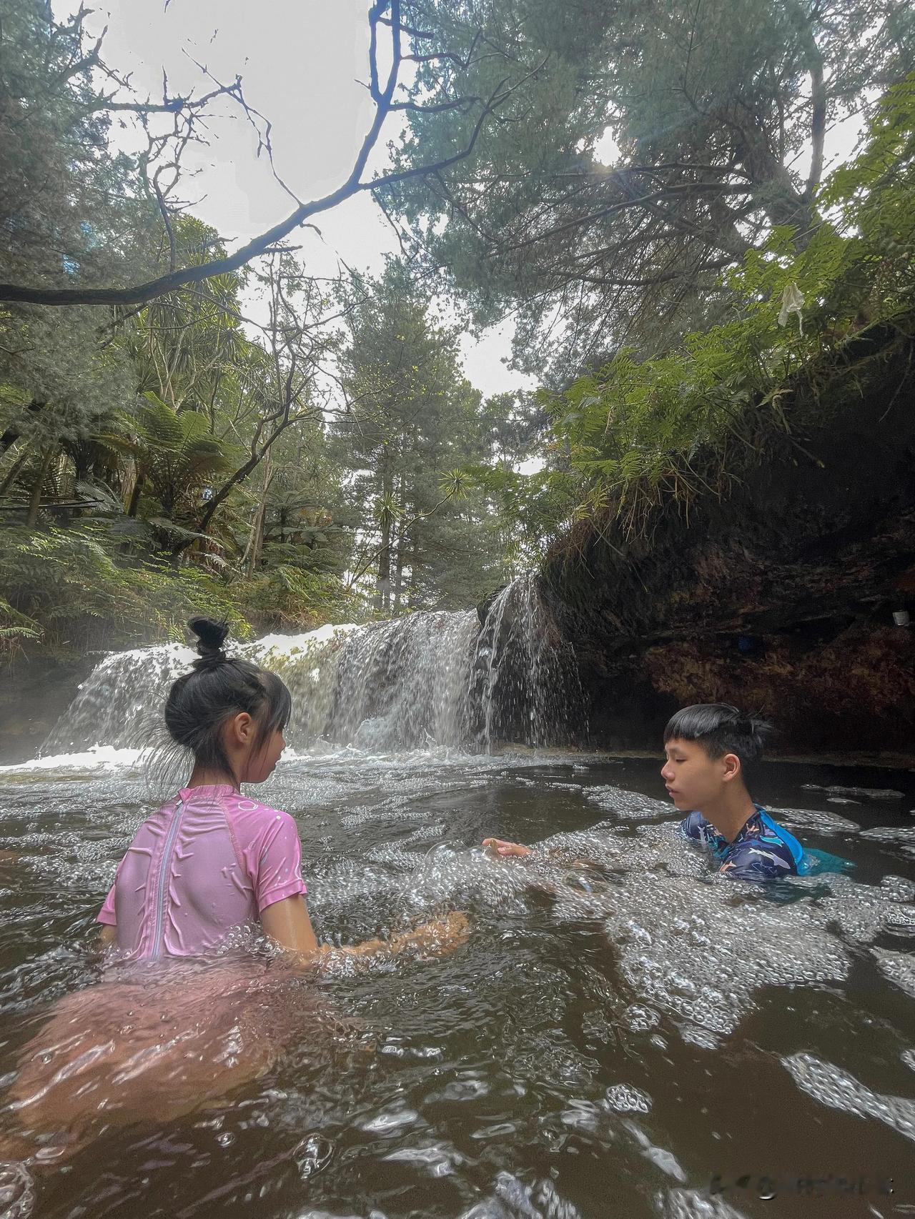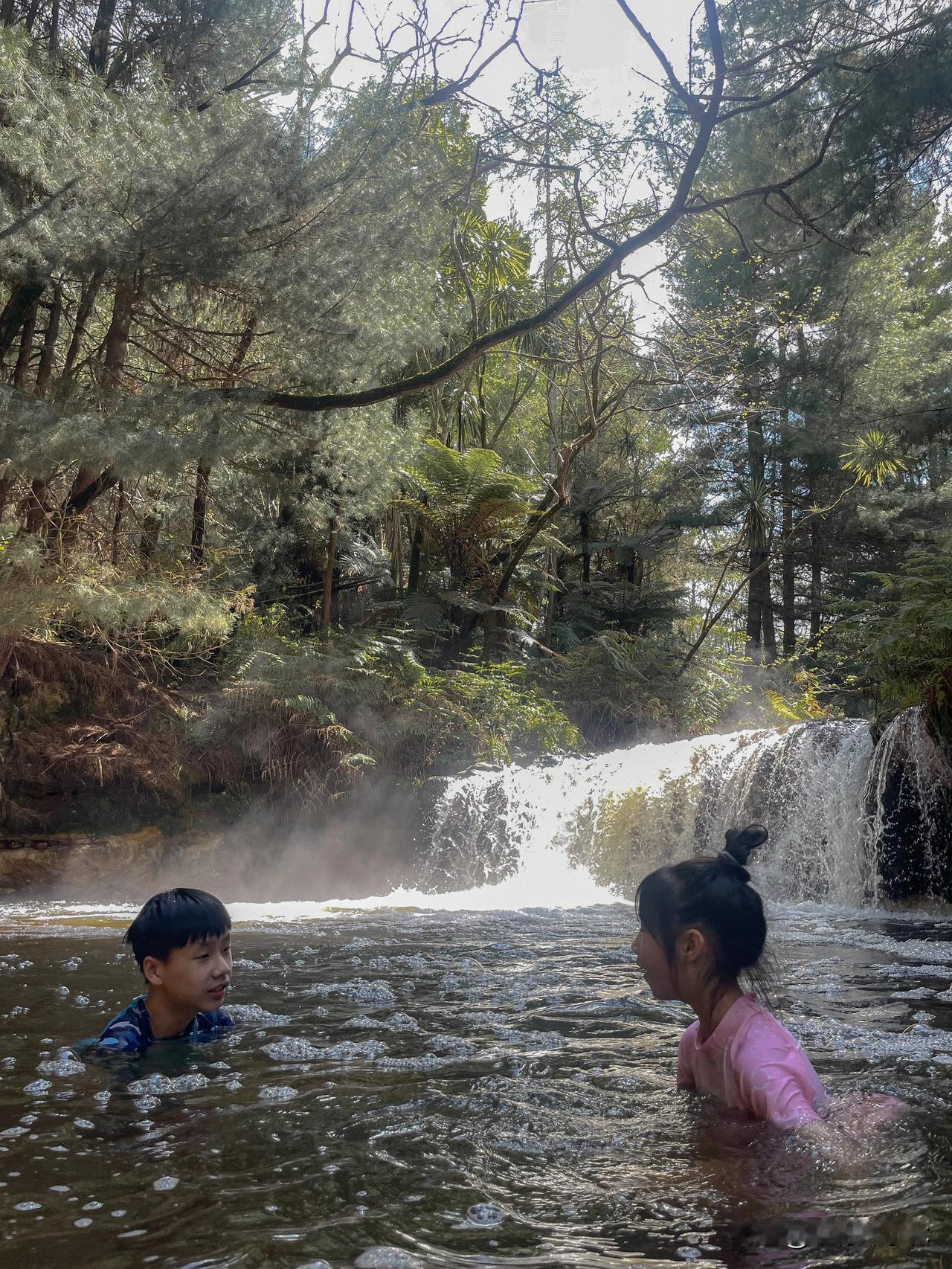新西兰移民进行中 第203天 今天天气不错,我又休息,就带孩子们去泡温泉,罗托鲁瓦的野温泉♨️ Kerosene Creek藏在森林中,一般只有本地人才会来,我们到的时候人非常少,最多也不超过5个。 整条河流是温温的,大概36-37度。我们在瀑布底泡,那个位置比较暖和,河中的沙子是热的,越靠近瀑布越热,应该地热就是从这里出来的。河流冒着烟雾,有种置身仙境的错觉,挺好玩的。 就是设施没啥,有一个简陋的厕所,建议换好衣服再走进去。