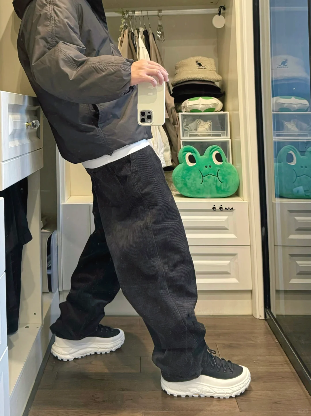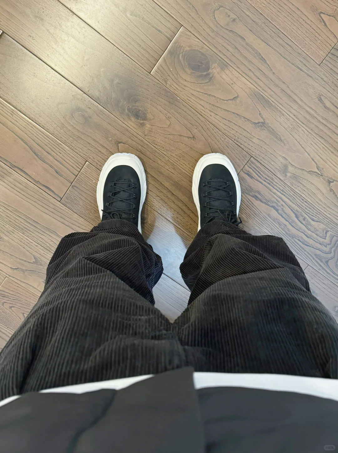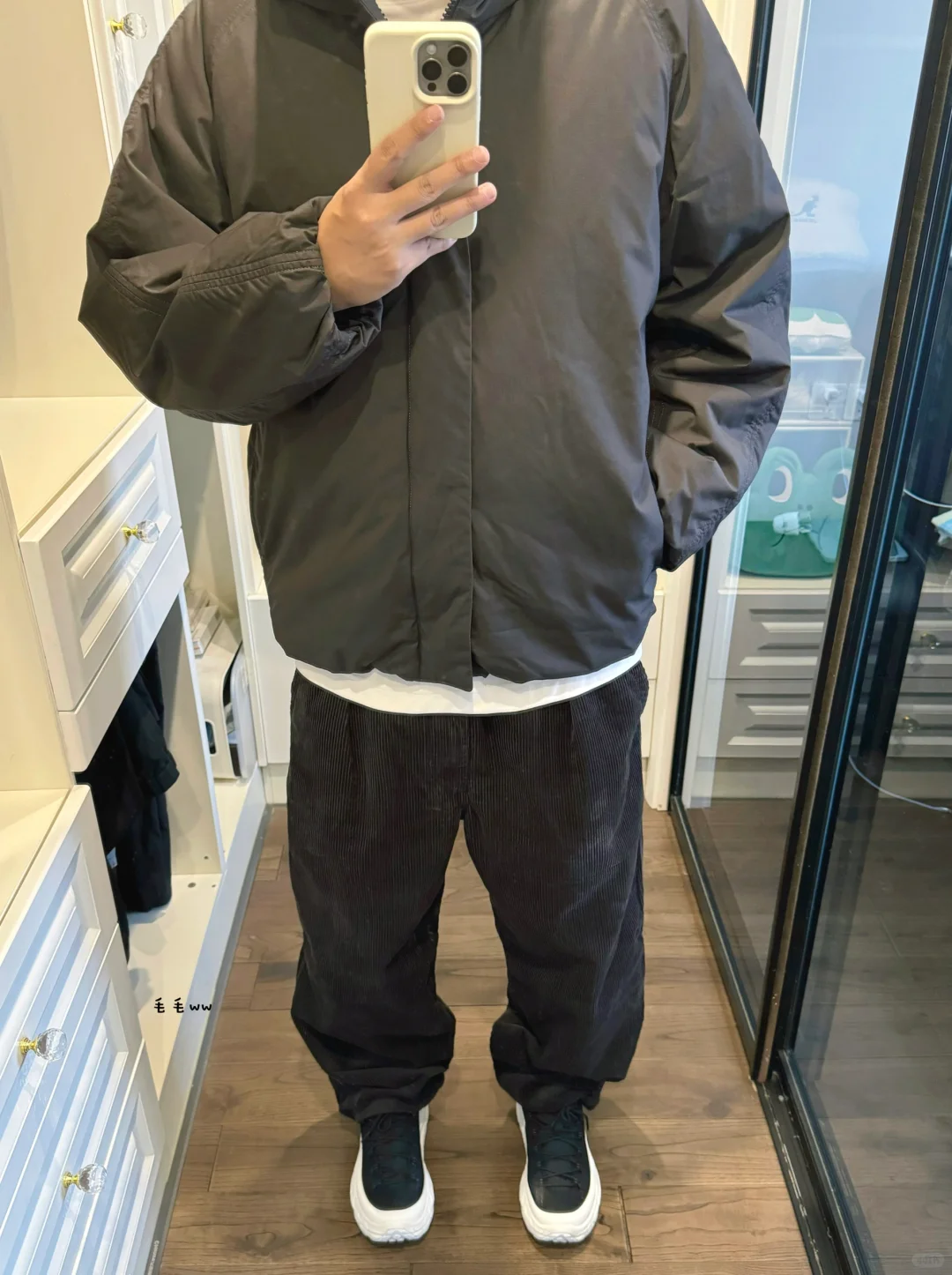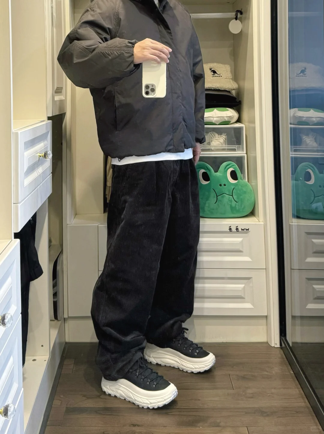 -小时候觉得灯芯绒老气,上学都不爱穿,由于这种材质容易磨损,轻易就显得老旧 . -长大后又因为这份复古感重新认识了它,适合气候的保暖性,宽松的阔型穿着很chill . -穿来穿去还是黑白灰三色耐看,这类极简风不管上学还是上班都没问题,适配人群很广 . —————— . ✏️本人178cm75kg 球鞋尺码265mm(正常EU42) . 💭以上均为我个人观点,不喜勿喷,欢迎讨论
