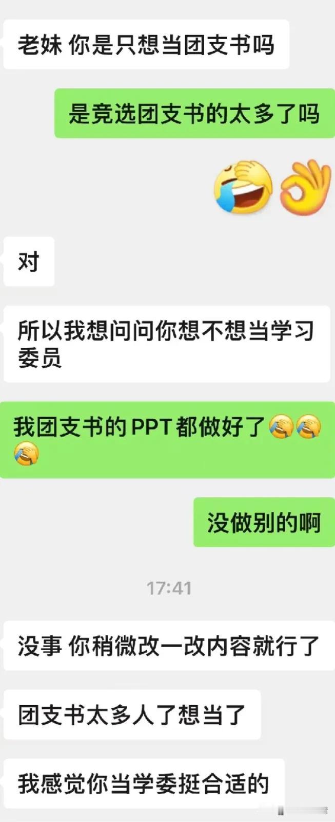 大学是个小社会,明争暗斗少不了 我侄女高中时候学习不算强,读了个二本大学,在大学她担任了班级团支书的职务。通过负责一些班级工作,联系老师和同学,确实提升了自己的为人处事能力。 另外侄女觉得自己作为班干部,很多同学都盯着她的成绩呢,如果自己学习不好的话会被同学瞧不起,于是她暗暗努力学习,各科成绩在班里也是名列前茅。 大学四年,侄女拿了好多奖状,获得了各种奖学金,入了D,后来还考取了别的学校研究生,硕士毕业之后进入三甲医院工作,可谓逆袭成功。 现在好多大学生和家长们都意识到了当班干部的重要性,于是开学之初,新生们纷纷摩拳擦掌,都想争取干点职务。 我同学表哥家的闺女今年刚刚上大一,她也想当团支部书记,简称团支书,据她说这个职务的竞争非常激烈。 新生入学的时候,会有上一级的学生来带领他们军训,讲解一些相关知识,称为带班学长。这个带班学长已经在大学待了足足一年,颇有些老油条的味道。 手中有点小权力,这个学长就想用一下。他会和某些管事的人提供一些建议,比如推荐某同学为班干部。 这个学长虽然知道侄女想当团支书,但是他恐怕自己有了相中的人,于是他就劝侄女放弃团支书,竞选别的职务,比如学习委员之类的。 学习委员为同学们服务,收作业什么的,也能锻炼到自己的能力,但是这职务的重要性比起来团支书好像略逊一筹。 聪明的侄女看透了这一些,她就来问我怎么办,我告诉她,努力写好自己的演讲稿,在竞选班干部的时候,讲得出彩,真诚表明自己的心意,争取获得同学的的支持,拉到多一些选票,争取竞选上自己心仪的职务。 话说现在的学生们真是精明,啥都看的很透彻,这么一比较,我上大学的时候简直就是个傻子。 #记录今日心情#