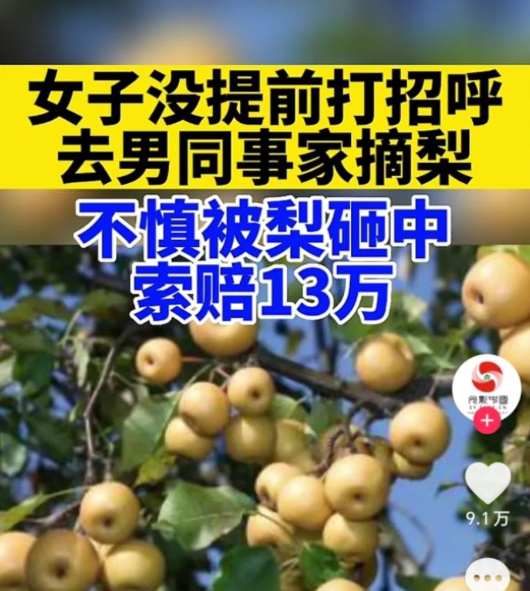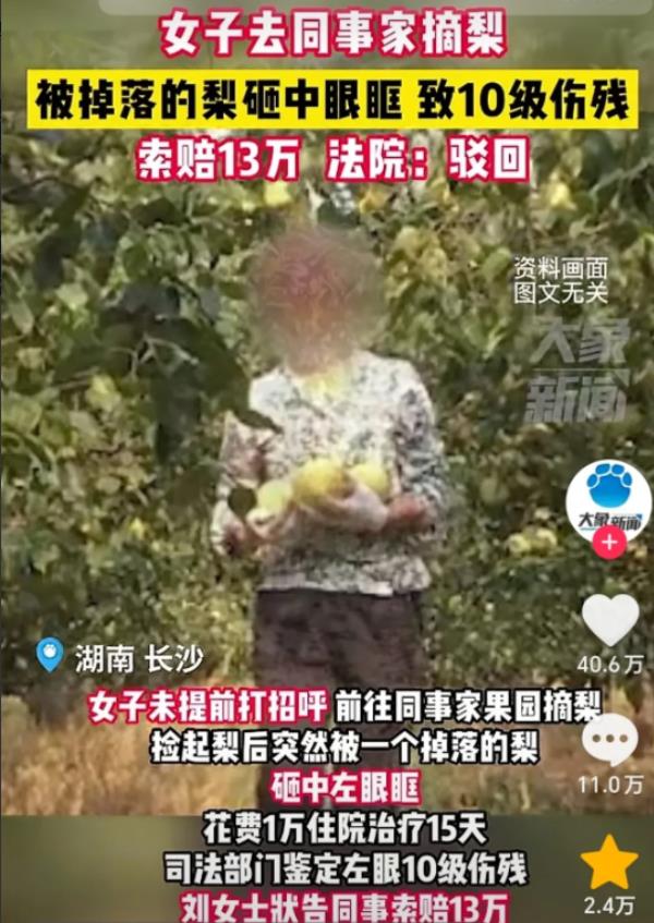 湖南,女子在未告知的情况下,去男同事家摘梨子 。同事不在家,其妻帮忙打梨子。女子却被掉落的梨子砸中左眼眶,住院15天花费1万,男同事送去4000元。女子出院后竟要求男同事赔偿,被拒后做了10级伤情鉴定,把男同事告诉法庭,索赔13万,最后法院这样判了!
