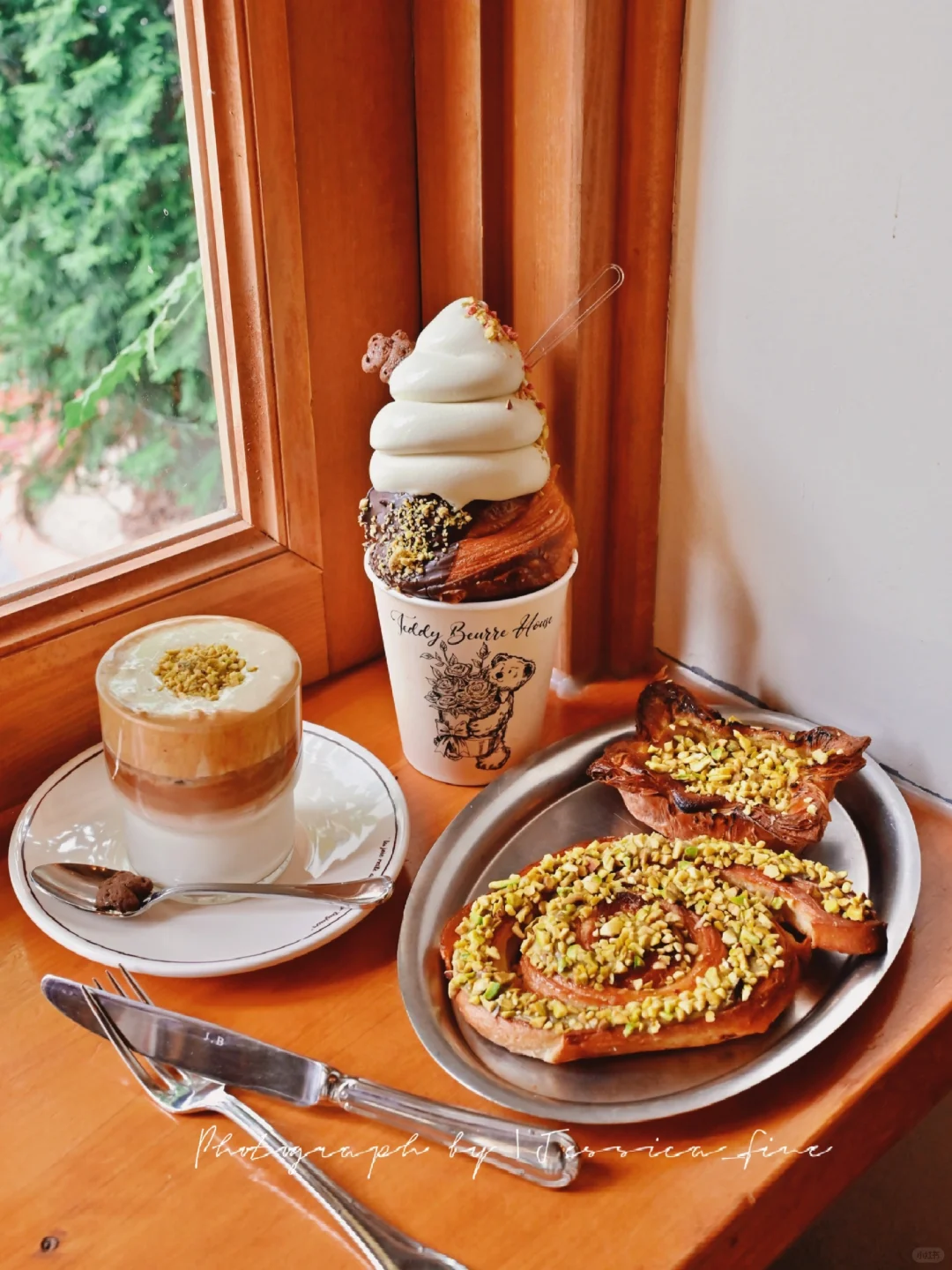 开心果味的奶油咖啡劲还是挺大的,最近在调整状态不太喜欢喝咖啡了,圈圈形状那个起酥面包开心果果酱含量也很大,吃多了会有一点点腻[叹气R]