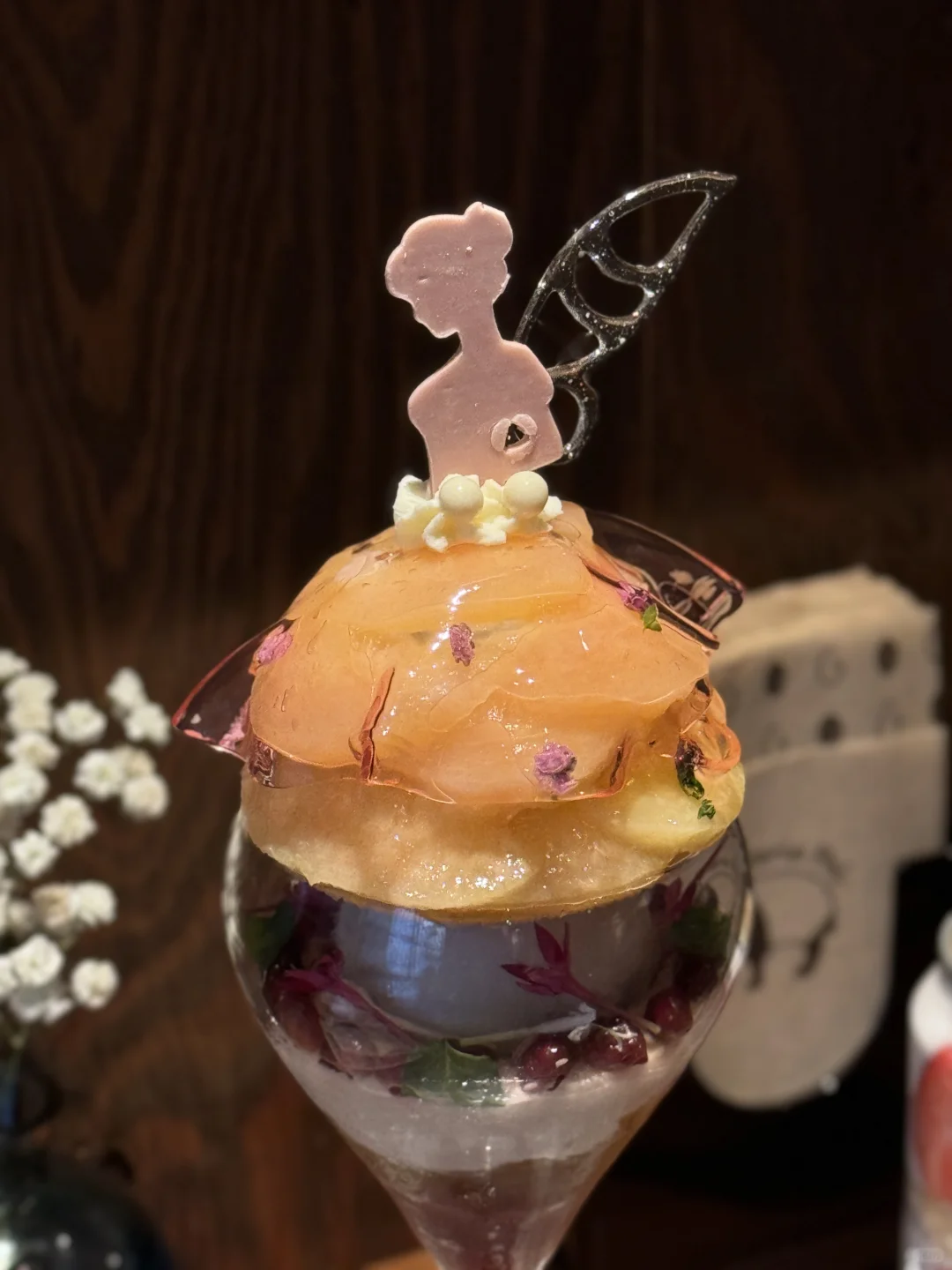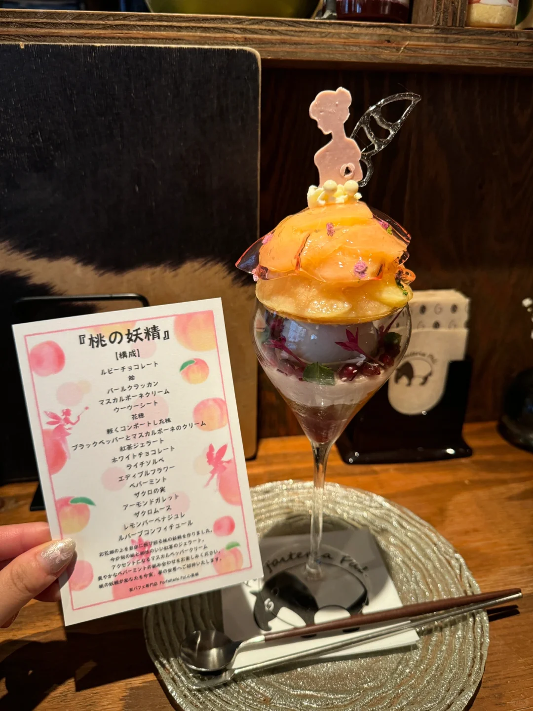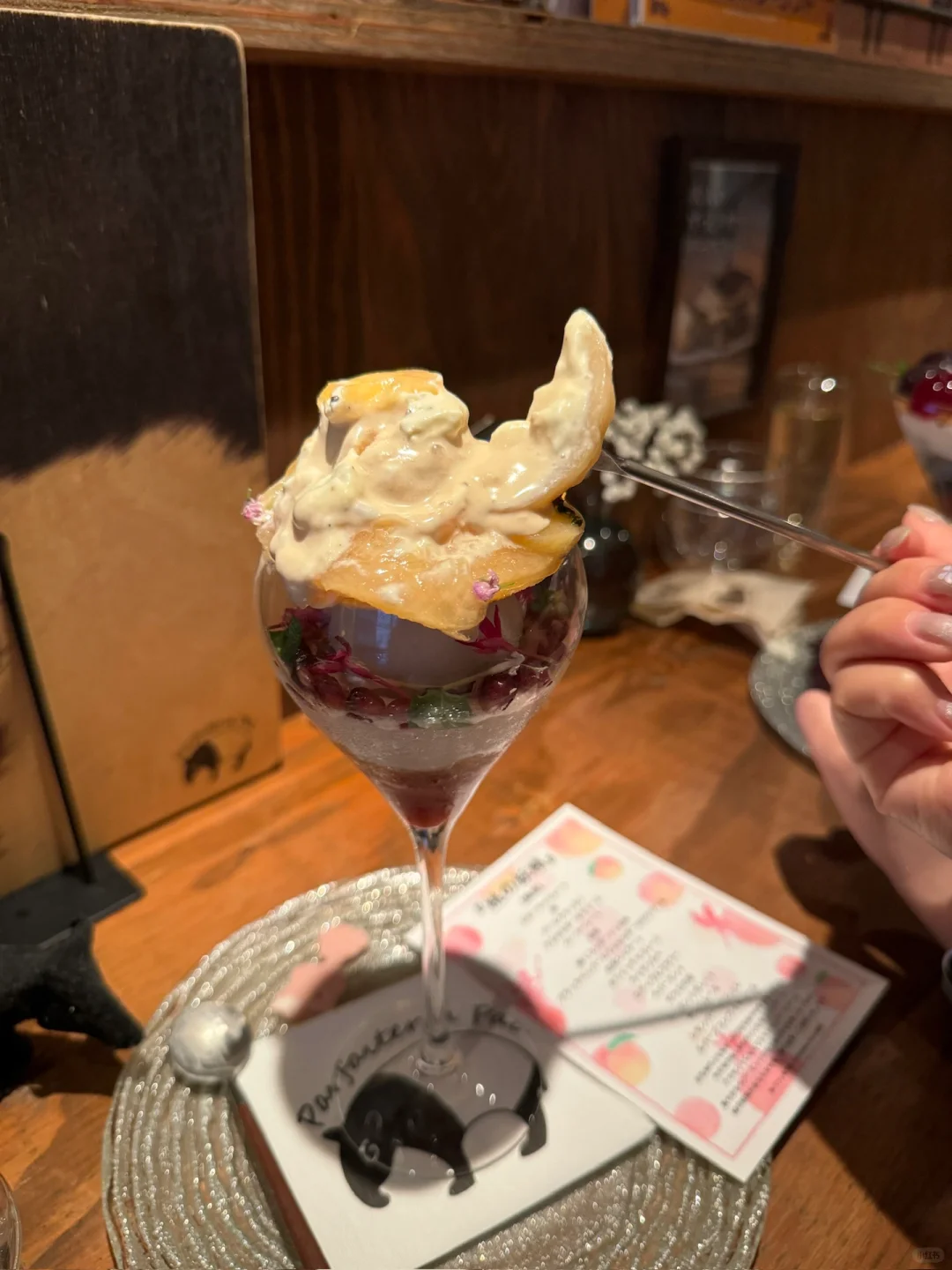 点了一个水蜜桃🍑芭菲 做成了花仙子的感觉 散发着蜜桃香味 冰淇淋是红茶口味 搭配了十几张食材 每一口都是惊喜