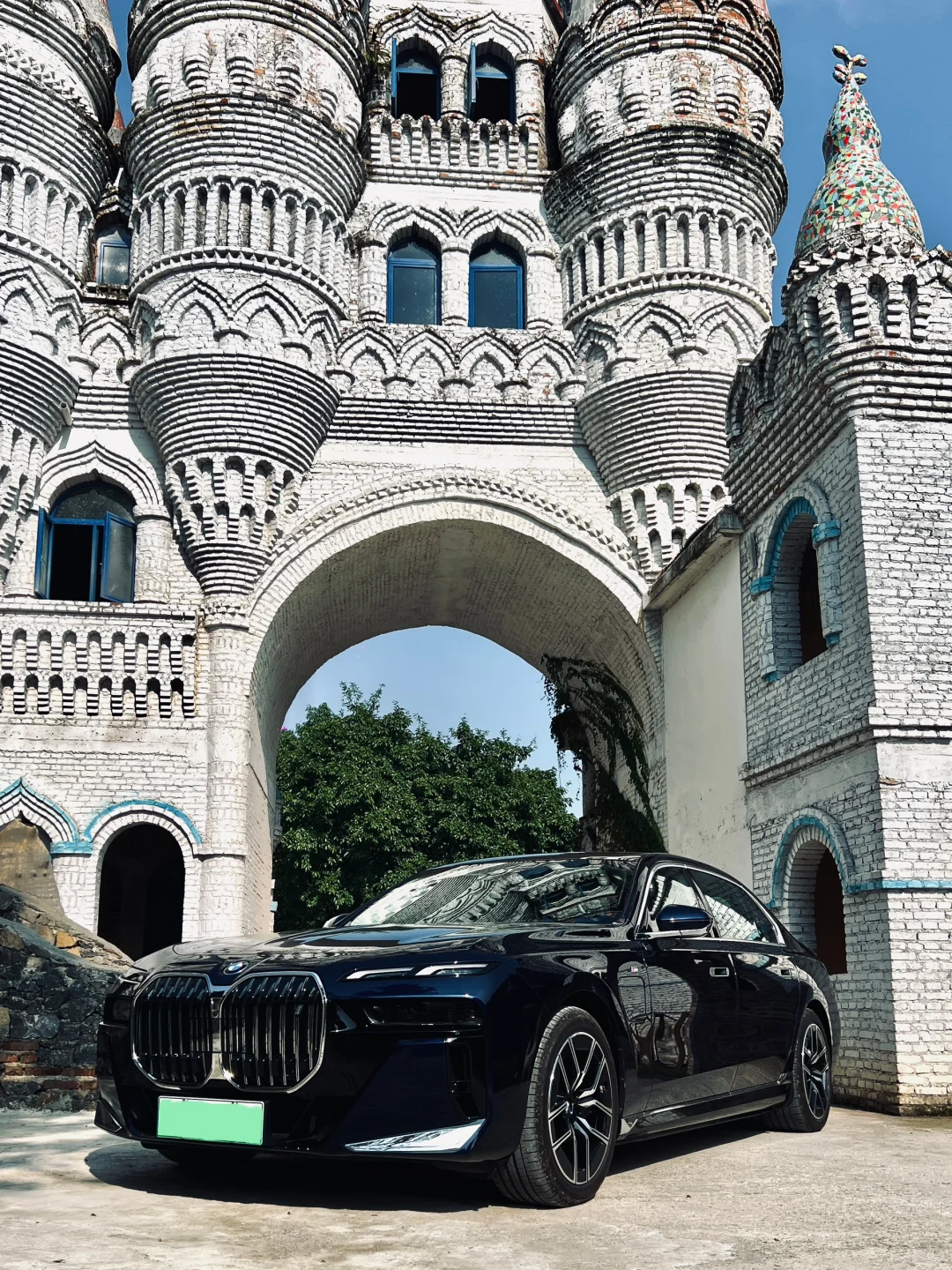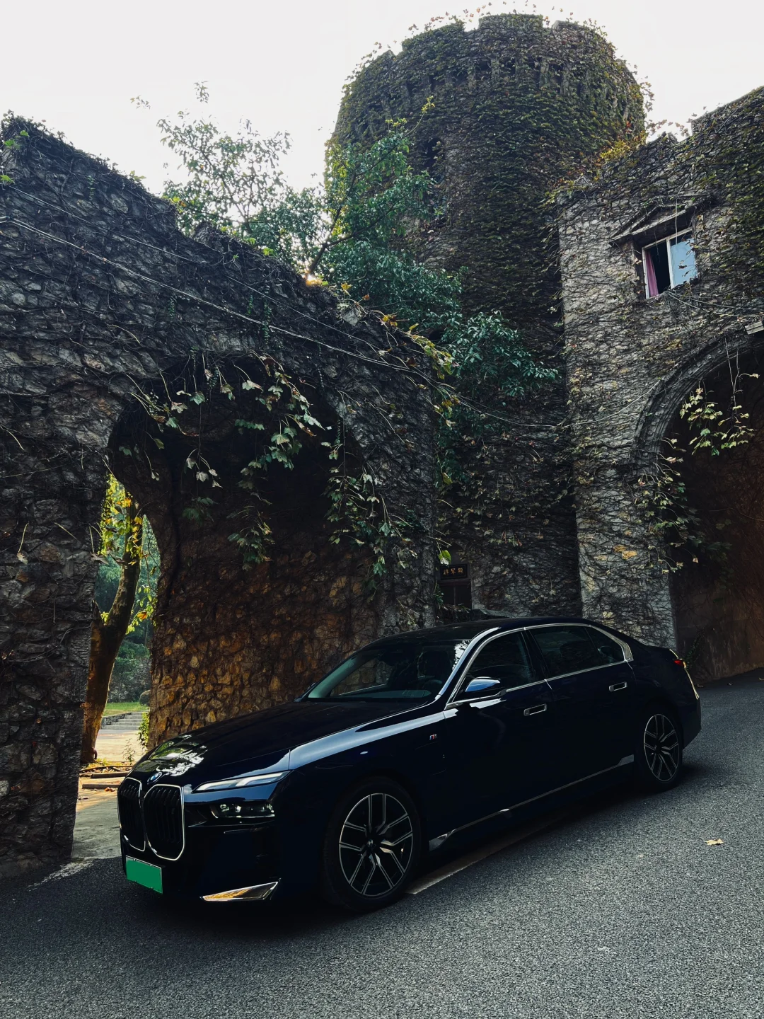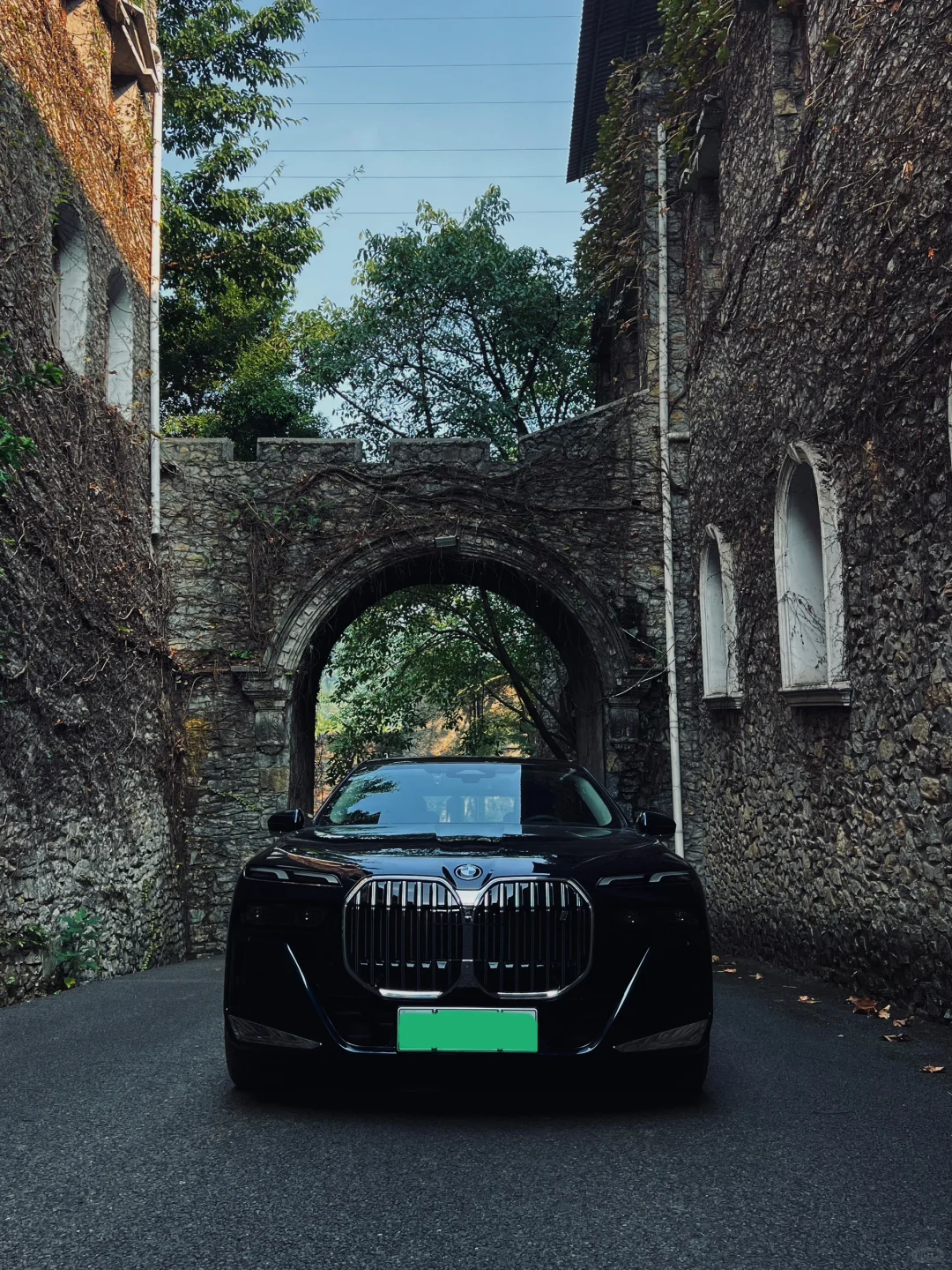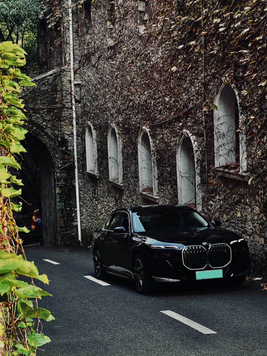 当纯电动BMW i7沿着道路平稳驶向傍晚中的古堡时,纯粹驾驶乐趣油然而生..