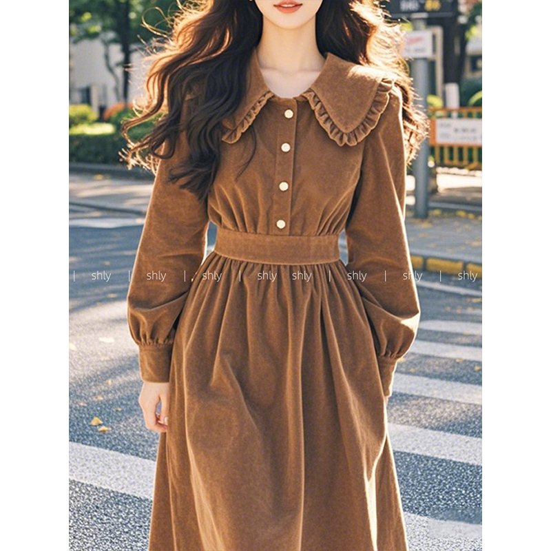 名媛高端小洋装法式棕色灯芯绒连衣裙子