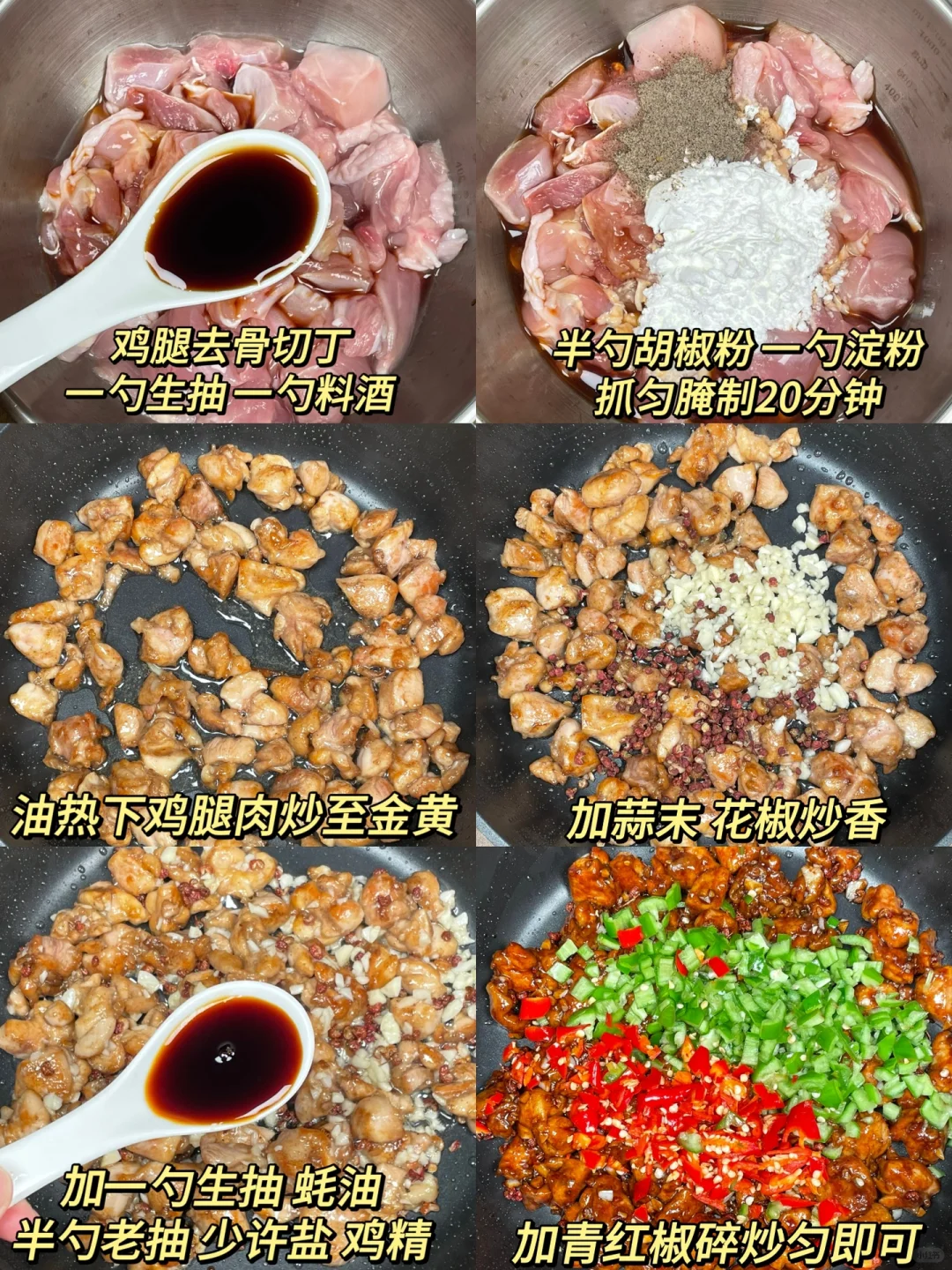 这道小炒鸡腿肉一出锅就香迷糊了,好好吃[色色R] 焦香入味的鸡腿外焦里嫩,麻辣过瘾,配米饭能炫两大碗,巨香巨好吃[哭惹R][哭惹R]一定要安排起来!! [向右R]食材:鸡腿➕花椒➕青红椒 [向右R]做法:如图所示!