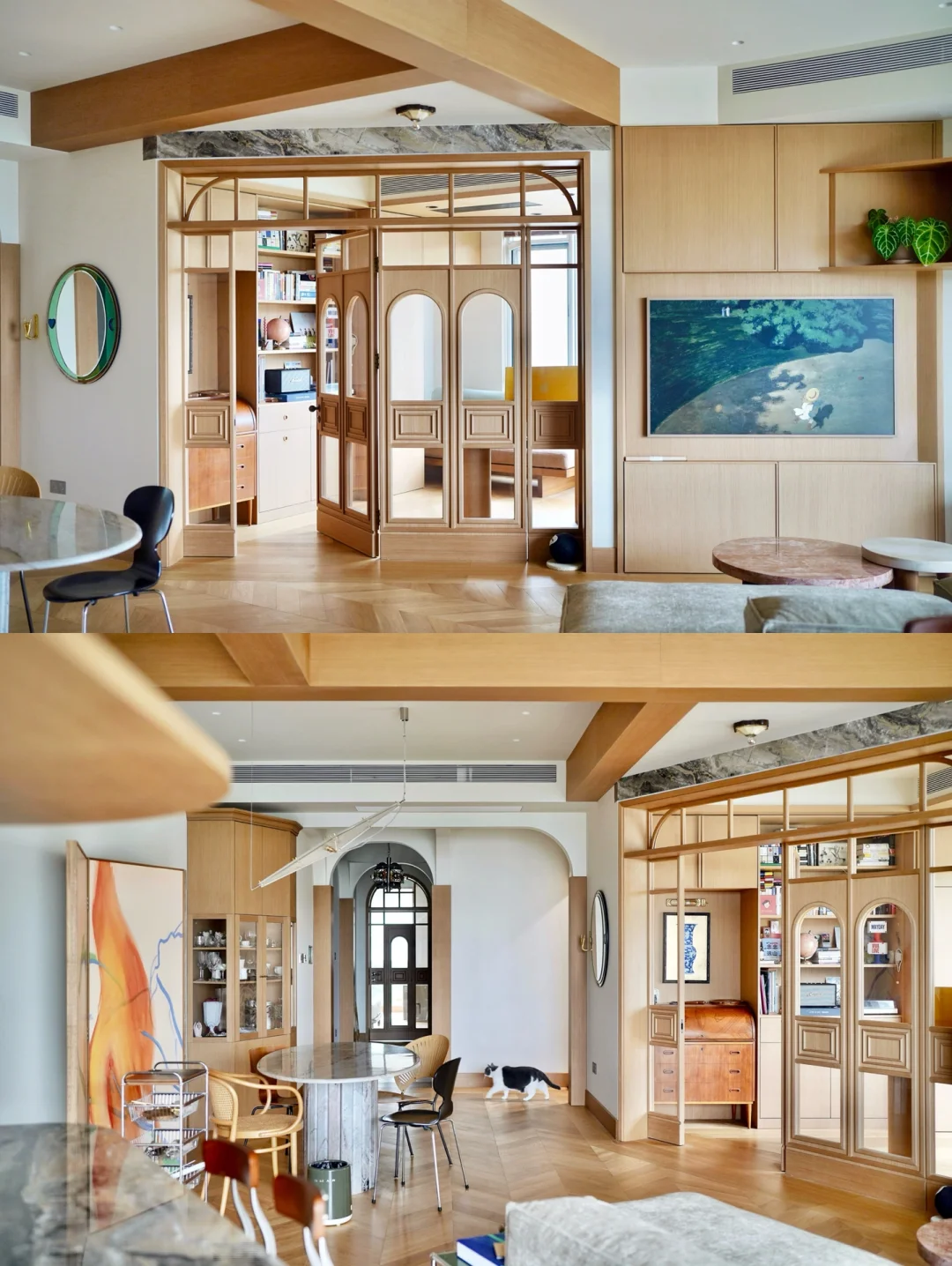 通过倾斜的书房门和异形圆弧岛台,把本身小卧室和厨房互相顶着的棱角弱化成了两条平行的斜边,整个空间柔和又流畅,也让玄关一进门看向风景的通道不再被遮挡⛰️