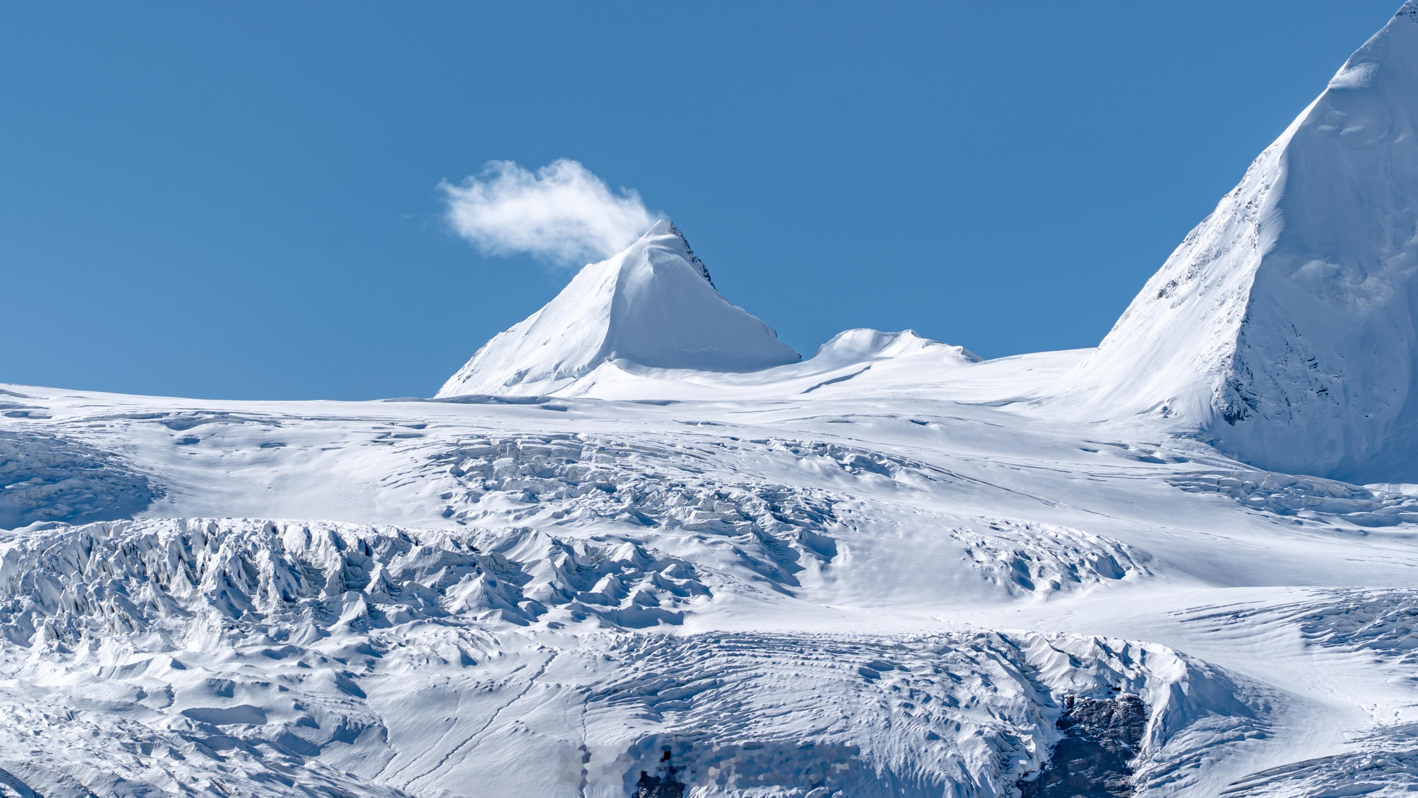长焦镜头下的萨普冰川,金字塔型的雪山傲立于冰川之上,闪耀着璀璨夺目的光芒。