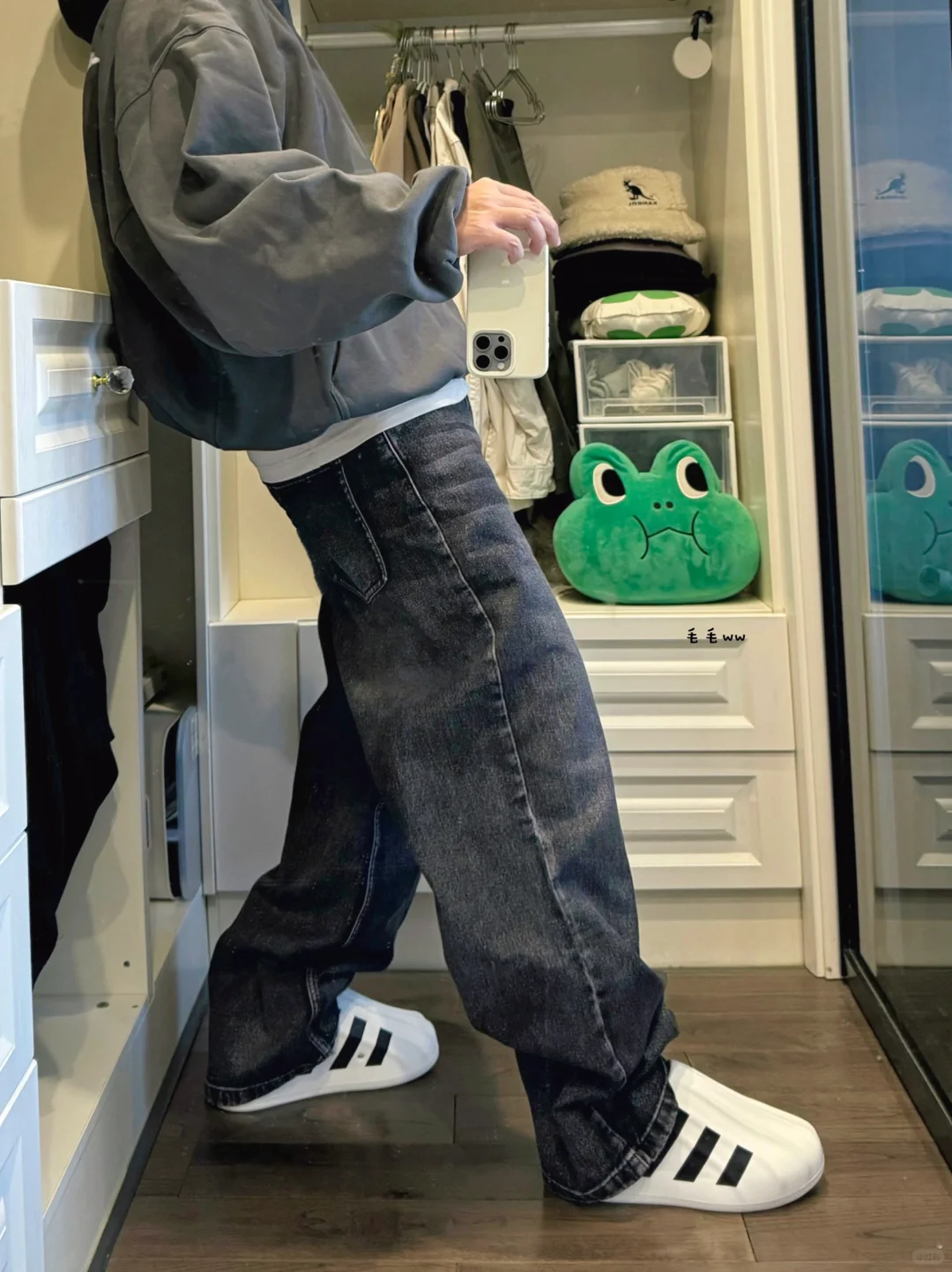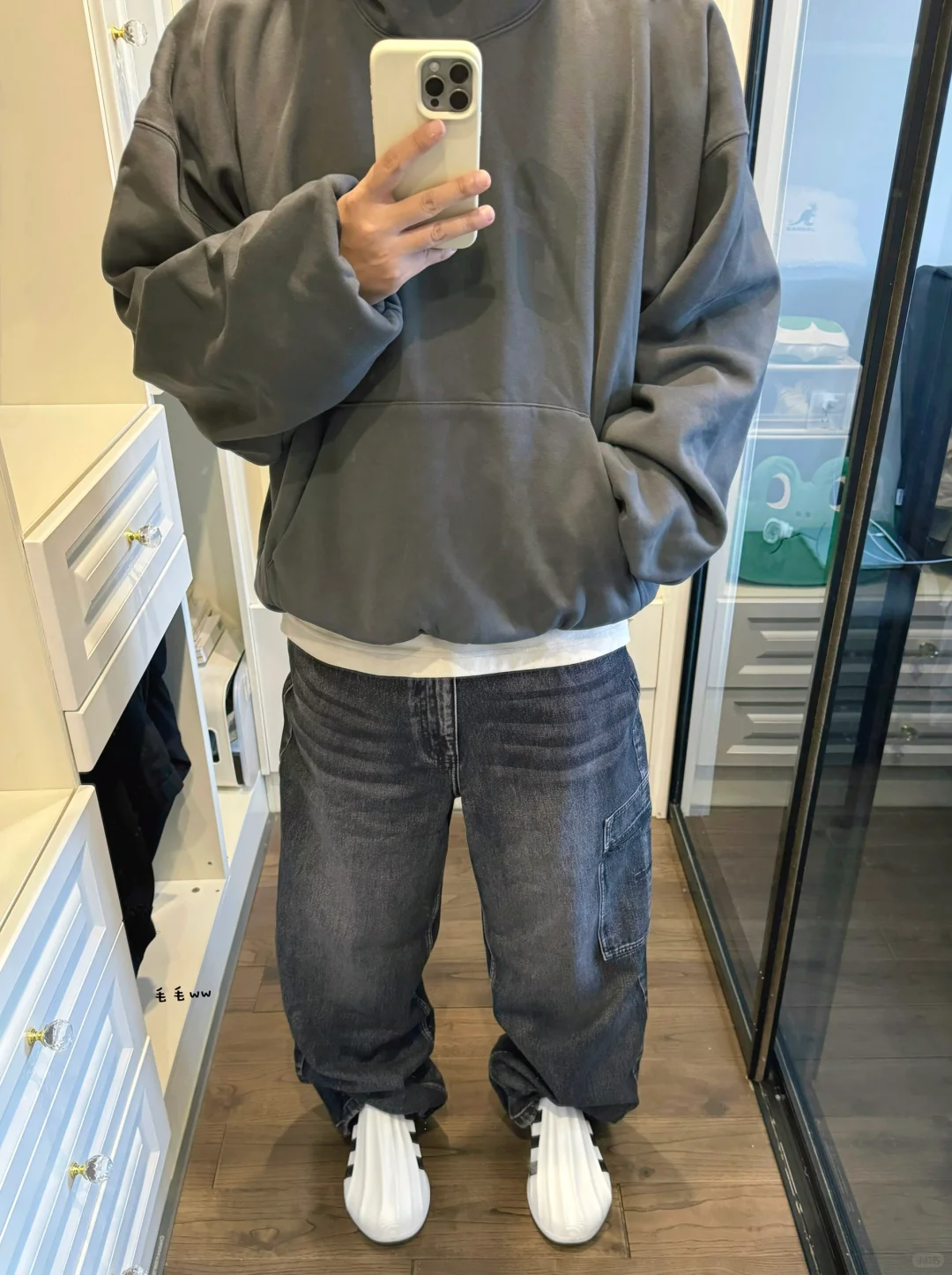 -本期来套宽松的穿搭,上下都是oversized,阔型帽衫搭配阔腿裤 . -丹宁面料不厚也不硬,牛仔裤可以很舒服,秋冬季非常容易搭配 . —————— . ✏️本人178cm75kg 球鞋尺码265mm(正常EU42) . 💭以上均为我个人观点,不喜勿喷,欢迎讨论。