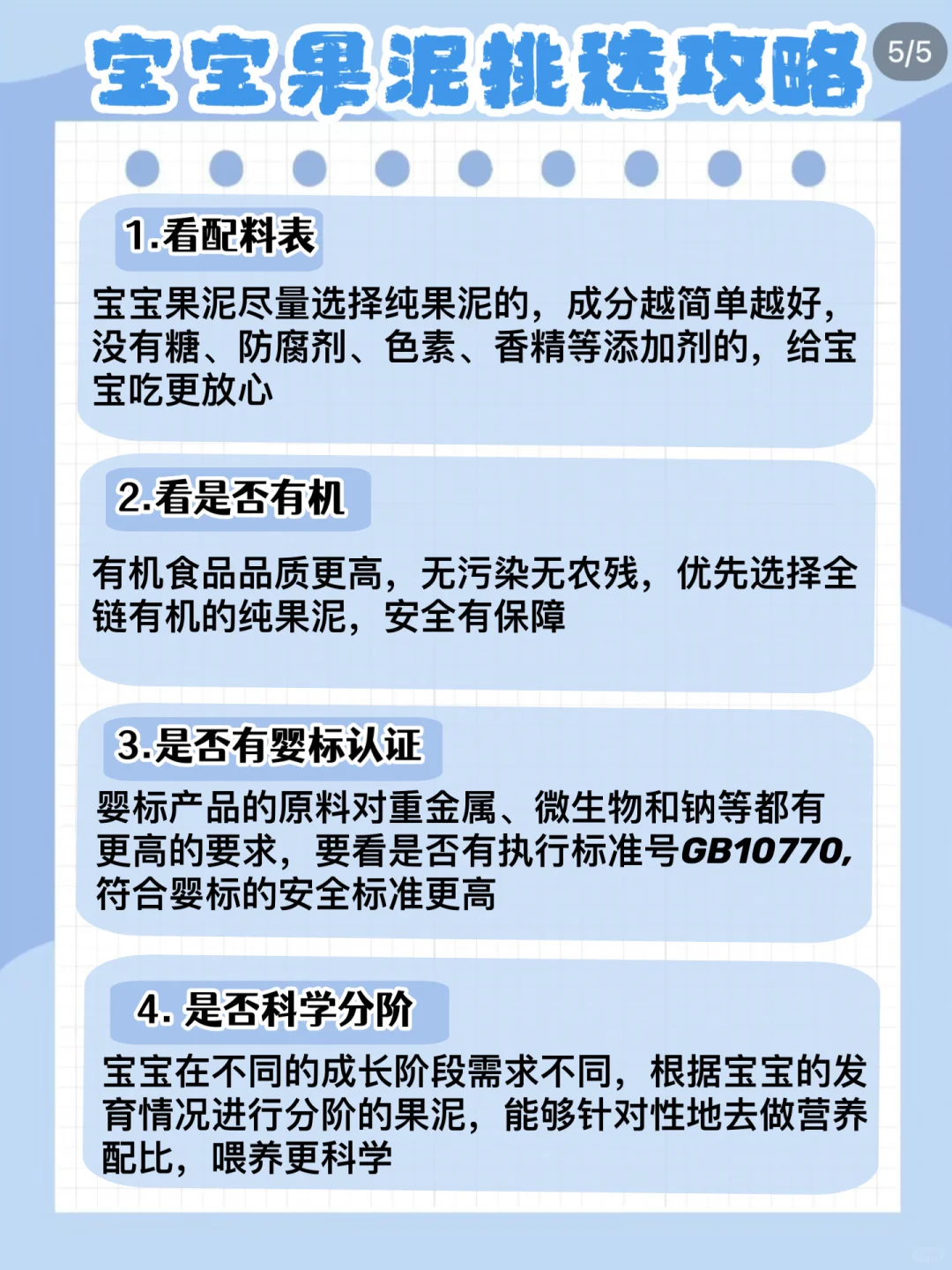 宝宝果泥尽量选择纯果泥的,成分越简单越好,没有糖、防腐剂、色素、香精等添加剂的,给宝宝吃更放心