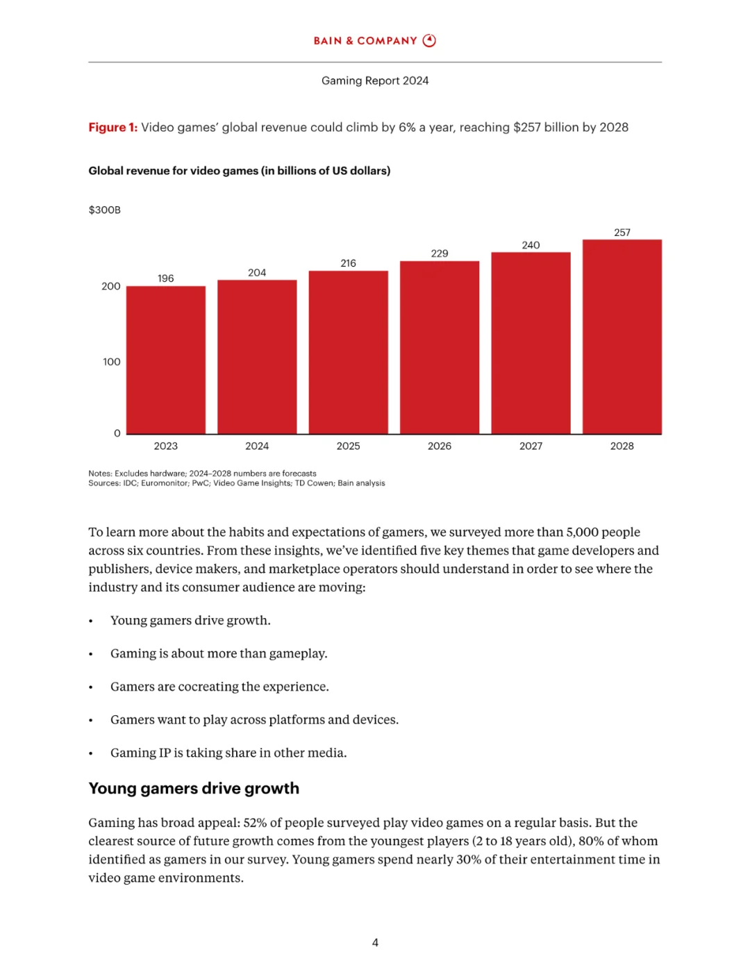 📈 预计到2028年,这一数字将以每年6%的速度增长,达到2570亿美元。几乎80%的2至18岁年轻人都是玩家,他们将30%的娱乐时间用于游戏,这一趋势正在推动行业的增长。