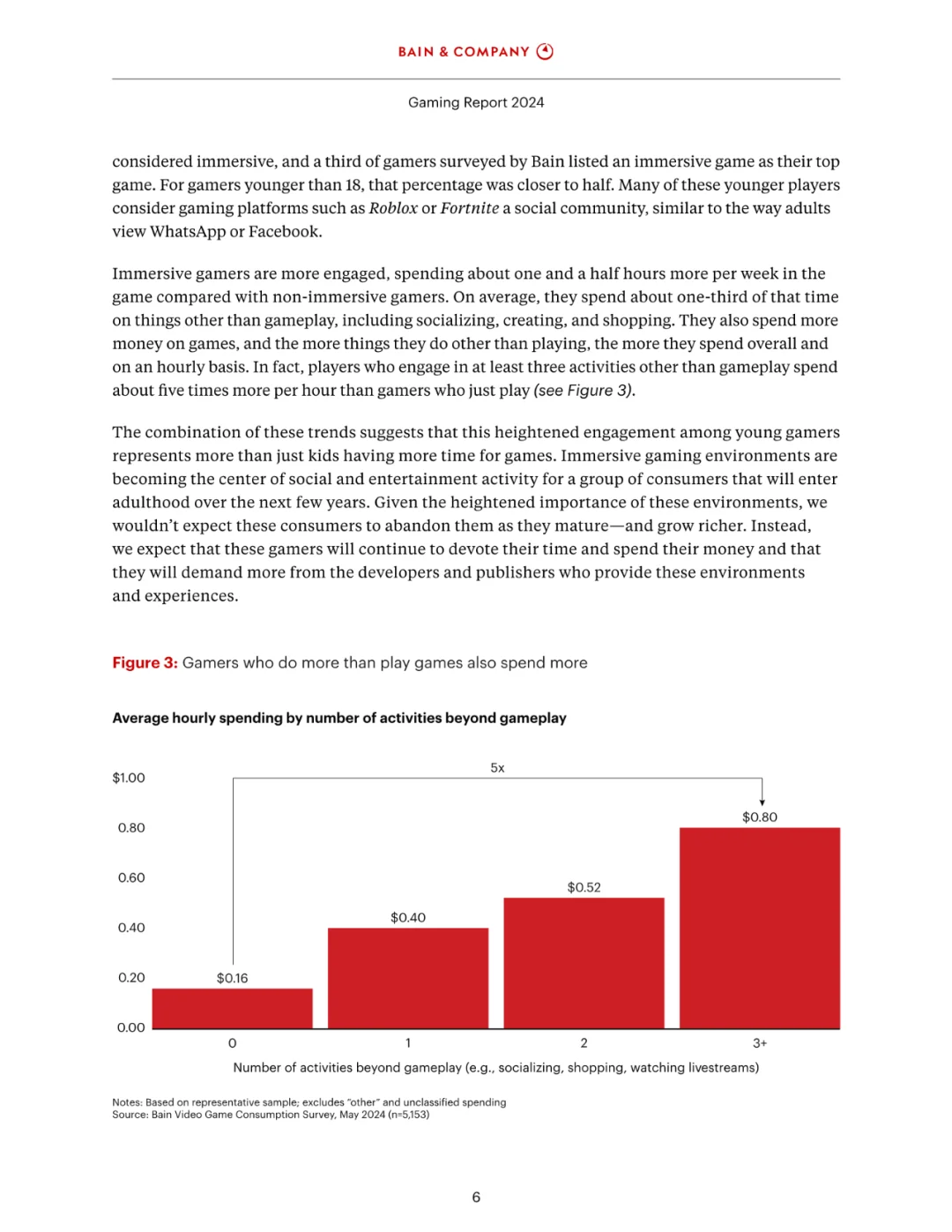 玩家们每周在游戏上花费的时间比非沉浸式游戏玩家多出一个半小时,而且他们在游戏内进行社交、创作和购物的时间占到了三分之一。
