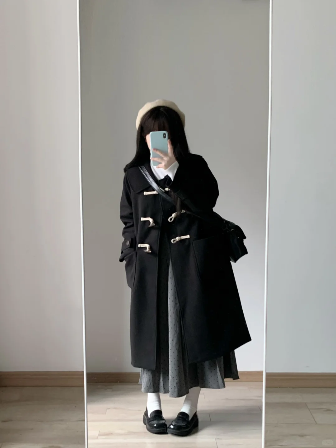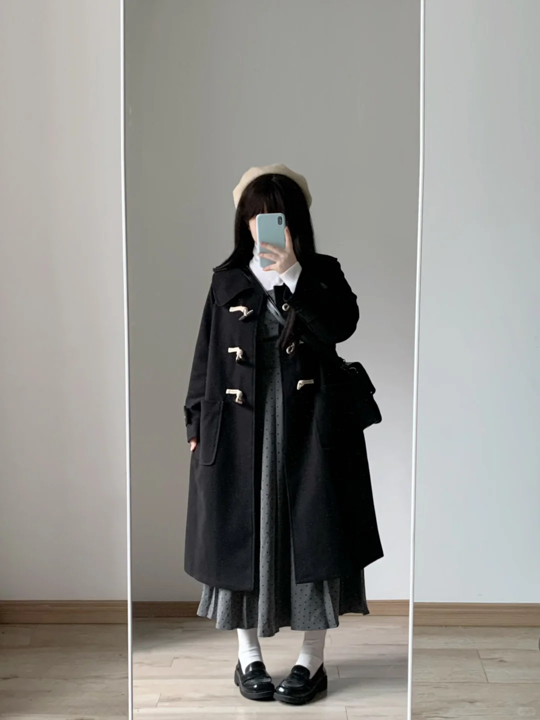 记录吧就现在 牛角扣大衣 秋冬氛围感 黑色大衣 娃娃领大衣 甜妹穿搭 微胖穿搭 少女感 少女感穿搭