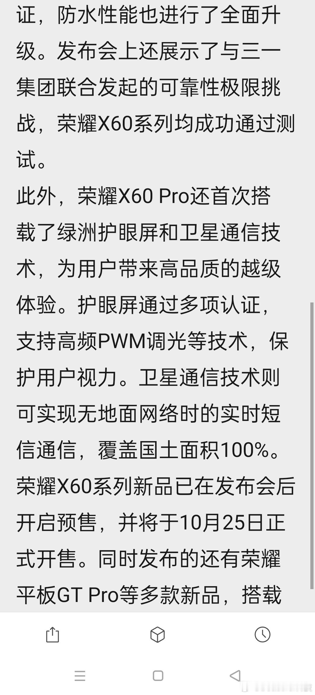 荣耀X60系列新品已在发布会后开启预售,并将于10月25日正式开售。同时发布的还有荣耀平板GT Pro等多款新品,搭载领先配置,提供旗舰级体验。