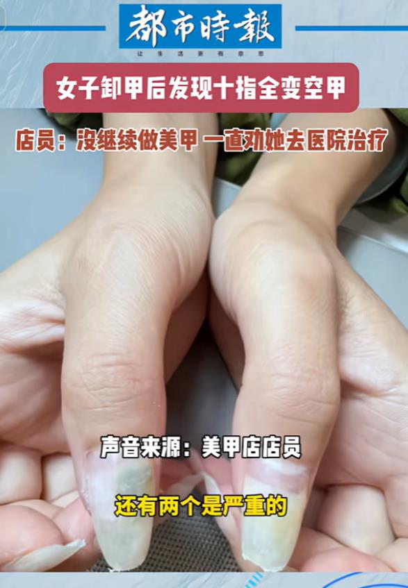 (来源:河南都市频道2024年10月17日关于《女生做美甲时,卸掉原美甲,发现十个指空甲,疑似感染绿脓杆菌。店家:没敢继续给她做》的报道)