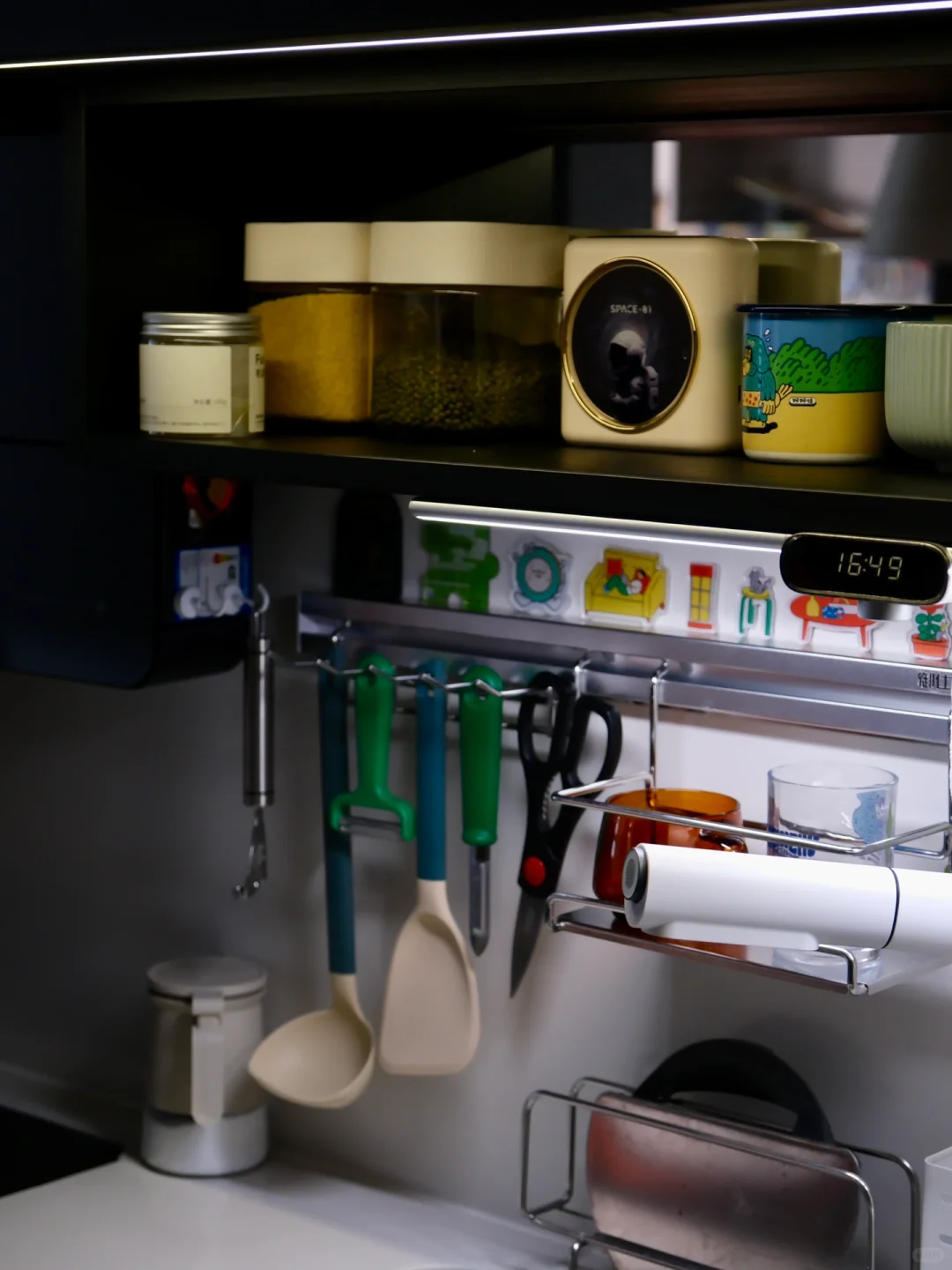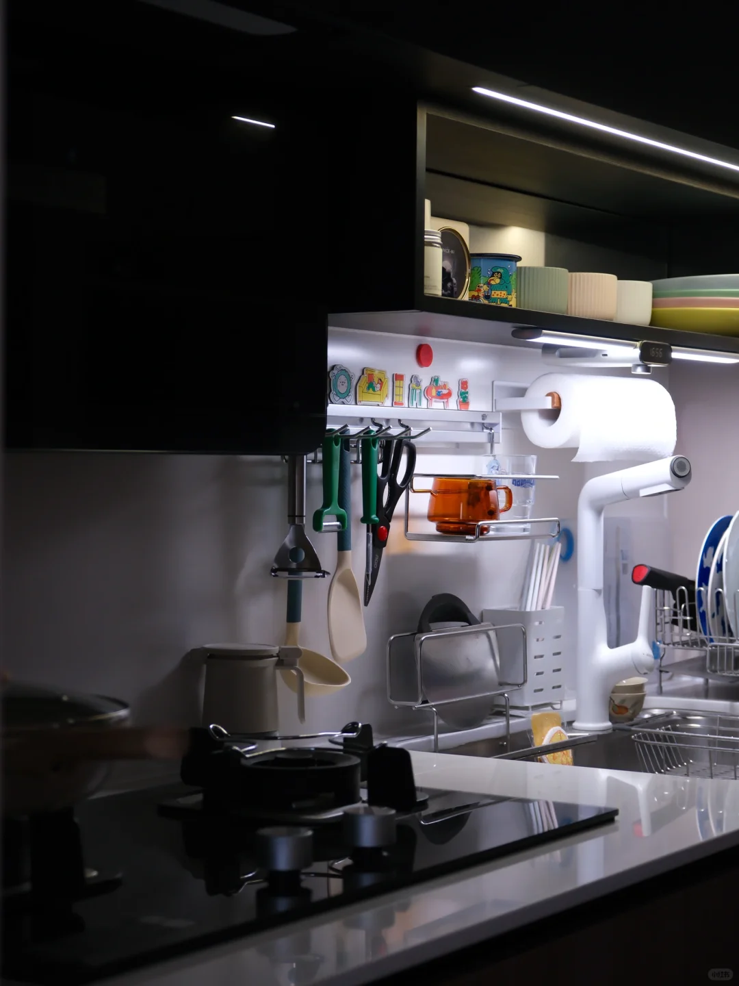 小户型没有专门的厨房空间,2米的台面就是所有,厨房虽小,需要的东西一点也不少,能上墙的都上墙,榨干每一寸空间。