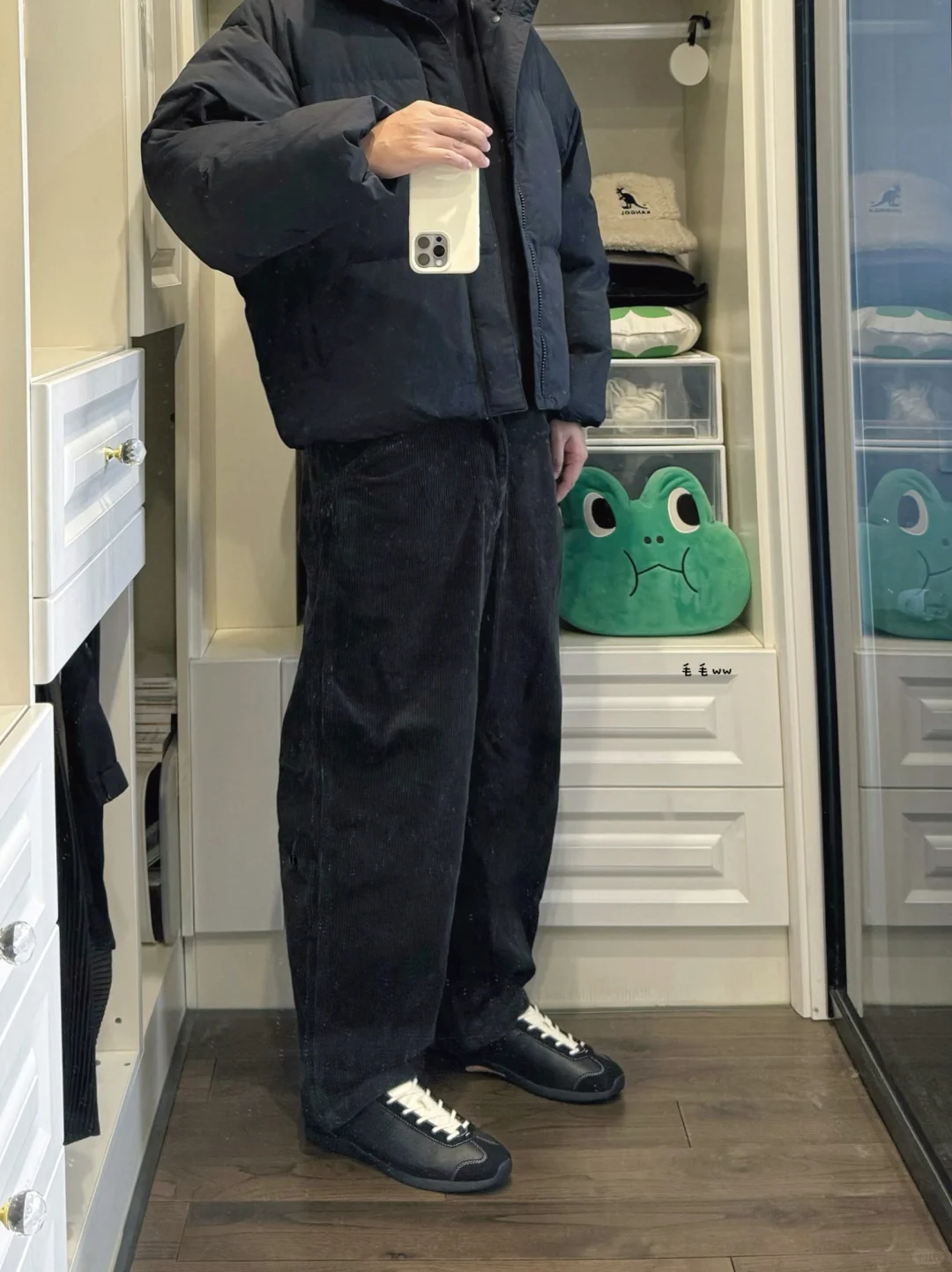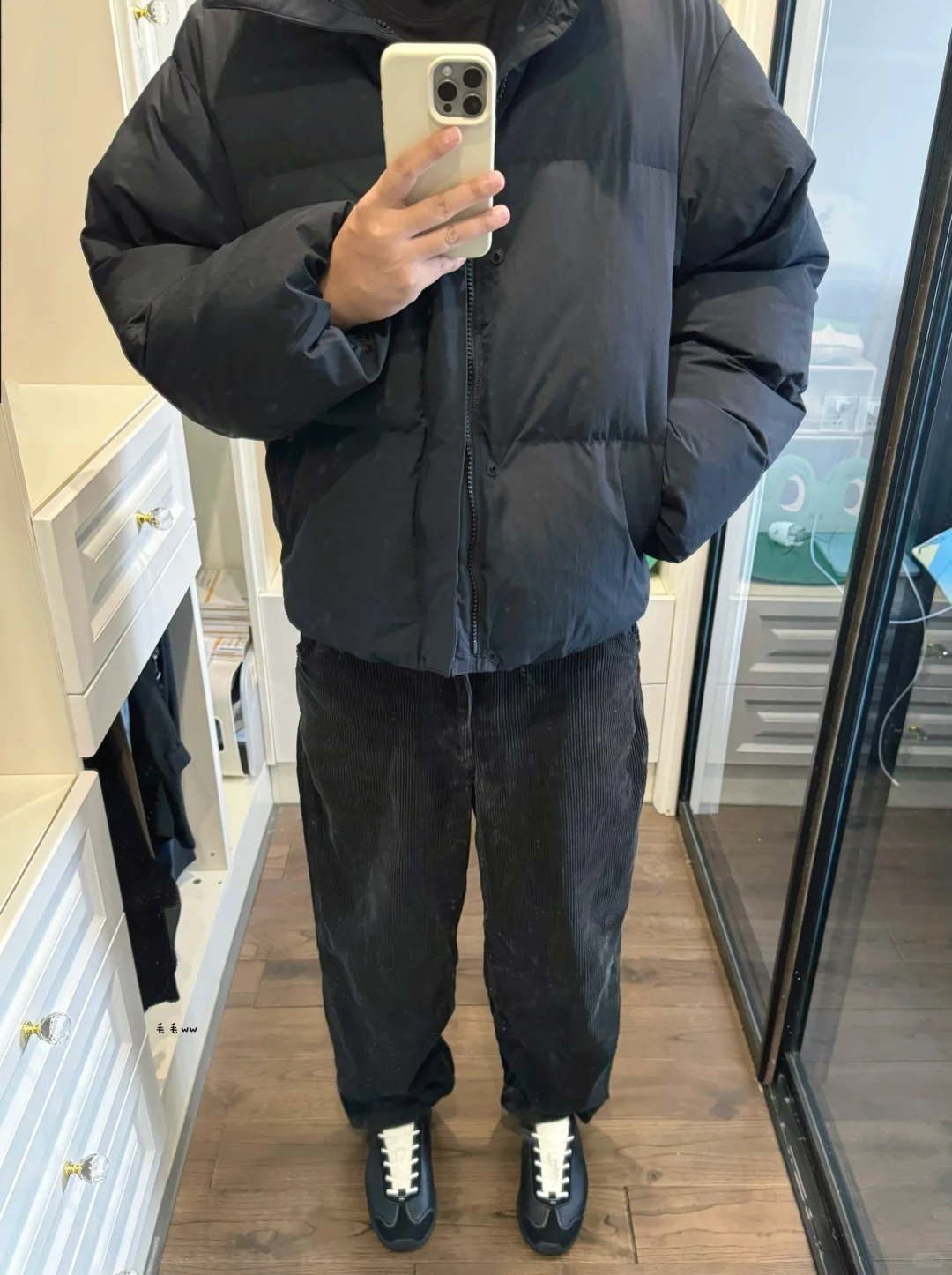 -刚更完新一季U的穿搭合集,忍不住又把去年款拿出来搭配,同样是空气棉服与灯芯绒的组合 . -短宽版型在黑色系加持下,真是又高又瘦,再来一双德训鞋,整体观感chill,不像球鞋那么硬核 . —————— . ✏️本人178cm75kg 球鞋尺码265mm(正常EU42) . 💭以上均为我个人观点,不喜勿喷,欢迎讨论
