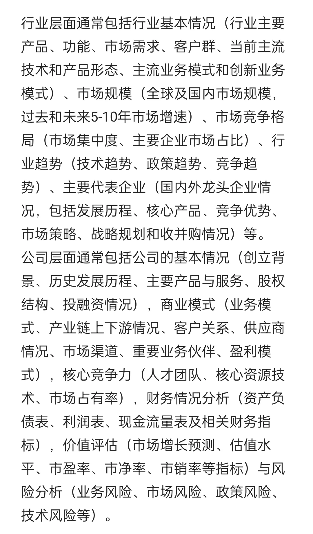 [向右R]PE行研通常更加关注所研究的行业赛道是否具有增长潜力,是否值得投资,有哪些被低估的可以介入的投资标的,这项标的的质量情况如何,如果值得投资的话以什么样的价格什么样的交易手段合适,以及之后在什么样的情况下需要处置退出,往往更加关注的是为投资决策和确保投资收益提供依据,因此更多只关注行业和标的本身。
