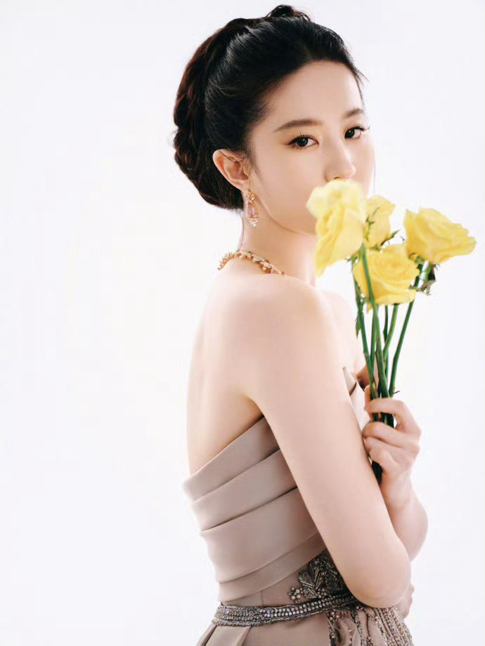 刘亦菲这一身衣服太丑了,用花挡住了才觉得好一点,全靠脸撑着