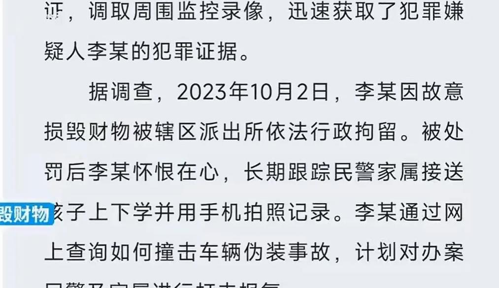 陕西榆林,男子违法被依法处罚后,对办案民警怀恨在心,长期跟踪民警家属接送孩子上下学,并拍照记录。时机成熟后,男子为报复民警,故意开车撞击民警家属车辆,企图伪装成交通事故。仇恨的种子一旦发芽,如同决堤的洪水,一发不可收拾。